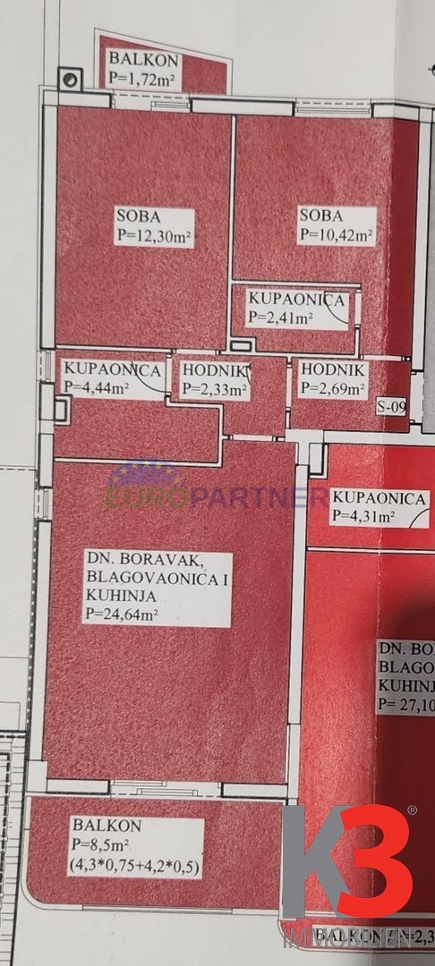 Es befindet sich im 3. Stock und hat eine Fläche von 89 m2. Es besteht aus einer Küche mit Esszimmer, einem gemütlichen Wohnzimmer, zwei Schlafzimmern (eines mit eigenem Bad), einem Badezimmer mit Toilette, einem Balkon, einem Abstellraum und einem Parkplatz.