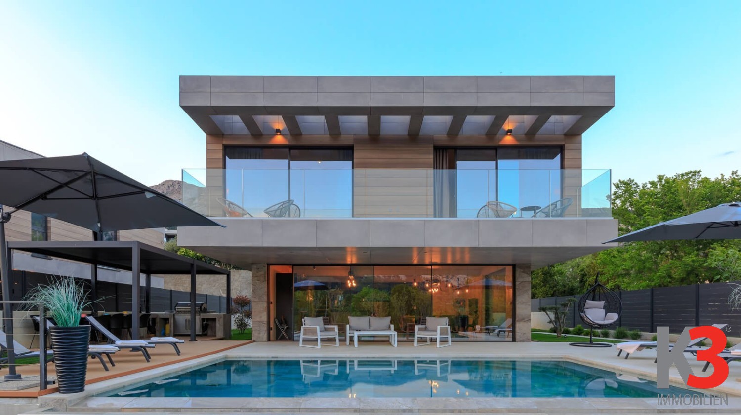Eine Luxusvilla mit einer Fläche von 280 m² steht zum Verkauf, nur 500 Meter vom Meer entfernt in Baška auf der Insel Krk gelegen. Die Villa erstreckt sich über 2 Etagen und befindet sich auf einem 500 m² großen Grundstück. Sie verfügt über 4 Schlafzimmer mit eigenen Badezimmern, ein geräumiges Wohnzimmer, eine voll ausgestattete Küche und einen Raum mit Sauna und Whirlpool sowie ein Billardzimmer im angrenzenden Raum.