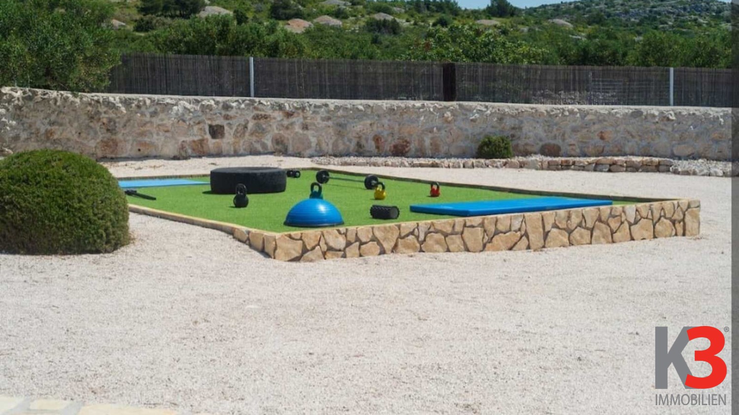 Dieser wunderschöne Komplex bietet zahlreiche zusätzliche Annehmlichkeiten wie ein Jacuzzi, einen Tennisplatz, ein Basketballfeld, ein Fußballfeld, Minigolf, Billard, einen Spielplatz und einen Weinkeller.