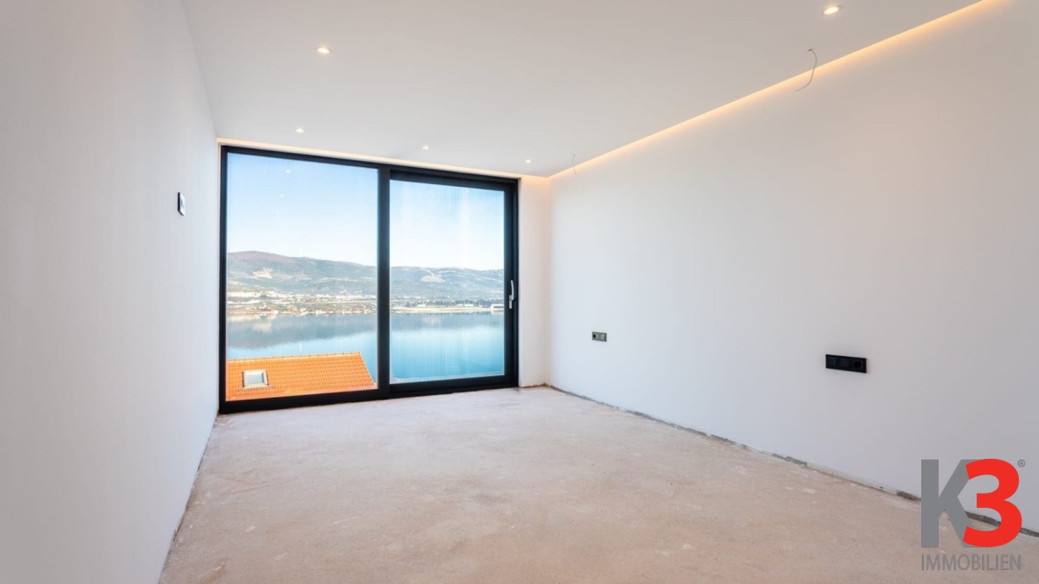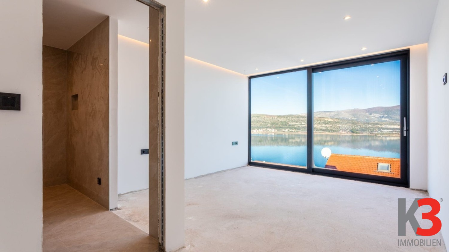 Im Obergeschoss liegen drei komfortable Schlafzimmer, jeweils mit eigenem Badezimmer, sowie ein zusätzlicher Raum, der als Spielzimmer oder Lounge vorgesehen ist. Dank der großflächigen Verglasung bieten alle Zimmer einen beeindruckenden Meerblick und viel Tageslicht, was ein Gefühl von Weite und Eleganz schafft.