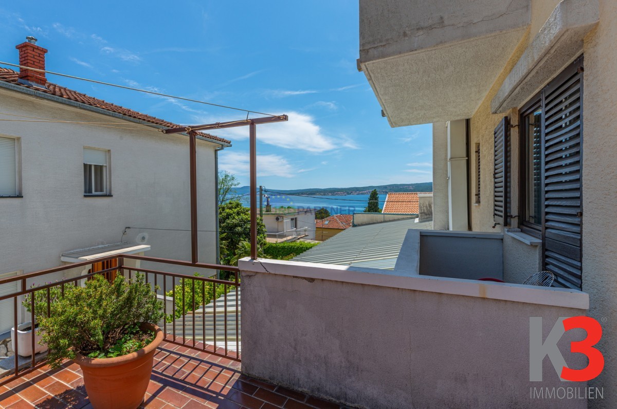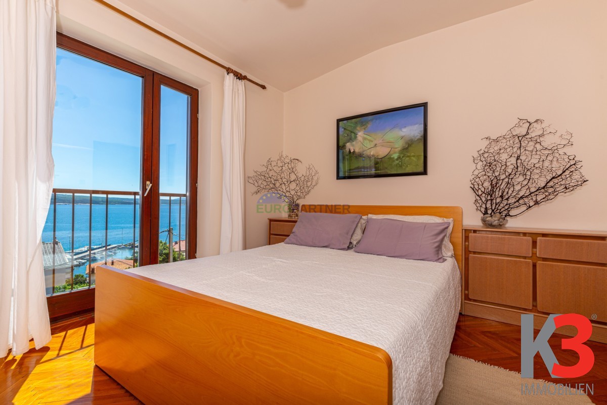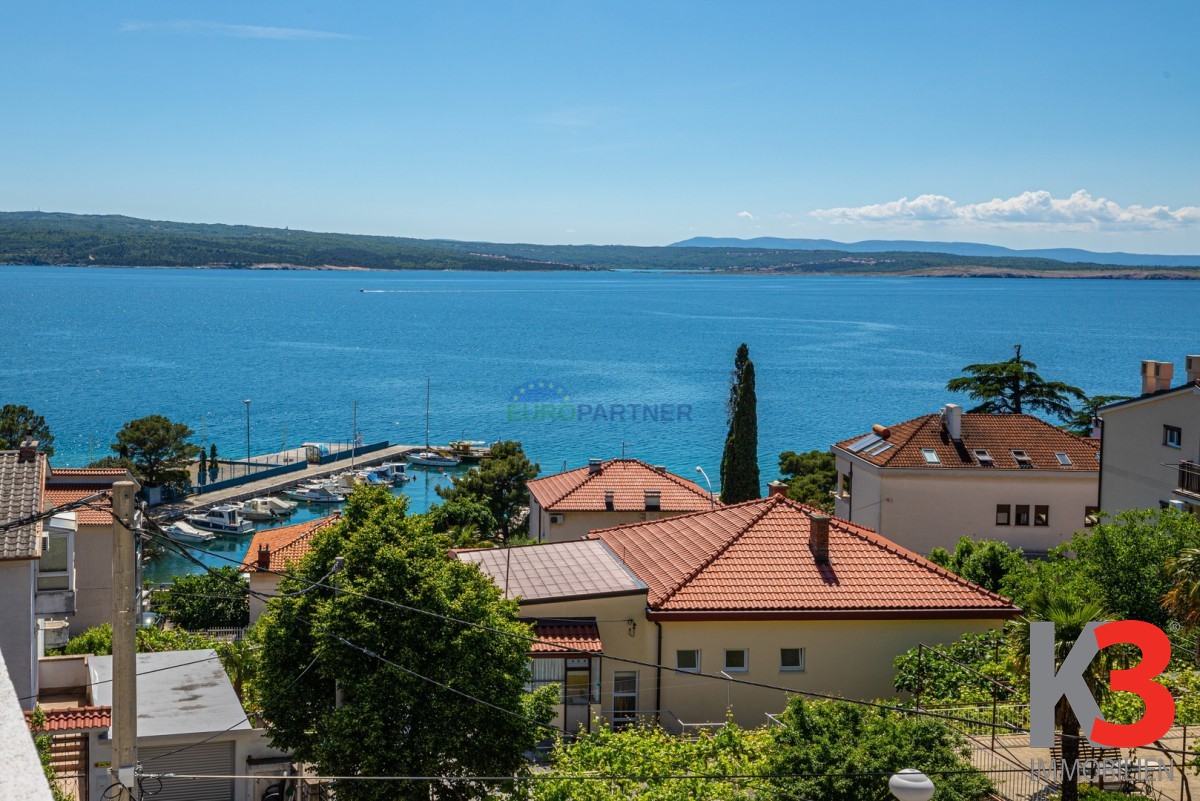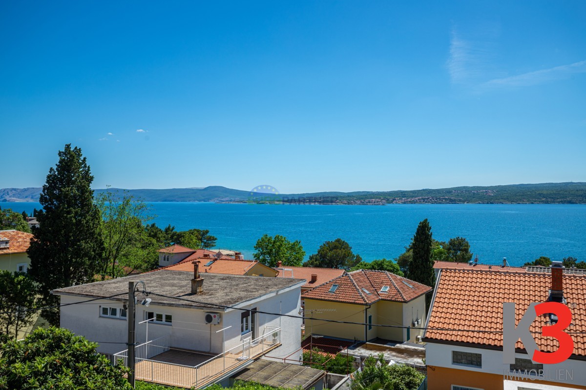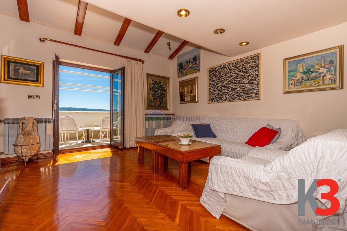 Im 1. Stock befindet sich eine Wohnung von 110 m2 mit einer großen Terrasse (ca. 90 m2) und einem wunderschönen Blick auf das Meer und die Insel Krk. Die Wohnung wurde 2018. komplett renoviert. Auf der Vorderseite befindet sich ein großes Wohnzimmer mit neuen Zimmern und einem Badezimmer, und auf der Rückseite des Zimmers befindet sich ein großes Badezimmer.