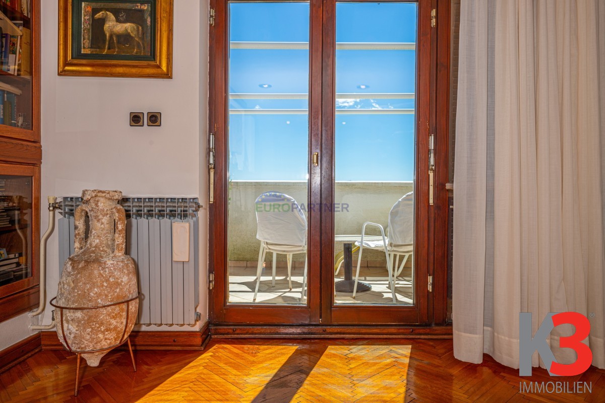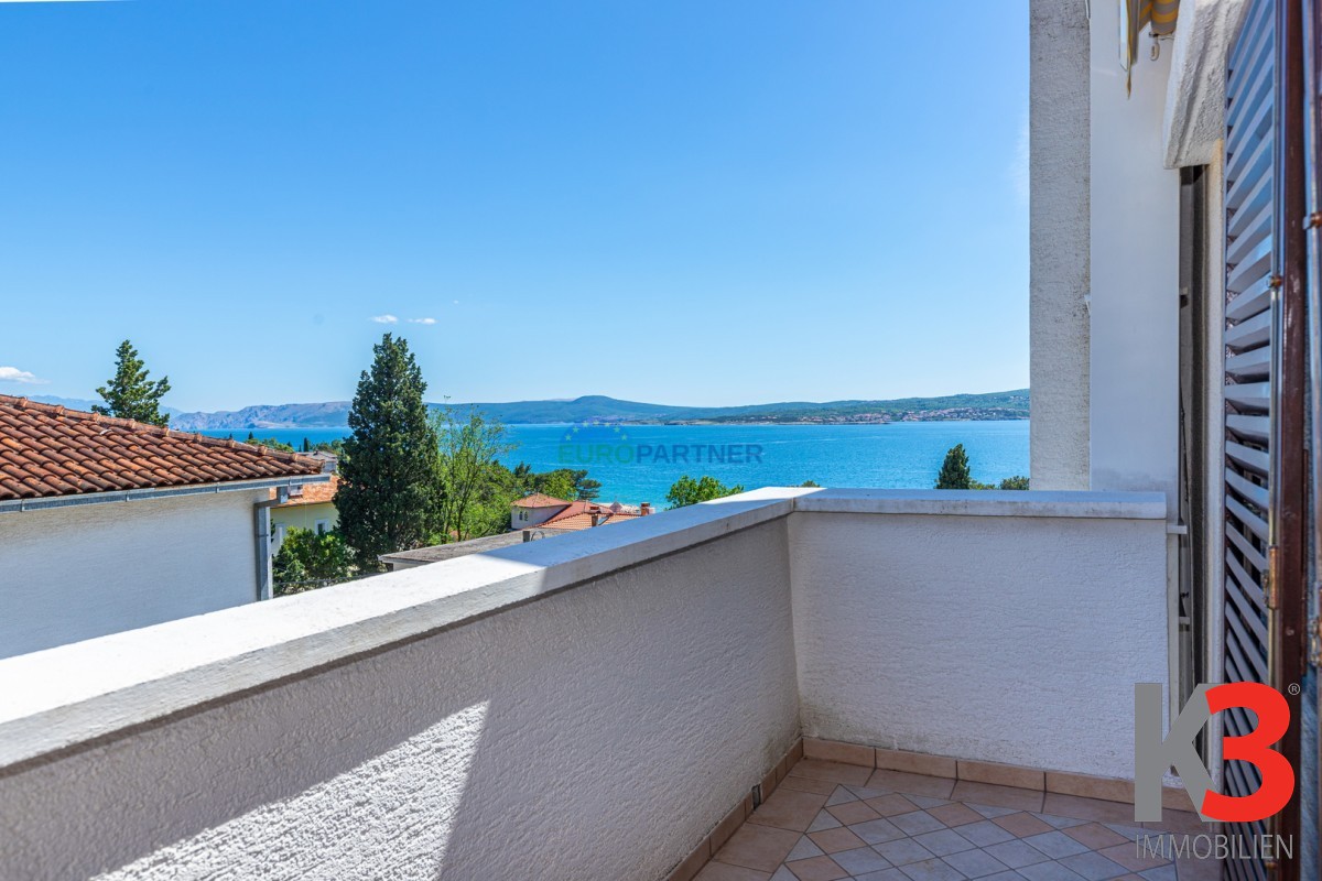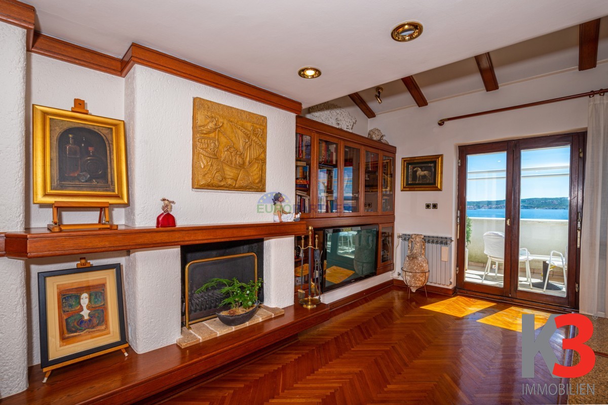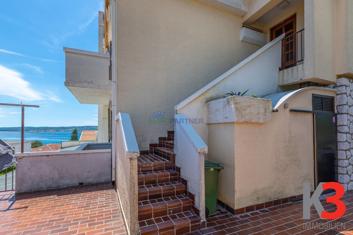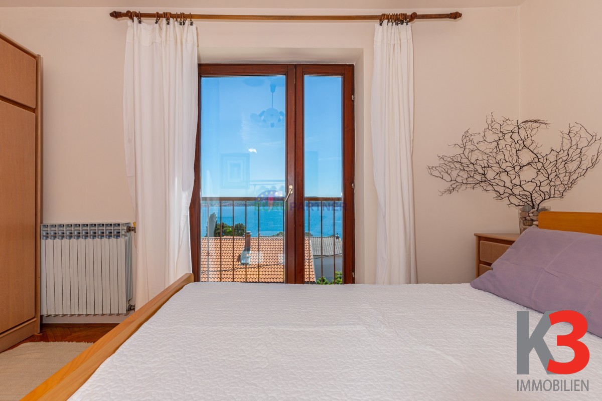 Im 1. Stock befindet sich eine Wohnung von 110 m2 mit einer großen Terrasse (ca. 90 m2) und einem wunderschönen Blick auf das Meer und die Insel Krk. Die Wohnung wurde 2018. komplett renoviert. Auf der Vorderseite befindet sich ein großes Wohnzimmer mit neuen Zimmern und einem Badezimmer, und auf der Rückseite des Zimmers befindet sich ein großes Badezimmer.