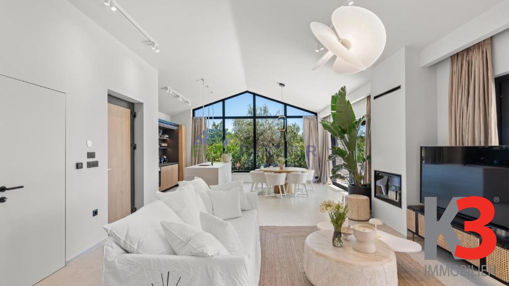 viel Liebe und Stil. Die Küche ist von höchster Qualität und kann geschlossen und somit unsichtbar gemacht werden. Ein runder Tisch mit weißen Sesseln verleiht dem Raum Luxus und Eleganz und ist ein idealer Ort zum Essen. Darunter befinden sich im Open-Space-Konzept weiße Sofas, die dem Raum zusätzliche Raffinesse verleihen. Vor den Sofas befindet sich zudem ein Kamin, der in den Wintermonaten für eine romantische Atmosphäre sorgt.