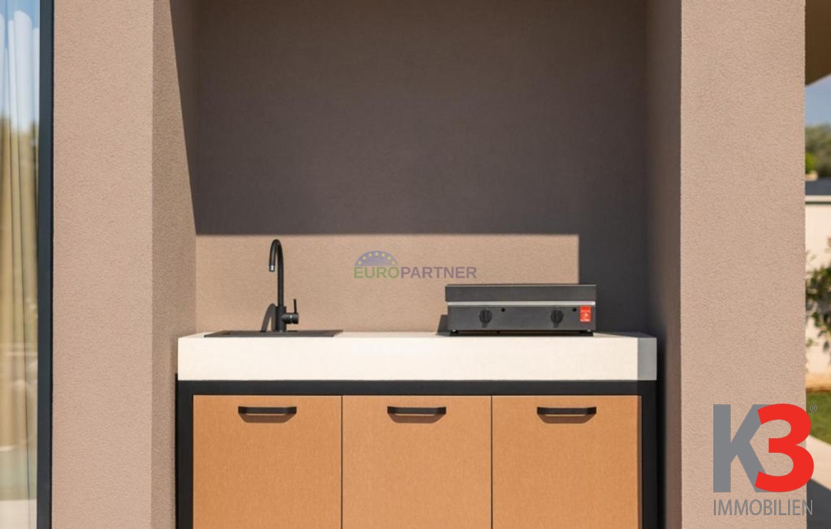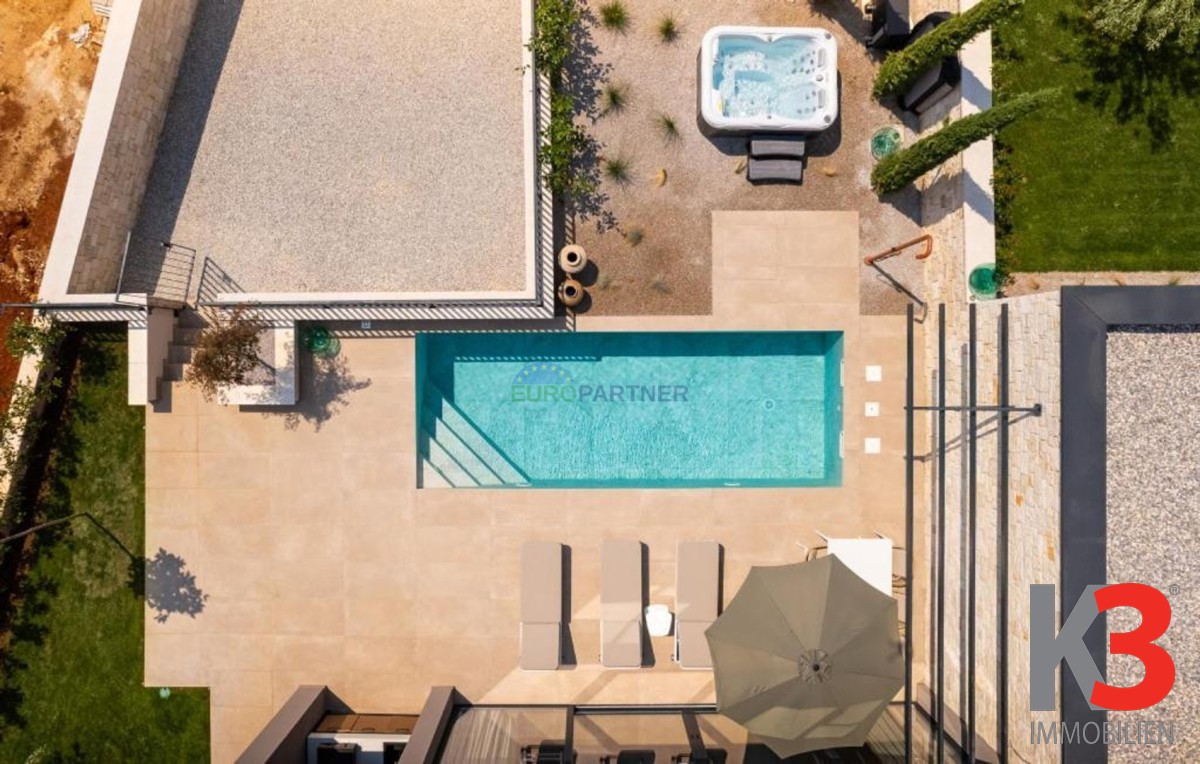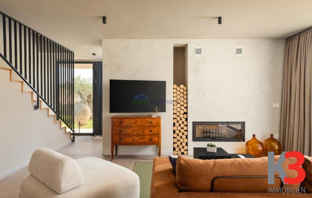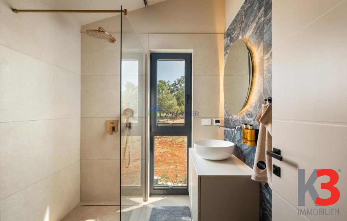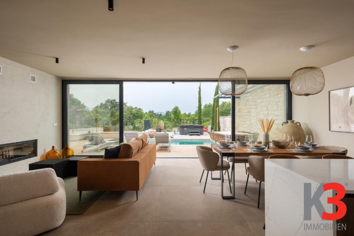 Es ist eine ungeschriebene Regel, dass moderne Villen ein Flachdach und Fassaden mit einer minimalistischen Farb- und Materialpalette haben sollten, die alle in reine Geometrie integriert sind. Somit strahlt diese Villa durch ihre architektonische Gestaltung Eleganz aus. Es zeichnet sich durch ein modernes Design aus klaren Geradlinigkeiten und offenen Räumen sowie einer Vielzahl eingebauter Glaselemente aus, die den Innenraum mit dem Außenbereich optisch verbinden und so ein einzigartiges Ganzes schaffen. Lassen Sie sich von der modernen Architektur der Villa in Kombination mit Steinelementen, die charakteristisch für Istrien sind, begeistern.