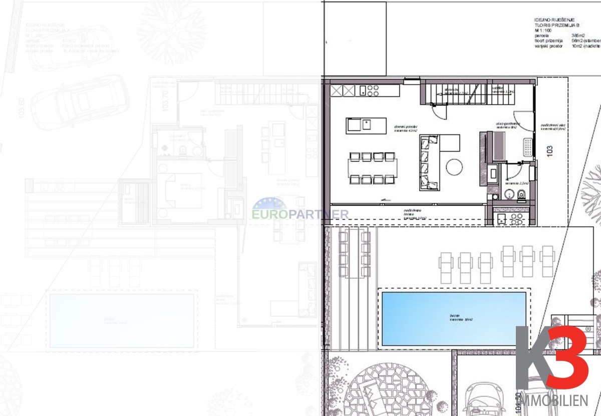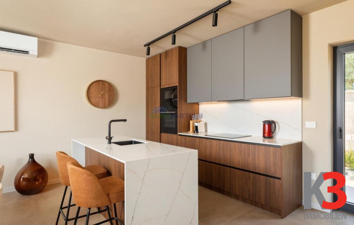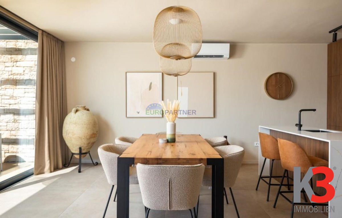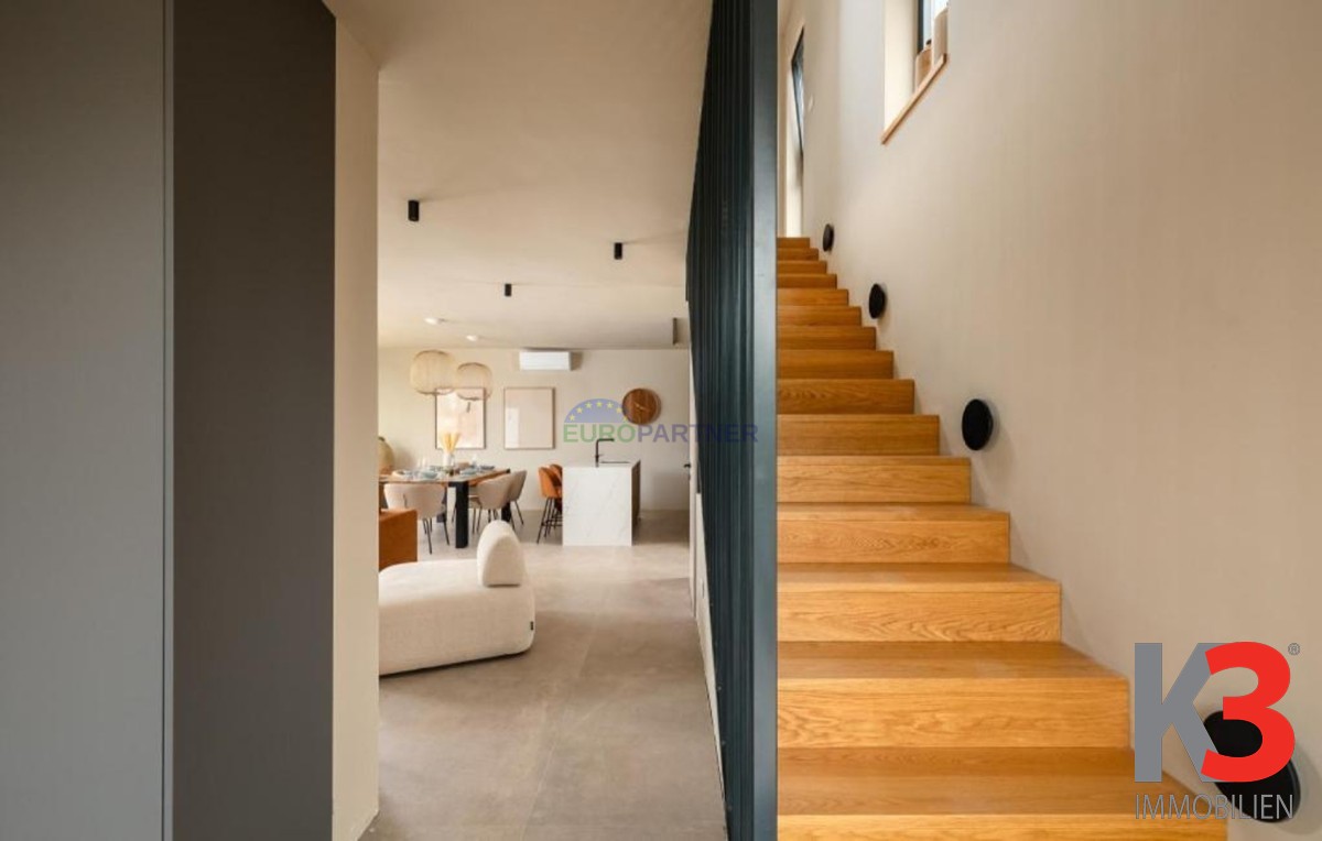 Es ist eine ungeschriebene Regel, dass moderne Villen ein Flachdach und Fassaden mit einer minimalistischen Farb- und Materialpalette haben sollten, die alle in reine Geometrie integriert sind. Somit strahlt diese Villa durch ihre architektonische Gestaltung Eleganz aus. Es zeichnet sich durch ein modernes Design aus klaren Geradlinigkeiten und offenen Räumen sowie einer Vielzahl eingebauter Glaselemente aus, die den Innenraum mit dem Außenbereich optisch verbinden und so ein einzigartiges Ganzes schaffen. Lassen Sie sich von der modernen Architektur der Villa in Kombination mit Steinelementen, die charakteristisch für Istrien sind, begeistern.