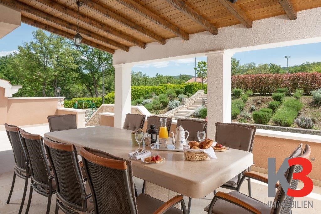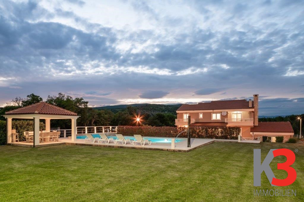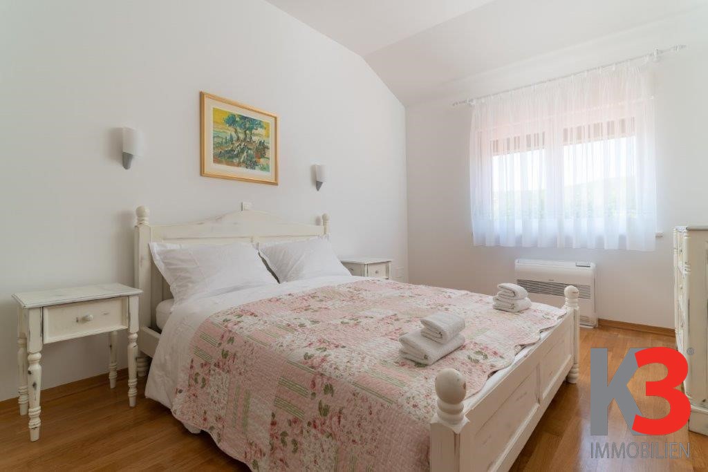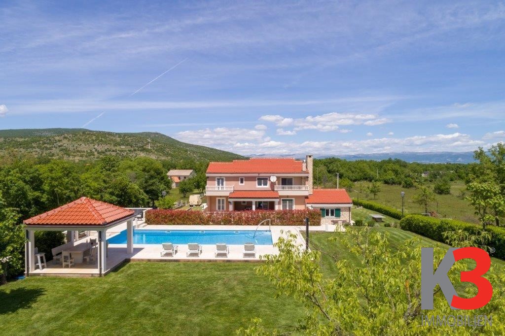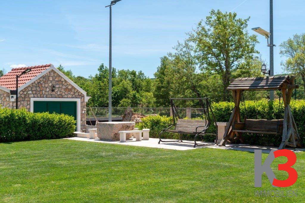 Ein Ferienhaus steht zum Verkauf, gelegen auf einem großen Anwesen in Dicmo. Dicmo ist ein charmantes Dorf im dalmatinischen Hinterland, gut mit Split verbunden und nur wenige Minuten von der Autobahn entfernt. Das Haus befindet sich auf einem außergewöhnlich großen Grundstück von 13.092 m², das vollständig eingezäunt ist und den Bewohnern Ruhe und Privatsphäre bietet. Das Haus wurde 2014 erbaut, hat eine Fläche von 270 m² und erstreckt sich über 3 Etagen. Es verfügt über 6 Schlafzimmer, 4 Badezimmer und 2 WCs. Vor dem Haus befindet sich ein großer Außenpool und eine überdachte Terrasse mit Esstisch, während auf der Rückseite ausreichend Parkplätze und eine Garage für 2 Autos vorhanden sind. Vor dem Pool gibt es auch einen Tennisplatz, und das Anwesen bietet genügend Platz für weitere Spielflächen, was Sportliebhaber begeistern wird.