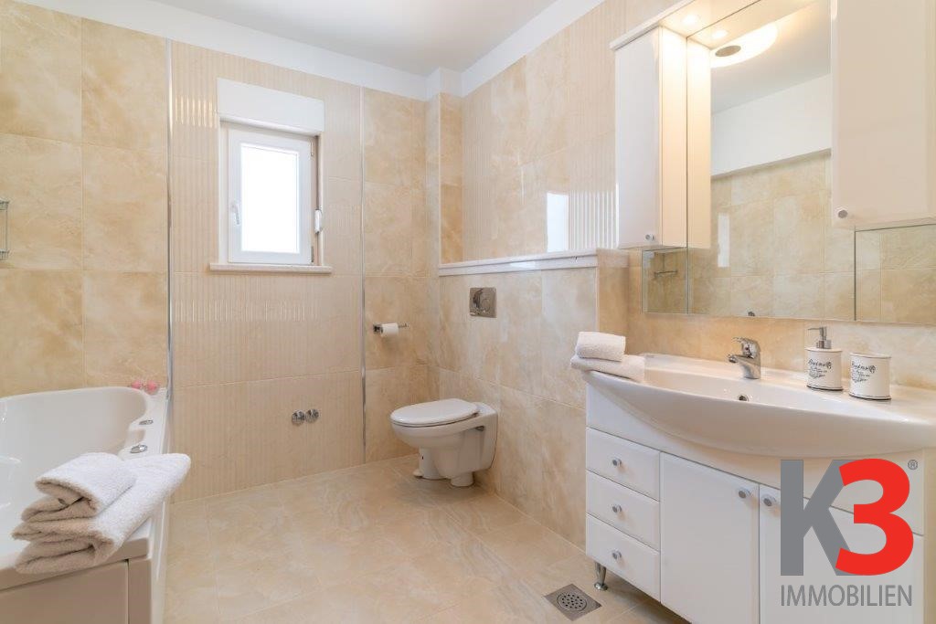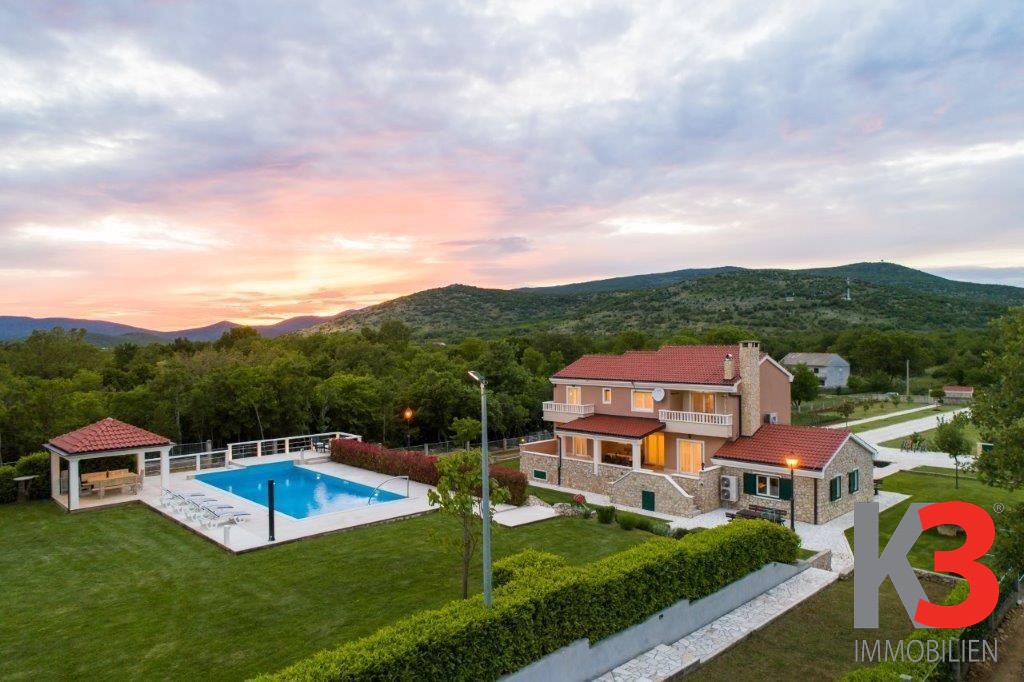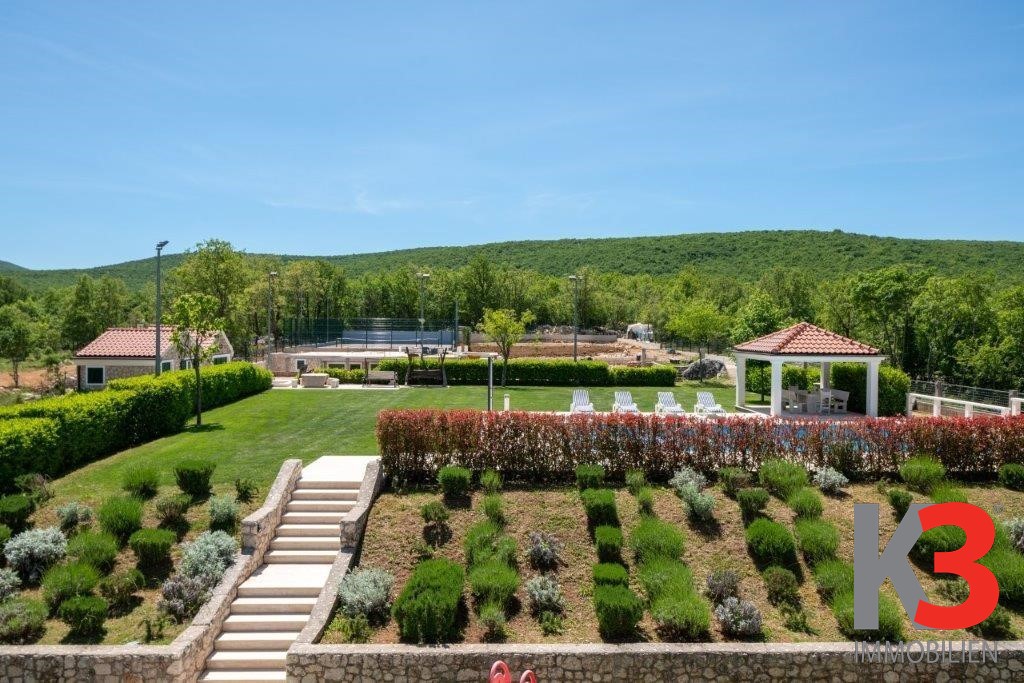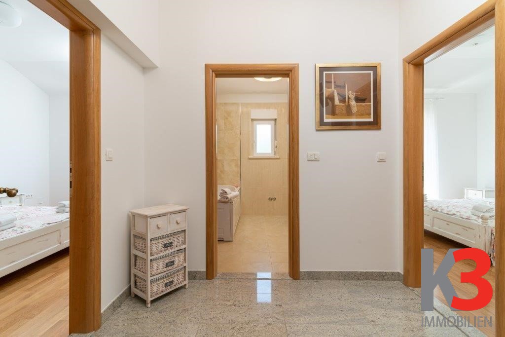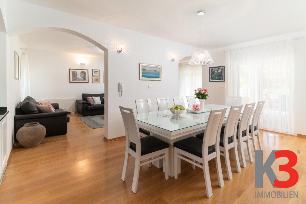 Ein Ferienhaus steht zum Verkauf, gelegen auf einem großen Anwesen in Dicmo. Dicmo ist ein charmantes Dorf im dalmatinischen Hinterland, gut mit Split verbunden und nur wenige Minuten von der Autobahn entfernt. Das Haus befindet sich auf einem außergewöhnlich großen Grundstück von 13.092 m², das vollständig eingezäunt ist und den Bewohnern Ruhe und Privatsphäre bietet. Das Haus wurde 2014 erbaut, hat eine Fläche von 270 m² und erstreckt sich über 3 Etagen. Es verfügt über 6 Schlafzimmer, 4 Badezimmer und 2 WCs. Vor dem Haus befindet sich ein großer Außenpool und eine überdachte Terrasse mit Esstisch, während auf der Rückseite ausreichend Parkplätze und eine Garage für 2 Autos vorhanden sind. Vor dem Pool gibt es auch einen Tennisplatz, und das Anwesen bietet genügend Platz für weitere Spielflächen, was Sportliebhaber begeistern wird.