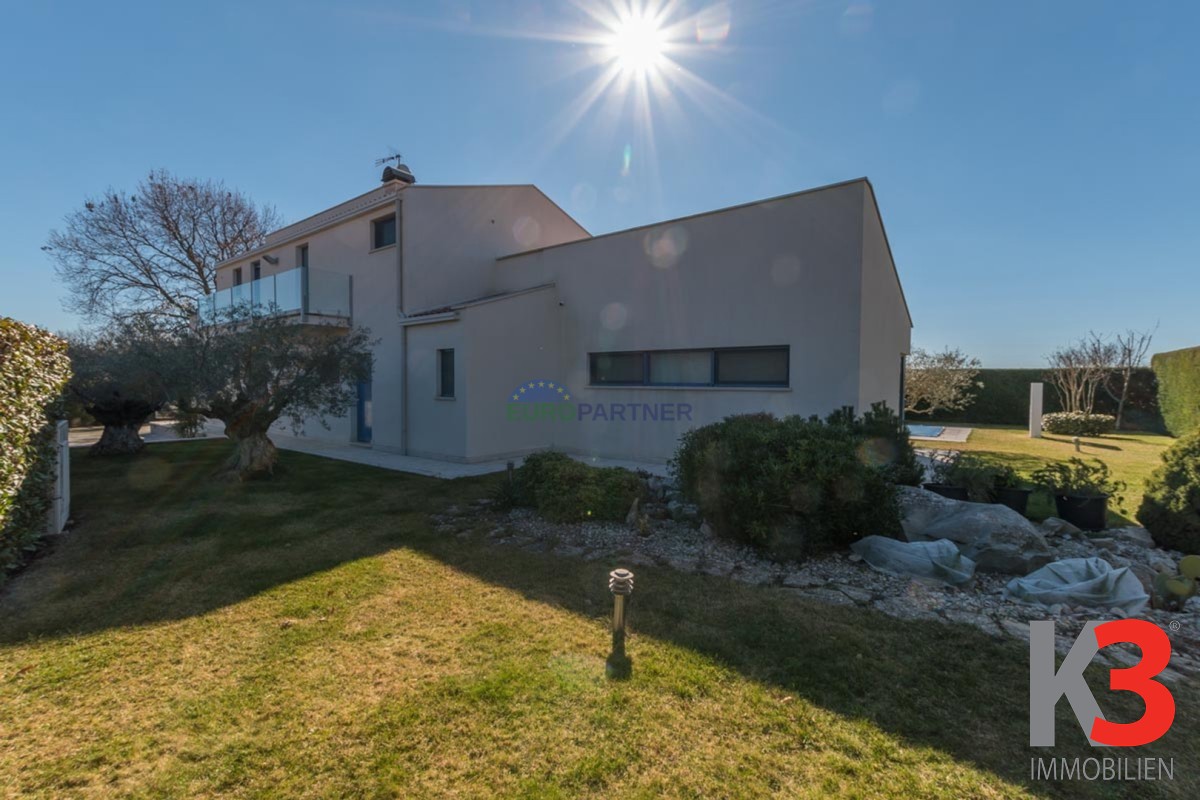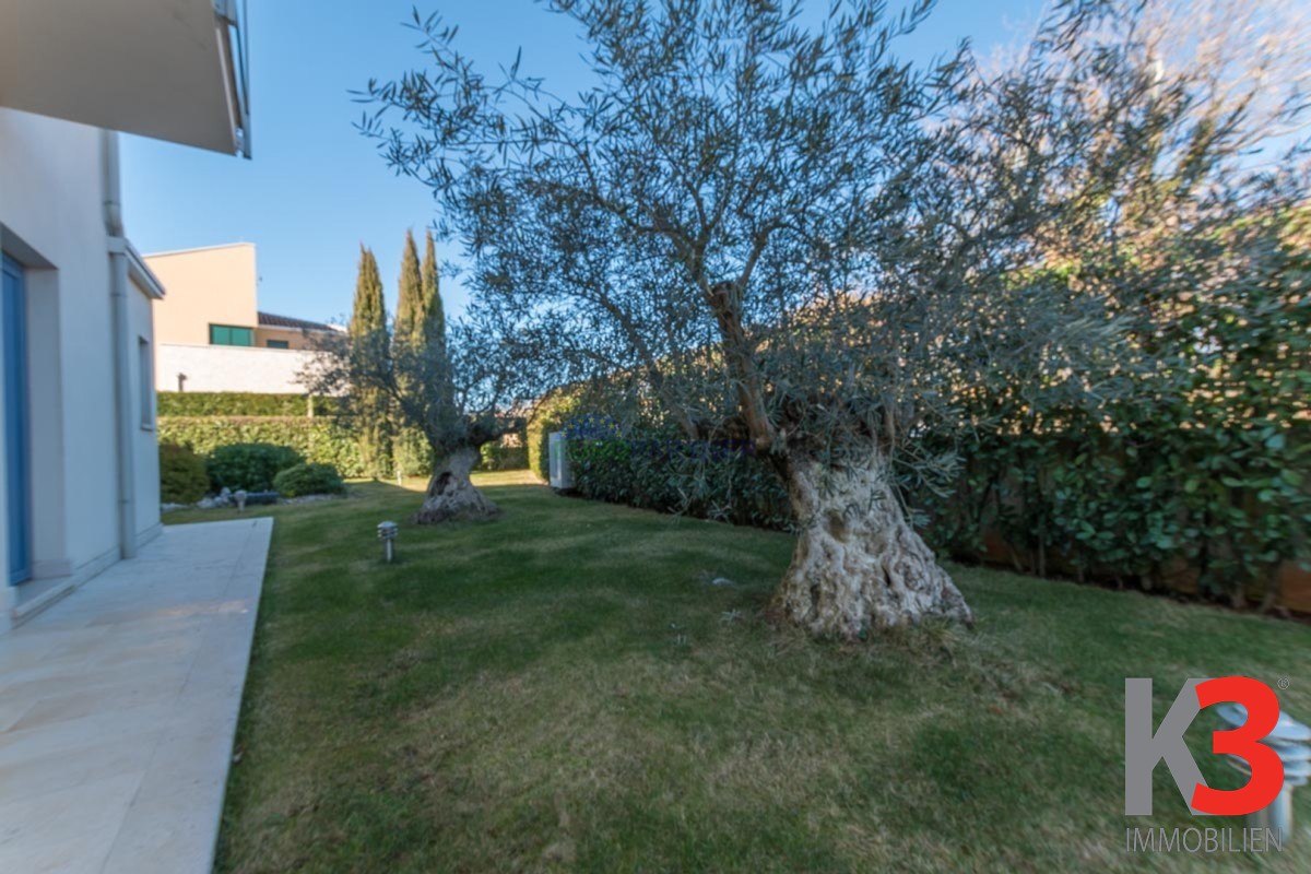 Der Garten vor dem Haus ist mit mediterranen Pflanzen angelegt und bepflanzt, und den zentralen Platz im Garten nimmt ein 40m2 großer Pool mit Sonnendeck ein, der einen perfekten Blick auf Natur und Grün bietet.