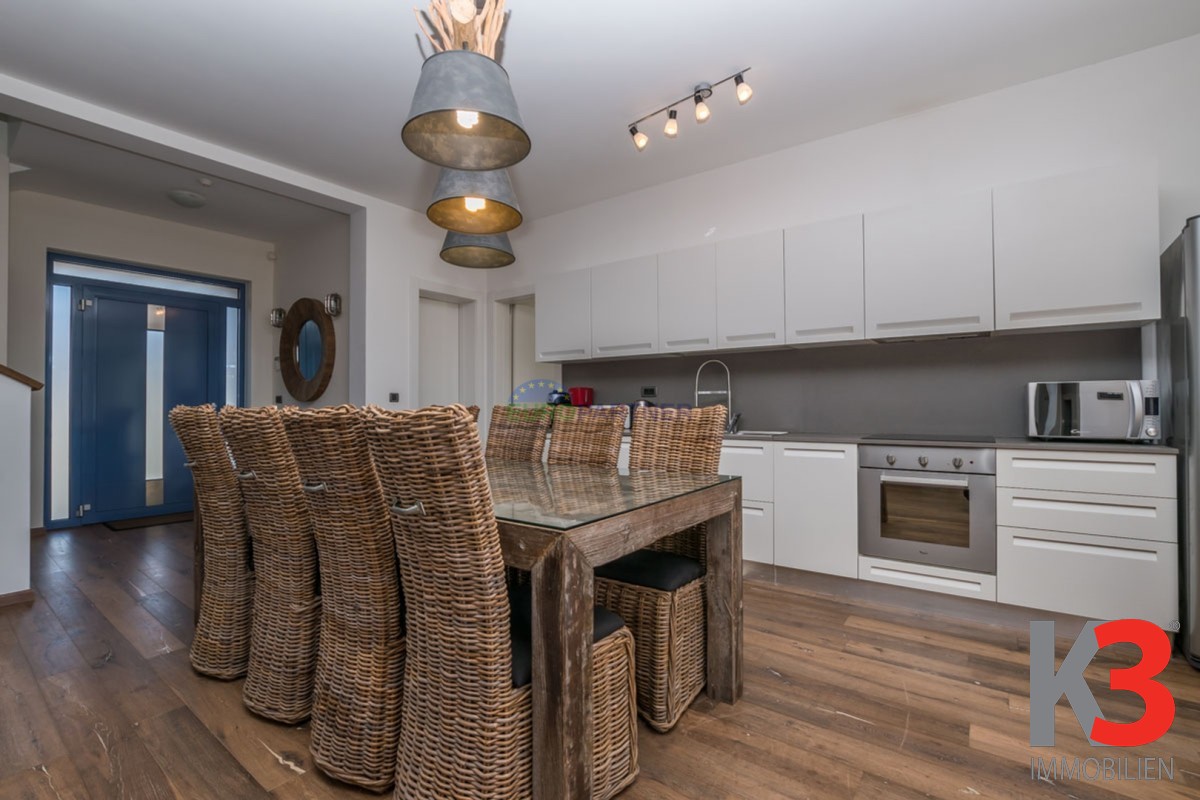 Im Erdgeschoss befindet sich eine mit dem Esszimmer verbundene Küche und ein großes Wohnzimmer nach dem Open-Space-Konzept. Viel Sonnenlicht dringt durch die großen Glasswände und bietet einen schönen Blick auf den Pool und Garten.