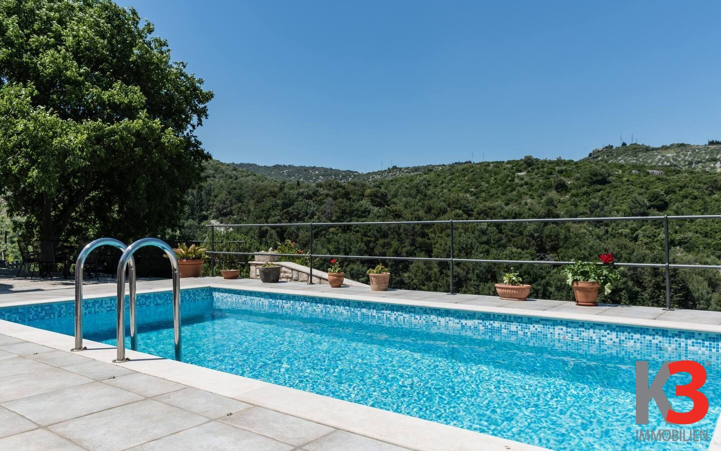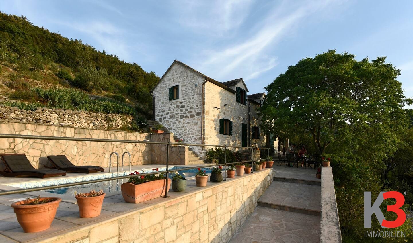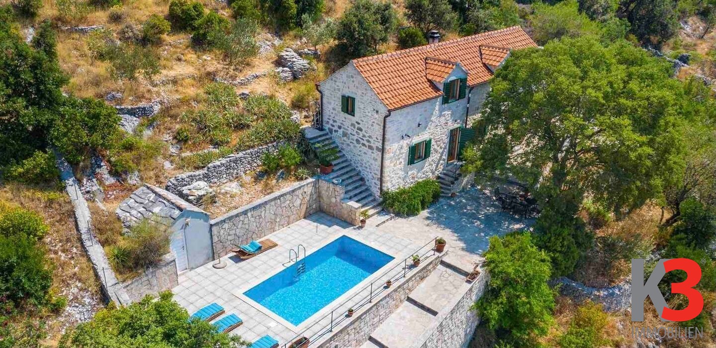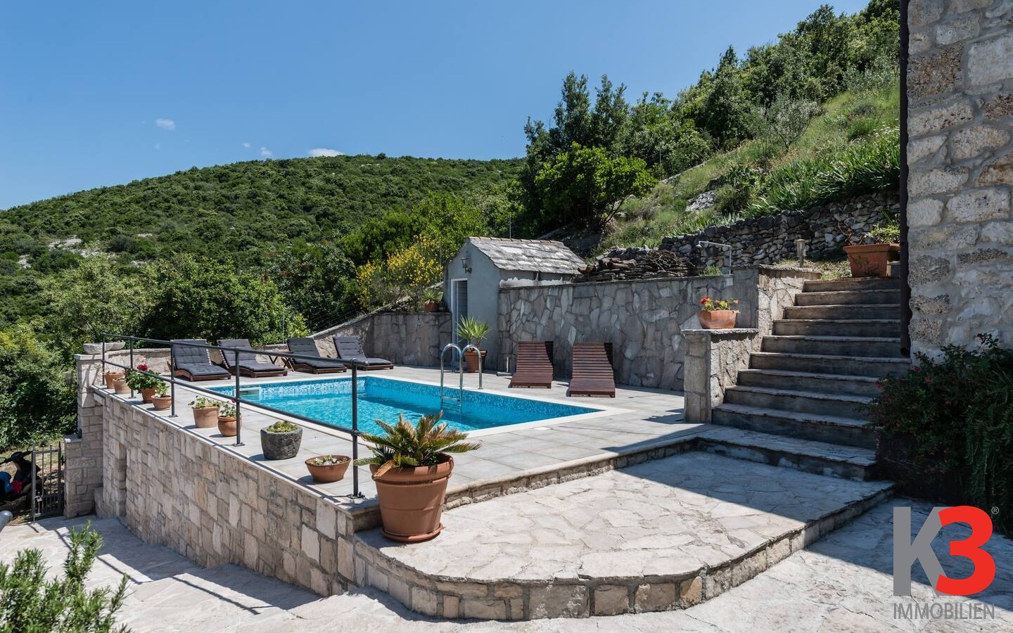 Das Innere besteht aus drei Schlafzimmern und zwei elegant gestalteten Badezimmern, und das gesamte Haus ist klimatisiert, um das ganze Jahr über Komfort zu gewährleisten. Die Renovierung wurde sorgfältig durchgeführt, mit besonderem Augenmerk auf die Erhaltung authentischer Steinelemente und die Schaffung einer Atmosphäre, die an traditionelle dalmatinische Häuser erinnert, jedoch in einem modernen Rahmen. Der Außenbereich verfügt über einen Pool von 18 m², ideal zur sommerlichen Erfrischung und Entspannung in völliger Privatsphäre.