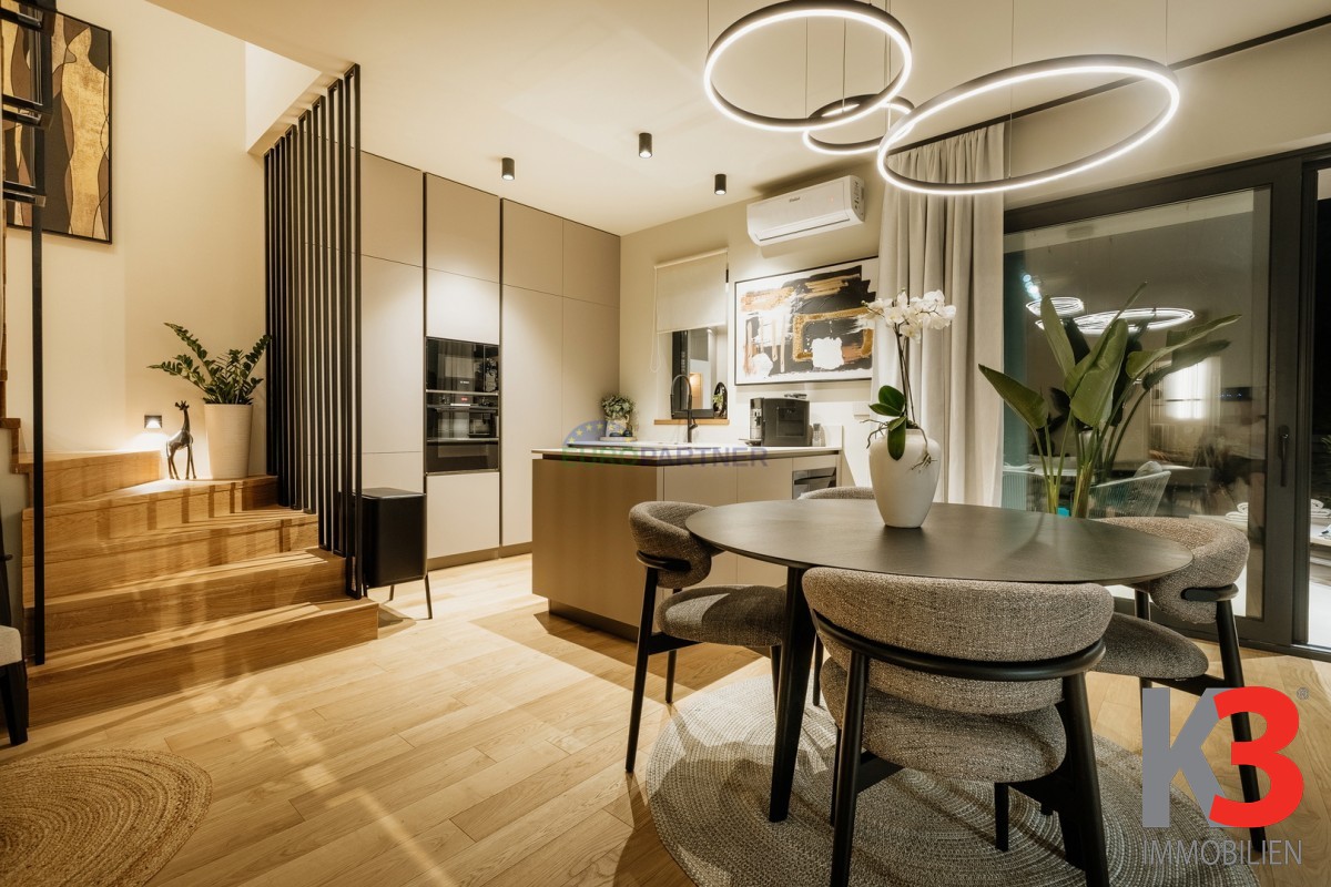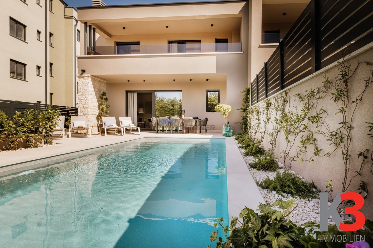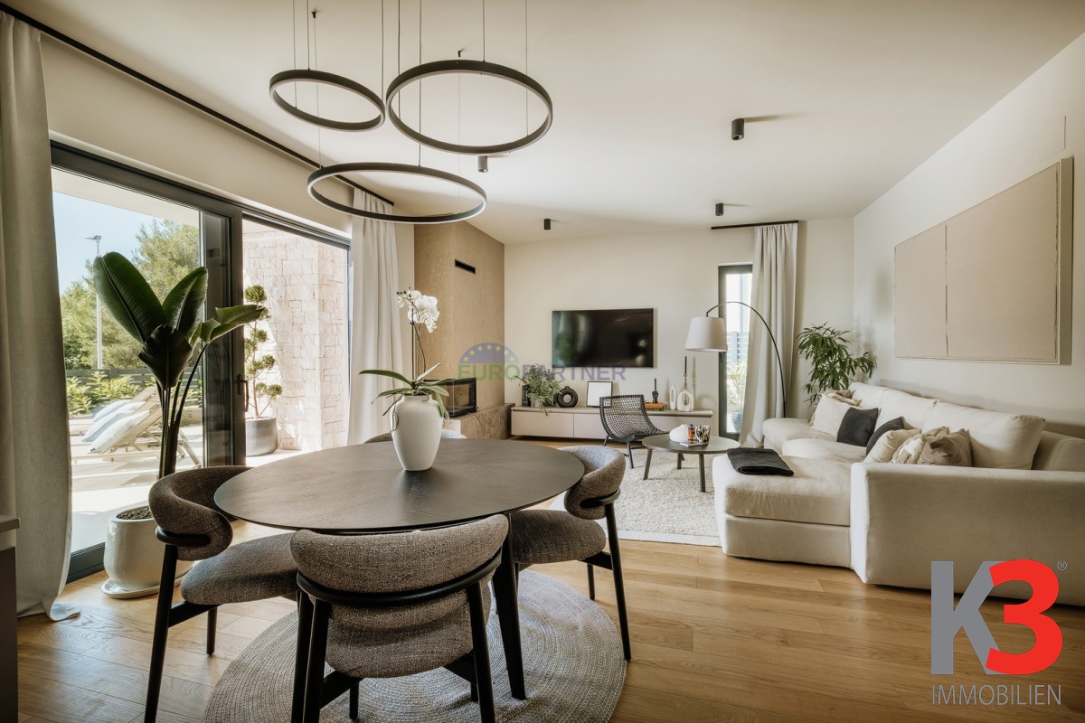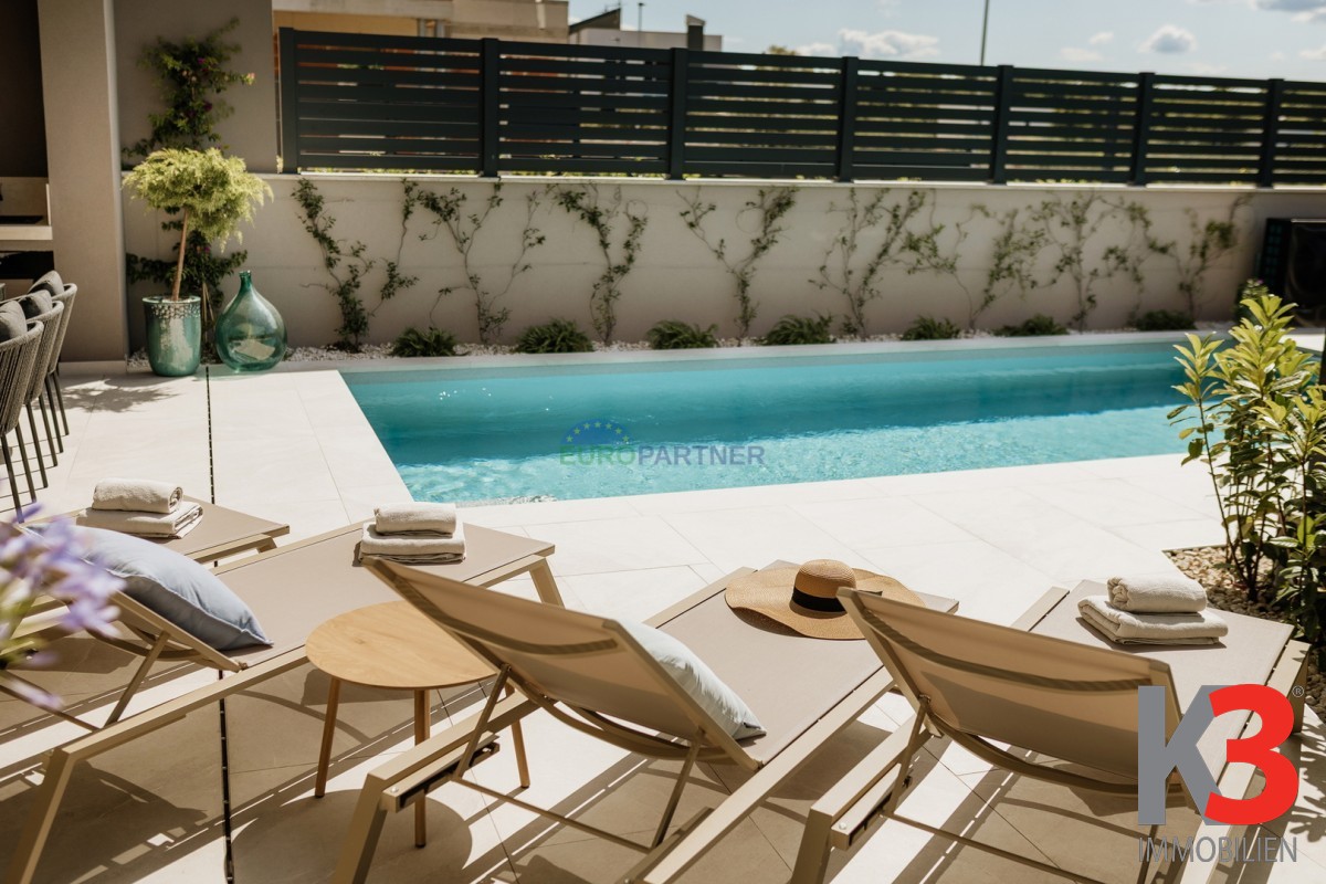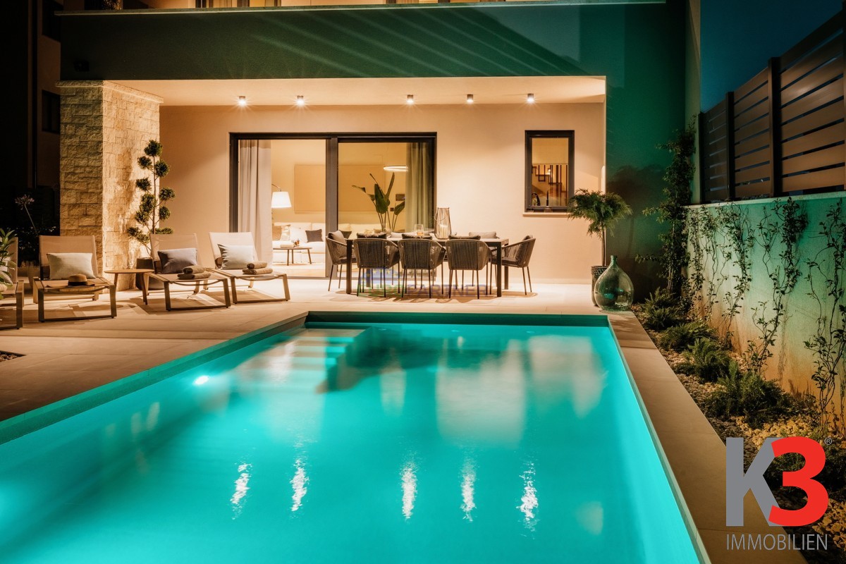Im Erdgeschoss befindet sich ein großzügiger, offener Wohnbereich, der mit der Küche und dem Esszimmer verbunden ist und einen warmen und harmonischen Raum für den Alltag und gesellige Momente schafft. Auf derselben Etage gibt es zudem ein Schlafzimmer, ein modernes Badezimmer sowie einen Technikraum. Vom Wohnzimmer aus gelangt man auf die überdachte Terrasse und die gepflegte Sonnenterrasse mit beheiztem Pool, wo sich auch eine Sommerküche befindet – ideal zum Entspannen an warmen Tagen und zum Genießen von Mahlzeiten im Freien.