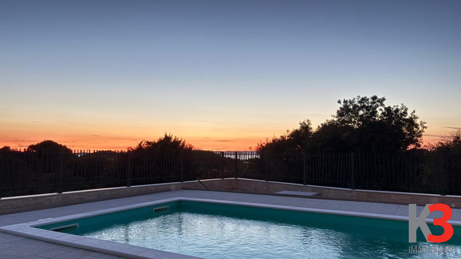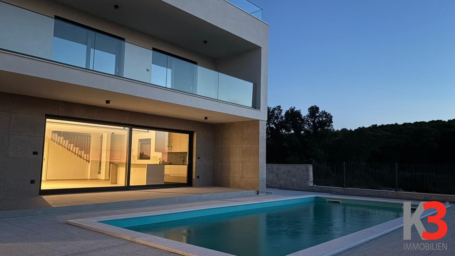 Im ruhigen dalmatinischen Ort Drage, nur 37 Kilometer von Zadar und 10 Kilometer von Biograd entfernt, steht ein modernes Luxushaus zum Verkauf, das modernes Design mit höchstem Komfort verbindet. Auf einer leichten Anhöhe gelegen, nur 400 Meter vom Meer entfernt, bietet die Villa einen wunderschönen Blick auf die Adria und die umliegende Landschaft.