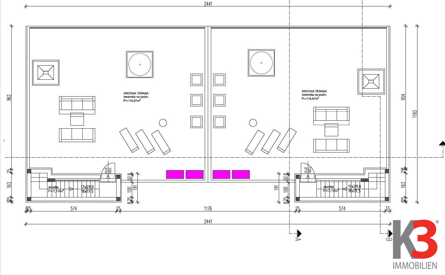 Auf dem Grundstück befindet sich ein beheizter Pool mit großer Sonnenterrasse, während die Dachterrasse ein besonderes Highlight bietet – ein Jacuzzi mit Meerblick verwandelt jedes Beisammensein in ein unvergessliches Erlebnis. Das gesamte Konzept der Villa ist auf das mediterrane Lebensgefühl ausgerichtet, mit einem Fokus auf Luxus, Privatsphäre und Eleganz. Ein besonderer Vorteil dieses Angebots ist die Möglichkeit, zwei identische, spiegelverkehrt angeordnete Villen zu erwerben, was eine größere Investition in die touristische Vermietung oder die Zusammenlegung zu einem einzigartigen Anwesen ermöglicht. Es besteht die Möglichkeit, zusätzliche Parkplätze zu organisieren.