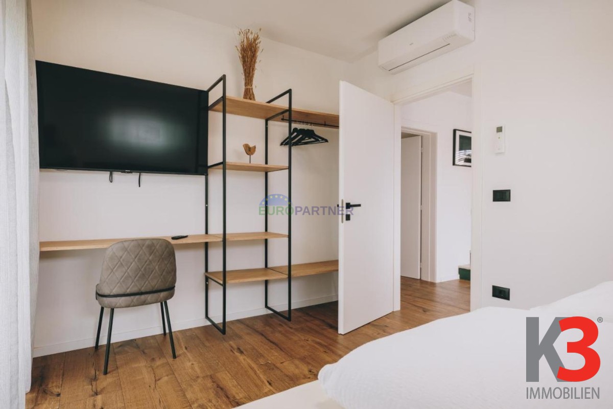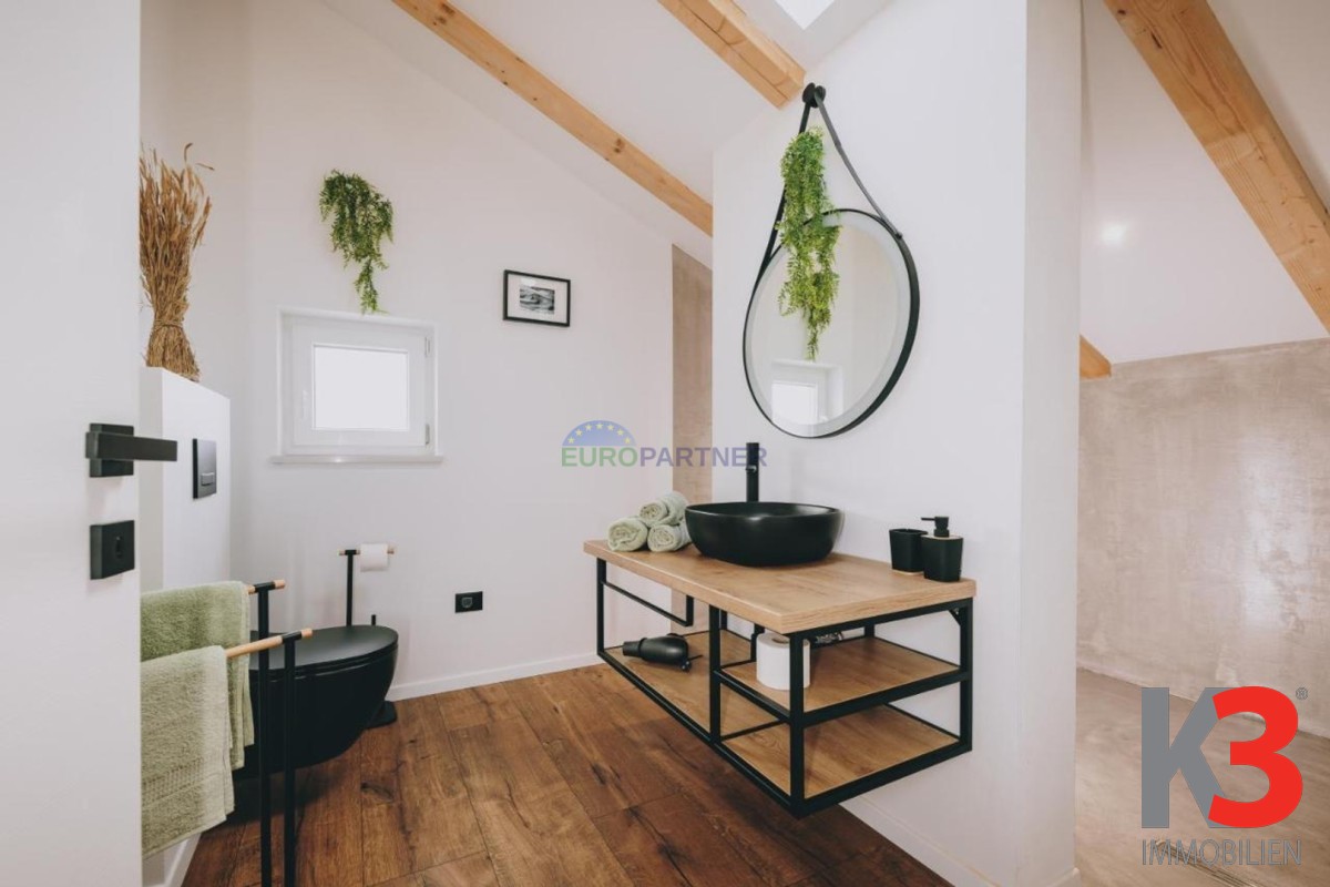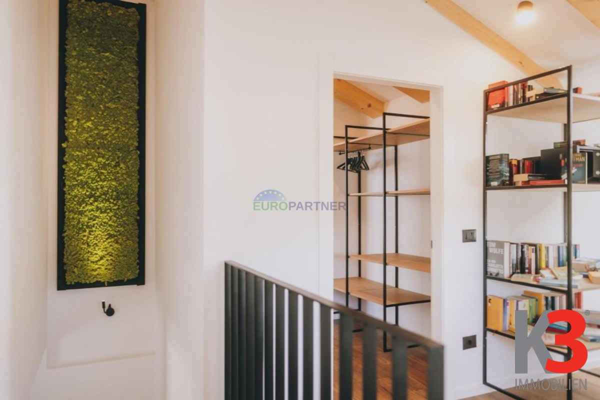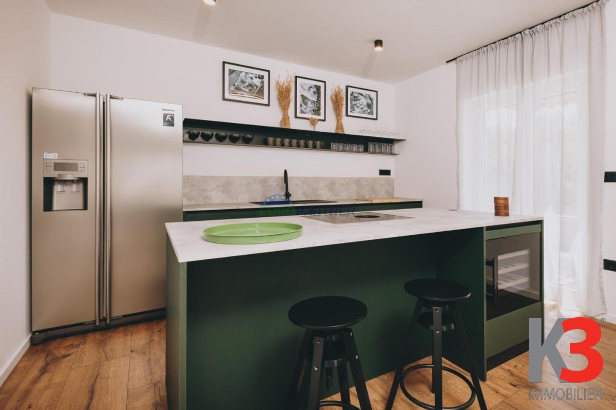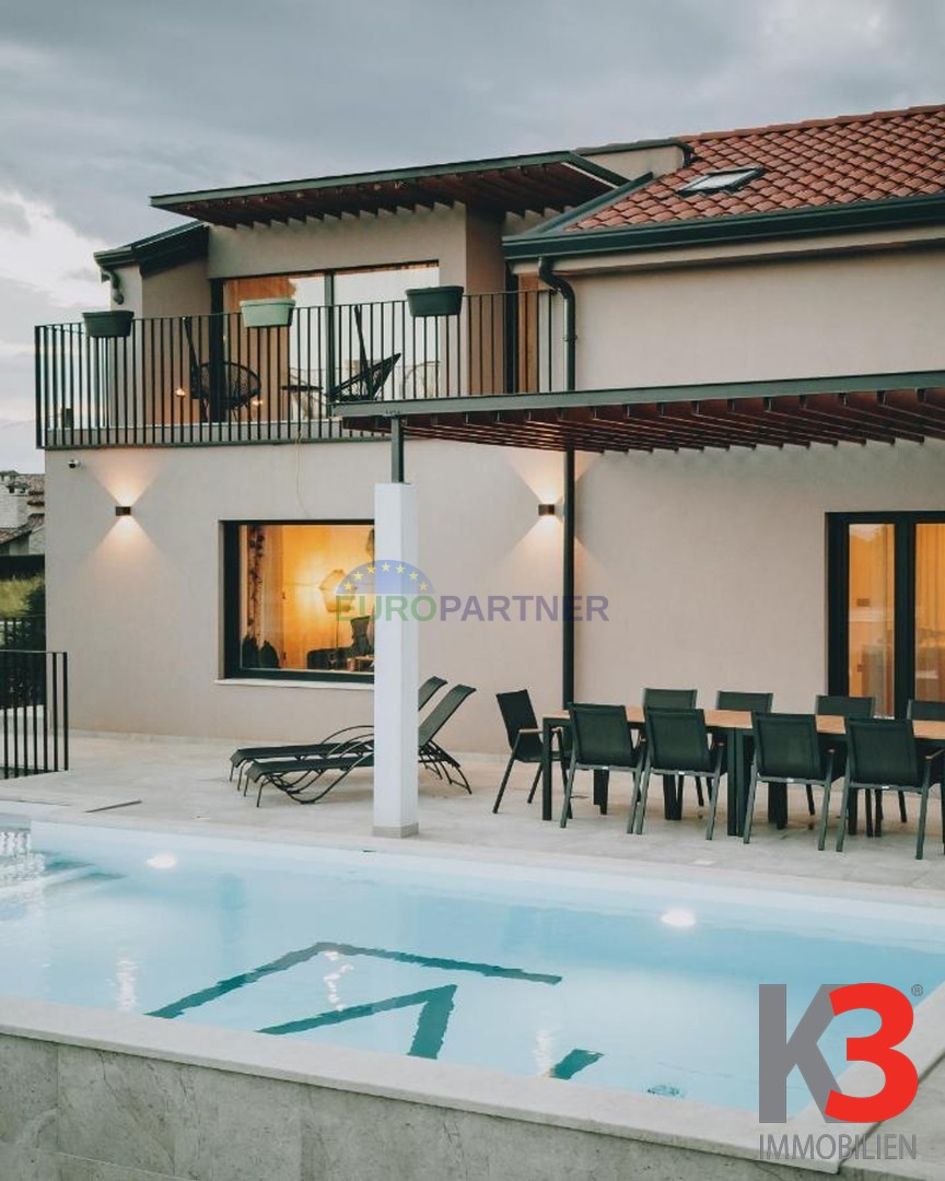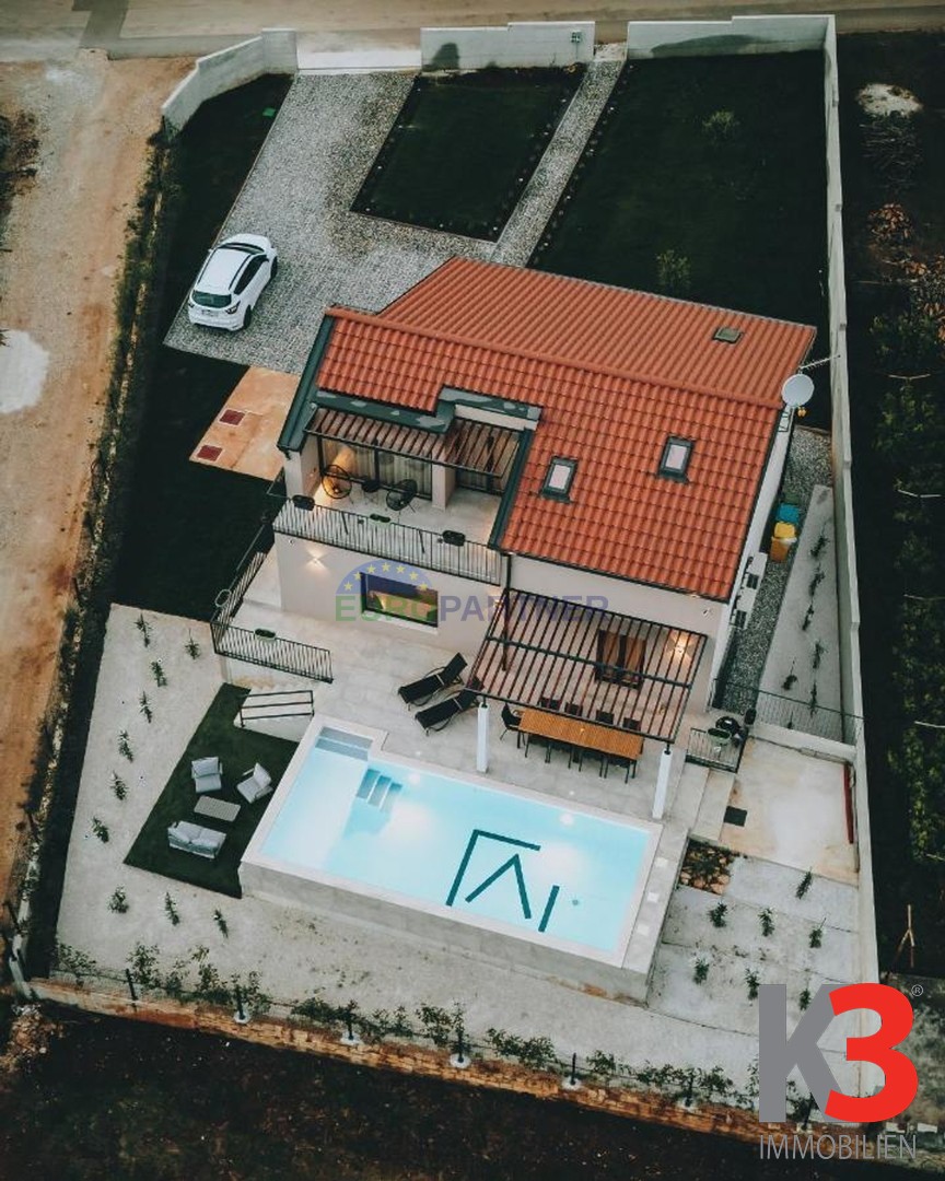 Im oberen Erdgeschoss befinden sich zwei Schlafzimmer mit eigenen Badezimmern, ein Badezimmer und ein Wohnzimmer mit Küche und Esszimmer in einer Open-Space-Version. Im Esszimmer führt eine Treppe in den ersten Stock, wo sich eine Bibliothek, ein großes Schlafzimmer mit Bad und eine Waschküche befinden. Das Zimmer verfügt über eine große Balkonwand mit Zugang zur Terrasse. Die Terrasse bietet einen Blick auf den Swimmingpool und einen wunderschönen Olivenhain.