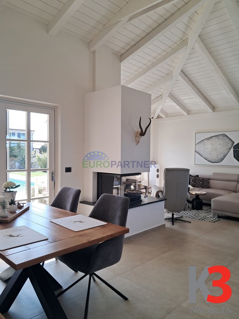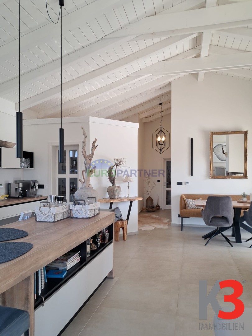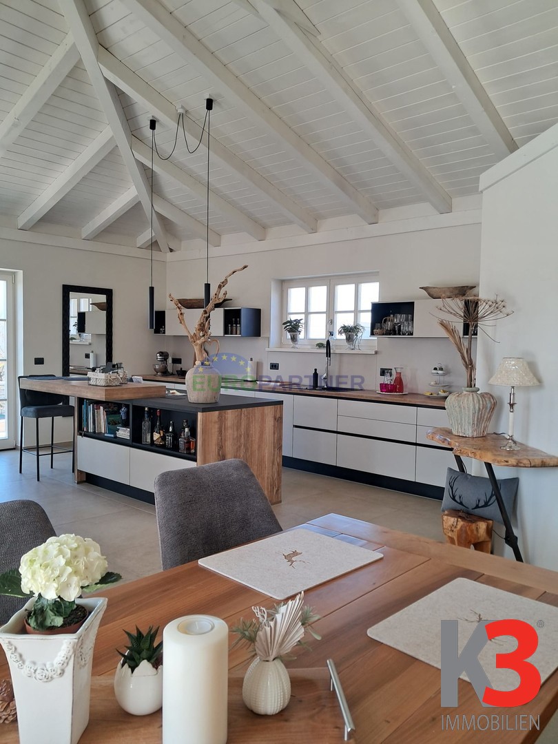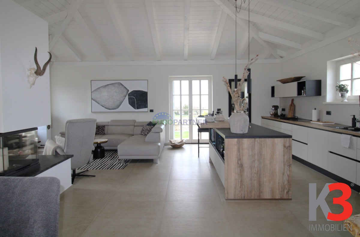 Beim Betreten des Hauses gelangen Sie direkt in das lichtdurchflutete Wohnzimmer mit hoher Decke und sichtbaren Holzbalken, das Wohnen, Kochen und Essen harmonisch miteinander verbindet.