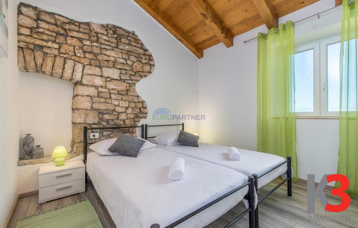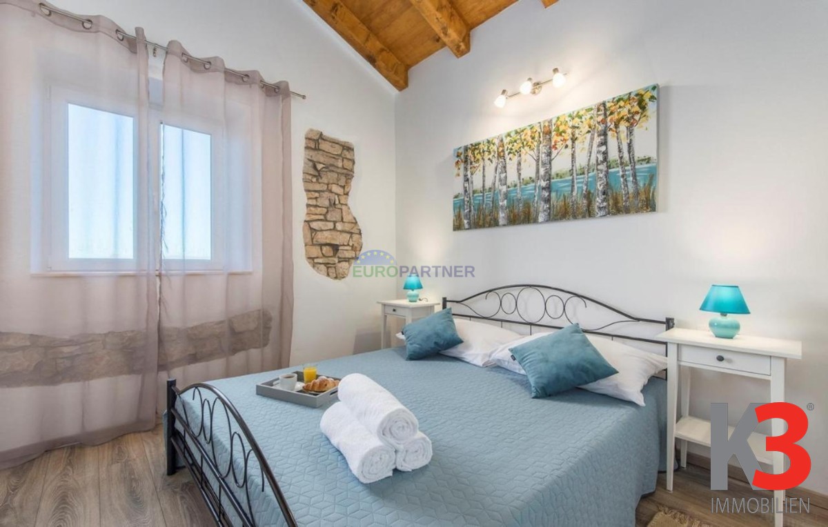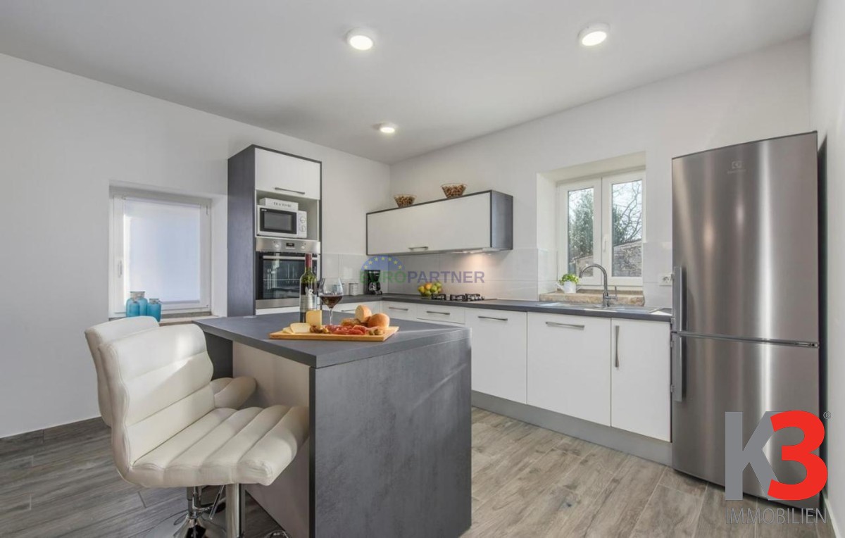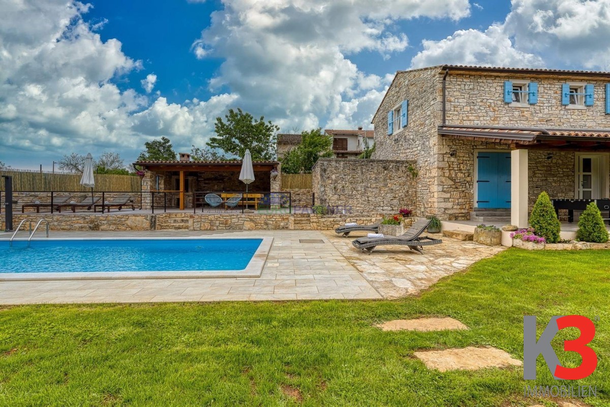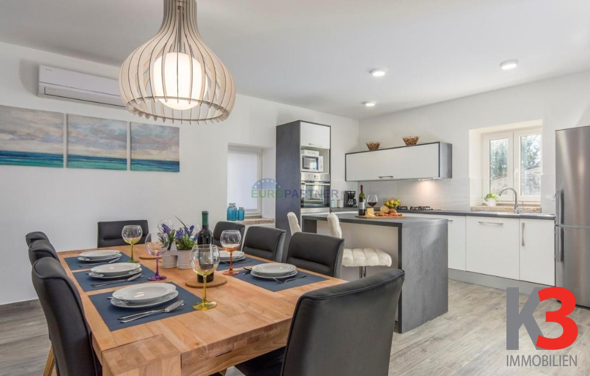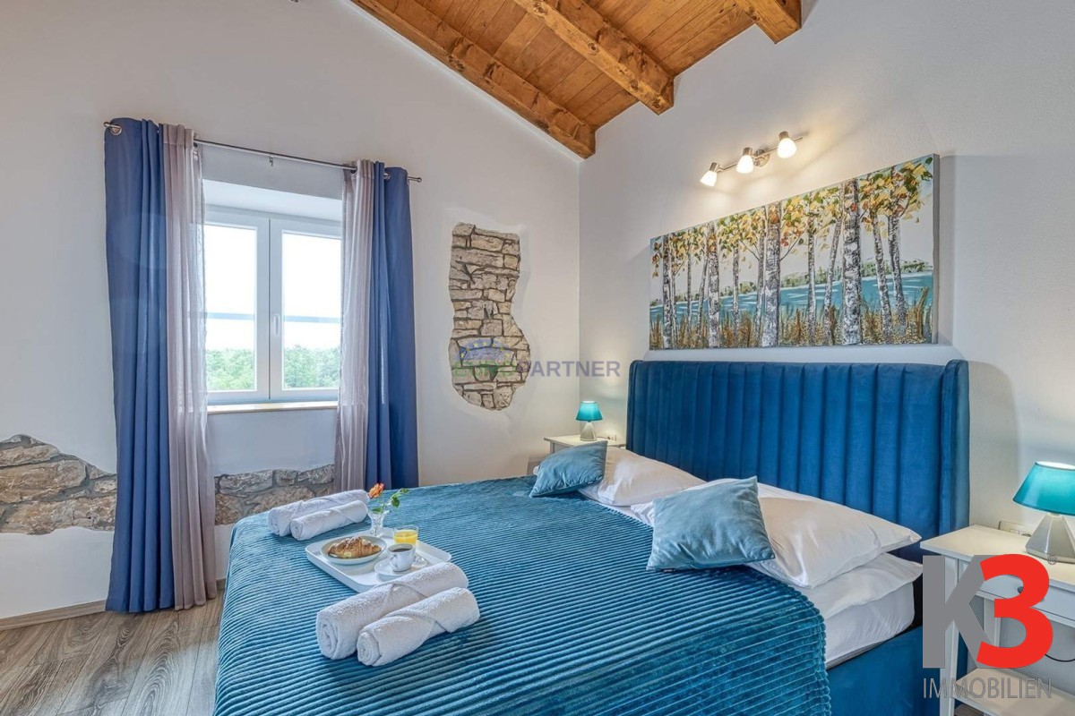 Dieses schöne Steinhaus ist sicherlich dasjenige, das neben der Erholung auch die Batterien jedes Besuchers wieder auflädt, den Glanz, das Lächeln und das Wissen zurückbringt, wie kleine Dinge uns glücklich machen. Sein rustikales Äußeres, das den traditionellen Bau der Steinhäuser in Istrien zelebriert, wird Sie auf den ersten Blick überzeugen, ebenso wie die Pracht des Grüns, die den sorgfältig angelegten Garten schafft. Jedes Detail der Umgebung und des Innenraums des Hauses ist mit großer Sorgfalt und Sorgfalt für diese bezaubernden Momente dekoriert. Sie machen einen solchen Raum äußerst warm und attraktiv.