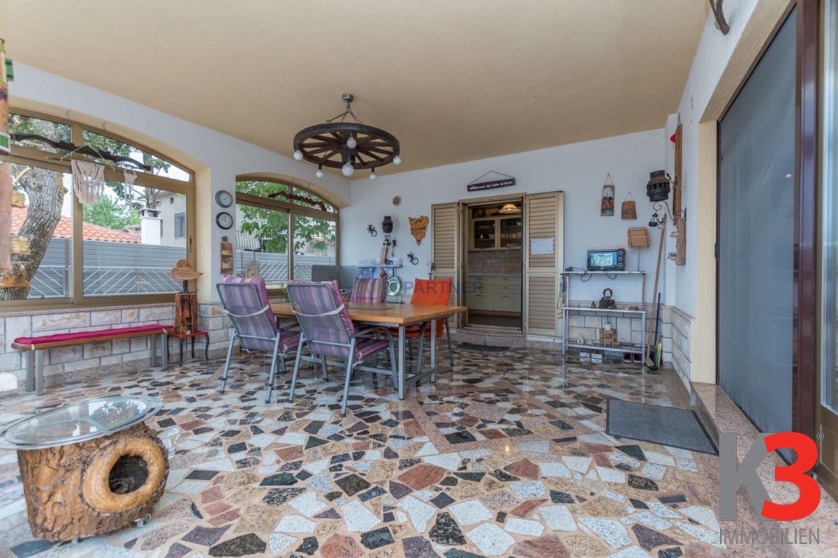 Beim Betreten des Innenraums führt der Flur zu einem geräumigen Wohn- und Esszimmer, einer diskret getrennten Küche mit Zugang zu einer überdachten Außenterrasse und einem offenen Bereich einer weiteren Außenterrasse vor dem Eingang des Hauses.