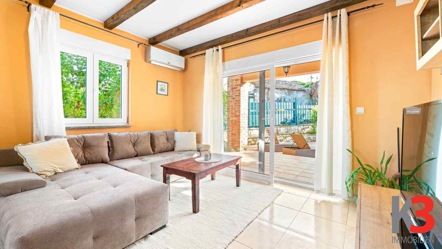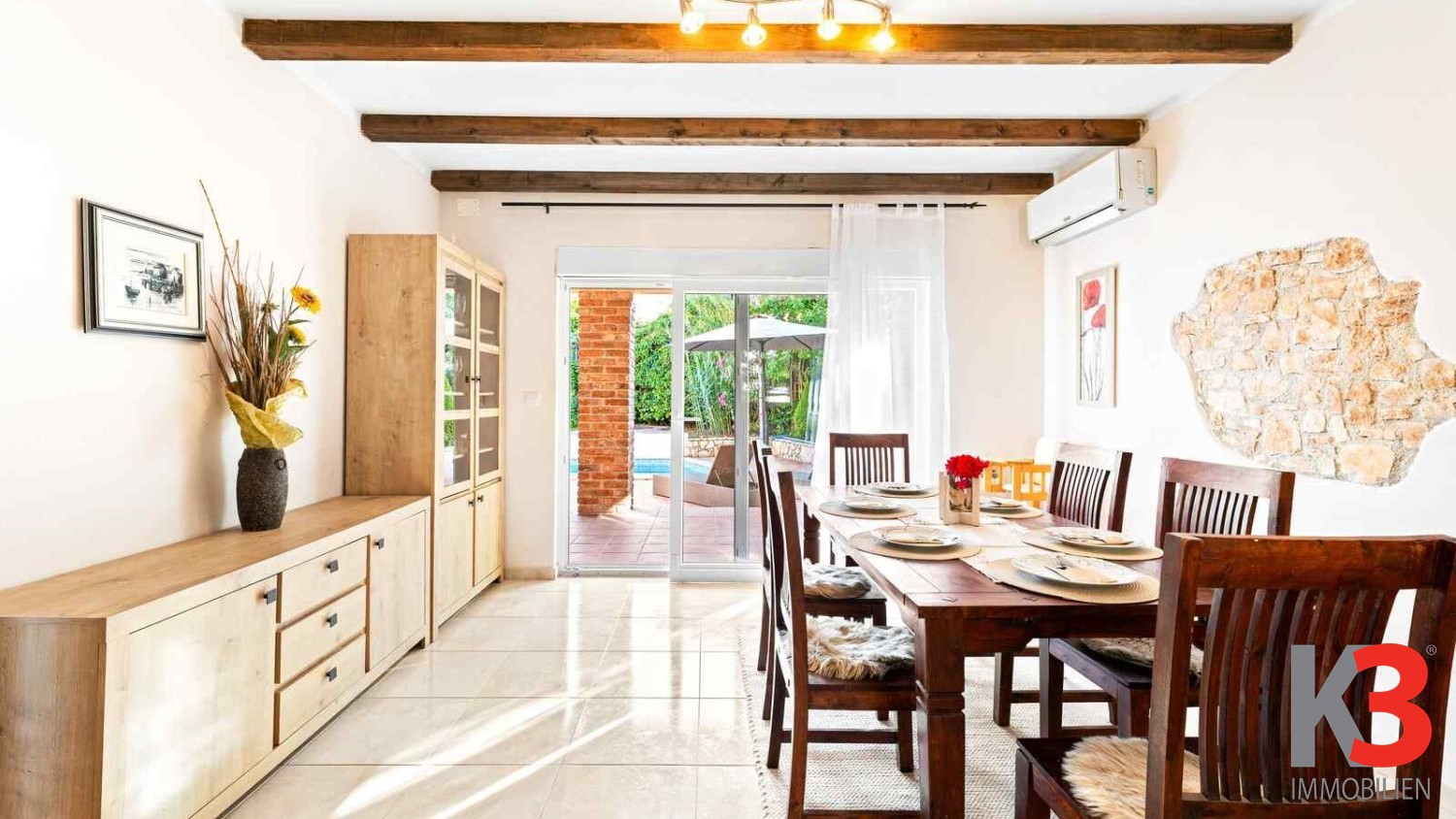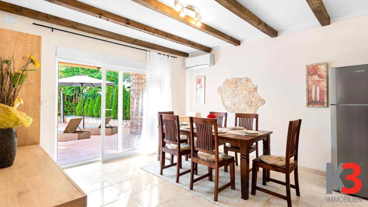 Vor dem Haus befindet sich eine große Terrasse mit Pool und Sonnenbereich, umgeben von einem geräumigen Hof, perfekt, um Ruhe und Privatsphäre zu genießen.
