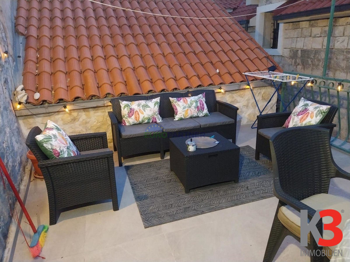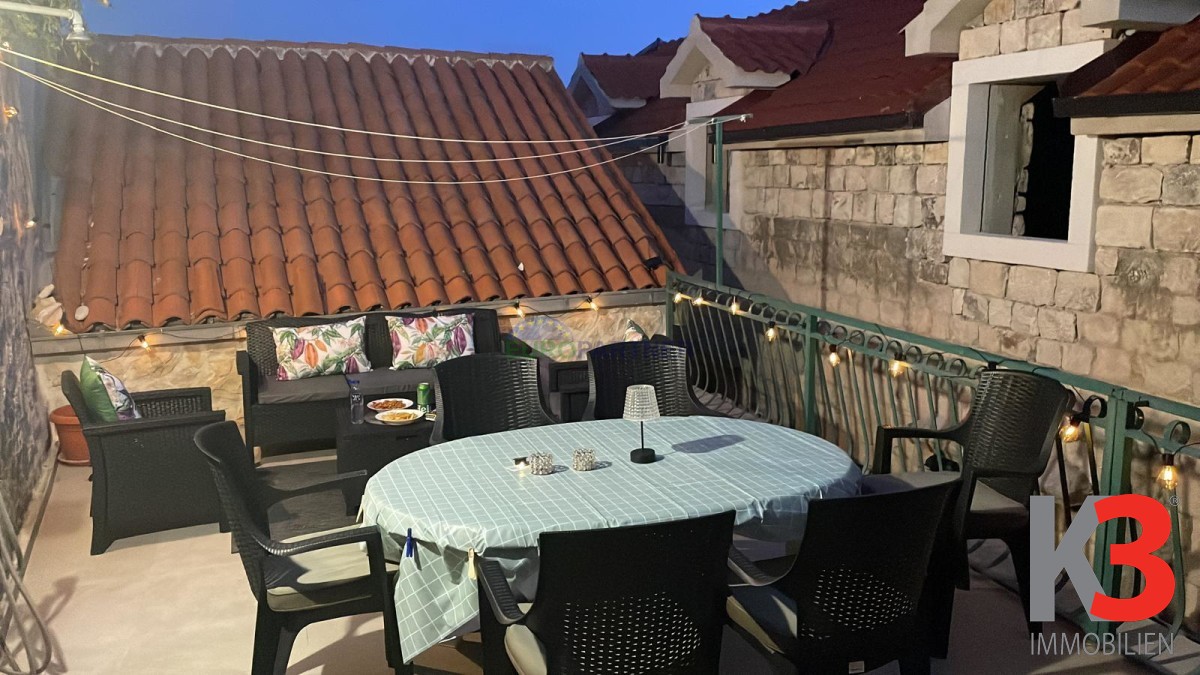 Wir verkaufen ein renoviertes altes Steinhaus in Kaštela, genauer gesagt im Zentrum von Kaštel Stari. Das Haus liegt in der zweiten Reihe zum Meer und befindet sich in unmittelbarer Nähe aller Annehmlichkeiten wie Cafés, Geschäfte, Restaurants, des Hafens usw. Das Haus hat eine Gesamtnettonutzfläche von 220 m2 und besteht aus drei Etagen: einem Büroraum im Erdgeschoss und einer zweistöckigen Wohnung mit Terrasse. Im ersten Stock gibt es eine Küche mit Esszimmer, zwei geräumige Schlafzimmer, einen Abstellraum und ein großes Badezimmer. Die Innentreppe führt in die obere Etage, wo sich zwei weitere Schlafzimmer, ein Hauswirtschaftsraum und ein Badezimmer befinden. Die Hauptattraktion des Hauses ist die große Terrasse von 22 m2, die diesem Steinhaus einen zusätzlichen Wert verleiht. Bei Bedarf kann die zweistöckige Wohnung problemlos in zwei kleinere Wohnungen umgewandelt werden, eine auf jeder Etage. Das Haus wurde 1987 renoviert, zwischen den Etagen wurden Betonplatten eingebaut und das Haus ist mit dicken Steinmauern geschmückt. Die Gewerbefläche im Erdgeschoss verfügt über 70 m2 und bietet zahlreiche Möglichkeiten als Kapitalanlage. Gewerbeflächen im Erdgeschoss sind aufgrund der hervorragenden Lage mitten in der Stadt ein großer Vorteil, während die Wohnflächen in den oberen Etagen eine ideale Immobilie sowohl für den Urlaub als auch zur Miete sein können.