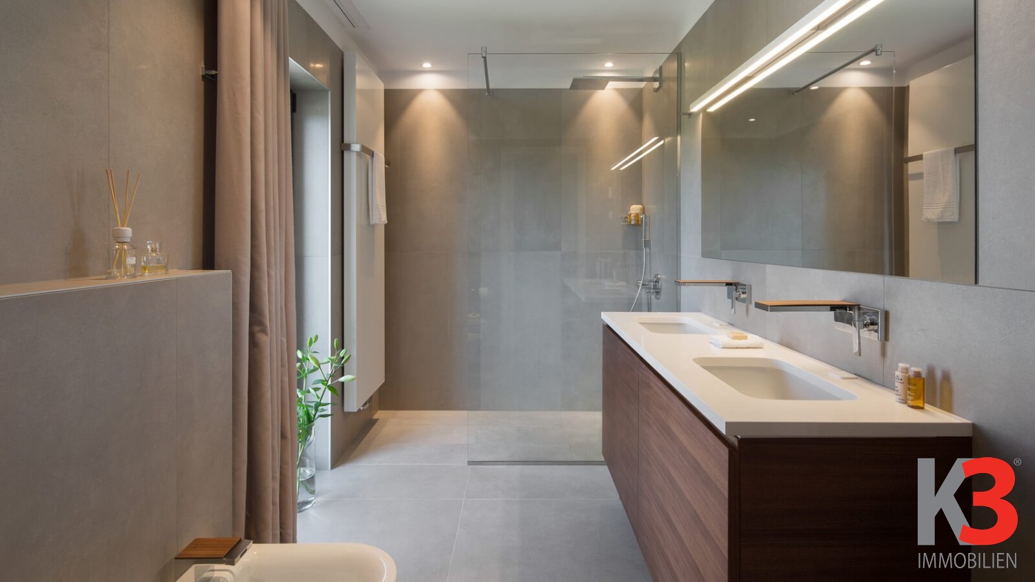 Das Erdgeschoss bildet das Zentrum des täglichen Lebens und der Entspannung. Der offene Wohnbereich vereint Küche, Esszimmer und ein großzügiges Wohnzimmer, das durch Glasfronten nahtlos auf eine überdachte Terrasse mit Pergola und Sommerküche übergeht. Auf derselben Ebene befindet sich ein beeindruckender Wellnessbereich mit beheiztem Innenpool, finnischer Sauna und Badezimmer. Drei komfortable Schlafzimmer, jeweils mit eigenem Bad, bieten vollständige Privatsphäre. Zusätzlich gibt es ein Gäste-WC, einen Hauswirtschaftsraum sowie einen Technikraum.