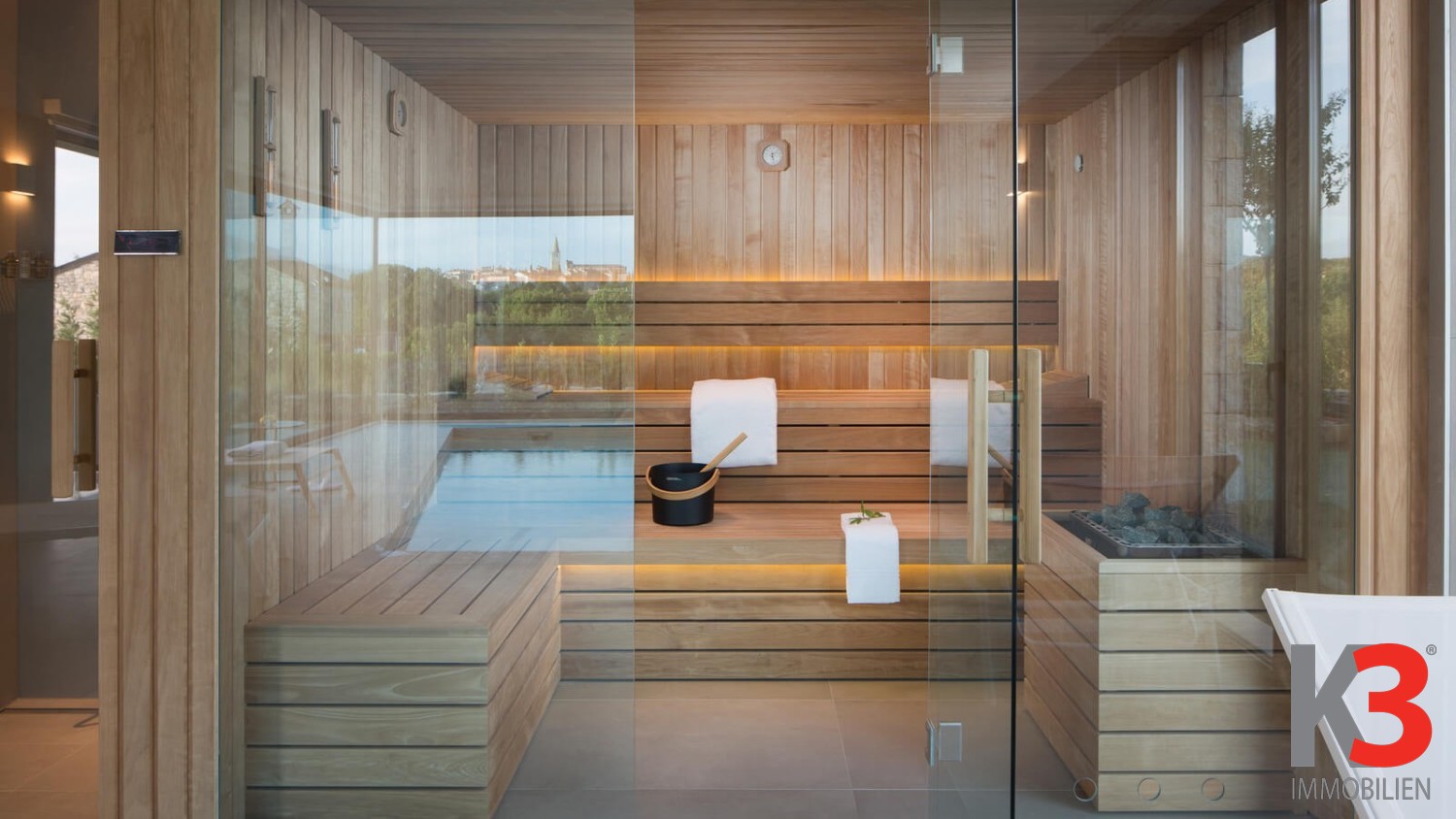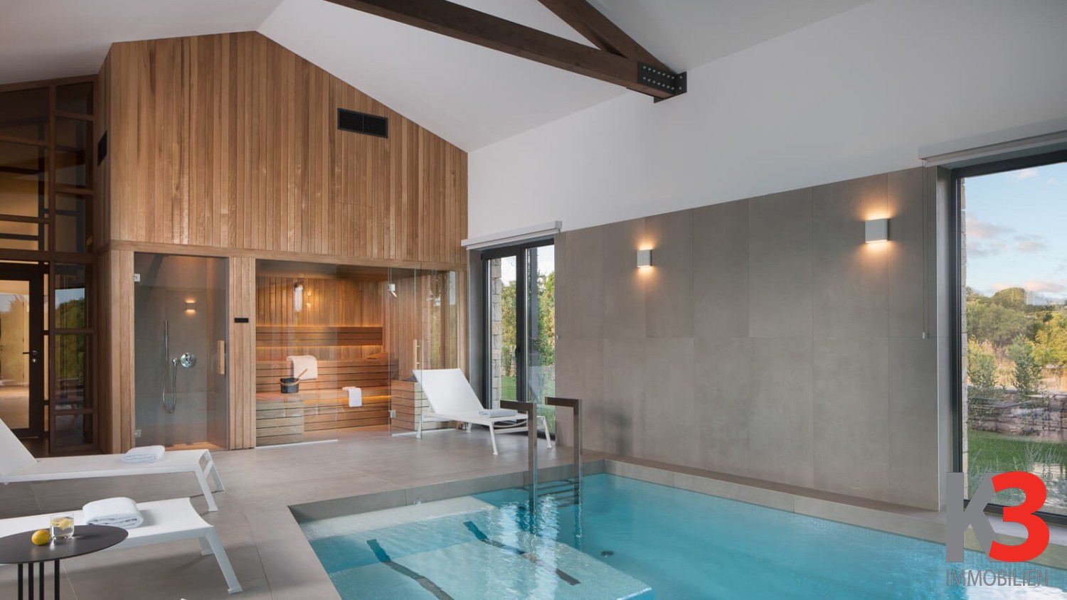 Der Außenbereich ist ebenso beeindruckend wie das Interieur. Das eingezäunte Grundstück ist liebevoll begrünt und schafft die Atmosphäre eines versteckten mediterranen Gartens. Im Mittelpunkt steht ein beheizter Außenpool mit 40 m² und Sonnenterrasse, während eine überdachte Lounge-Zone sowie ein flaches Relaxbecken perfekte Bedingungen für entspannte Tage und gesellige Abende bieten.