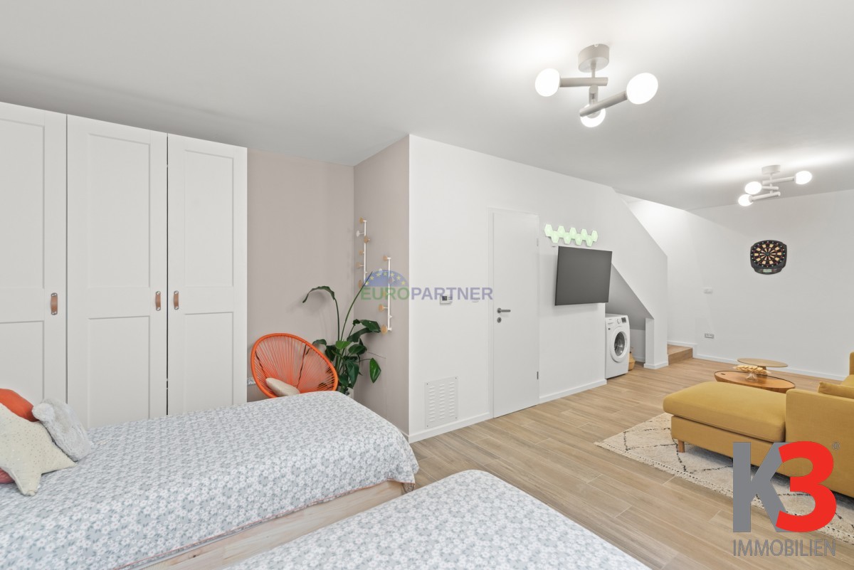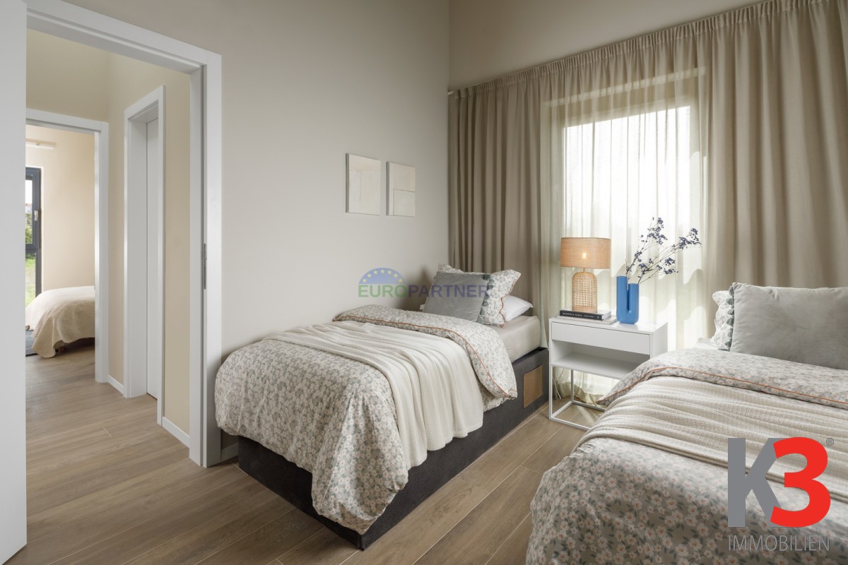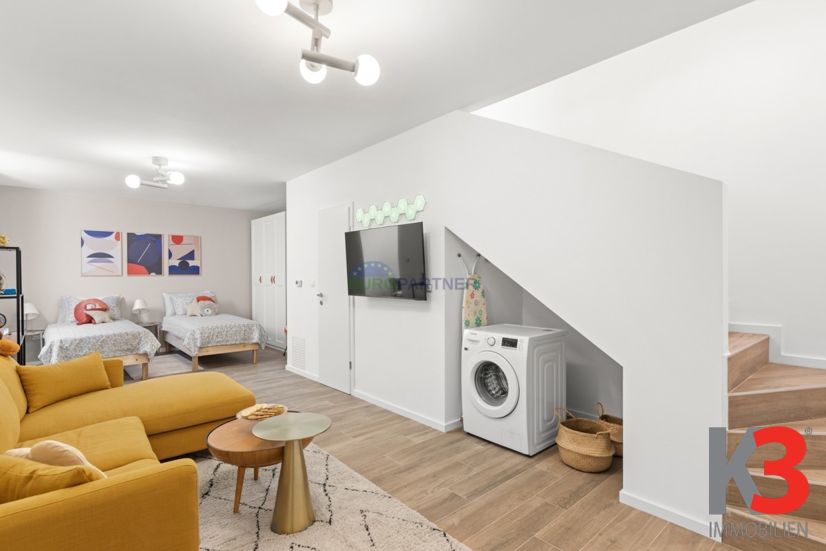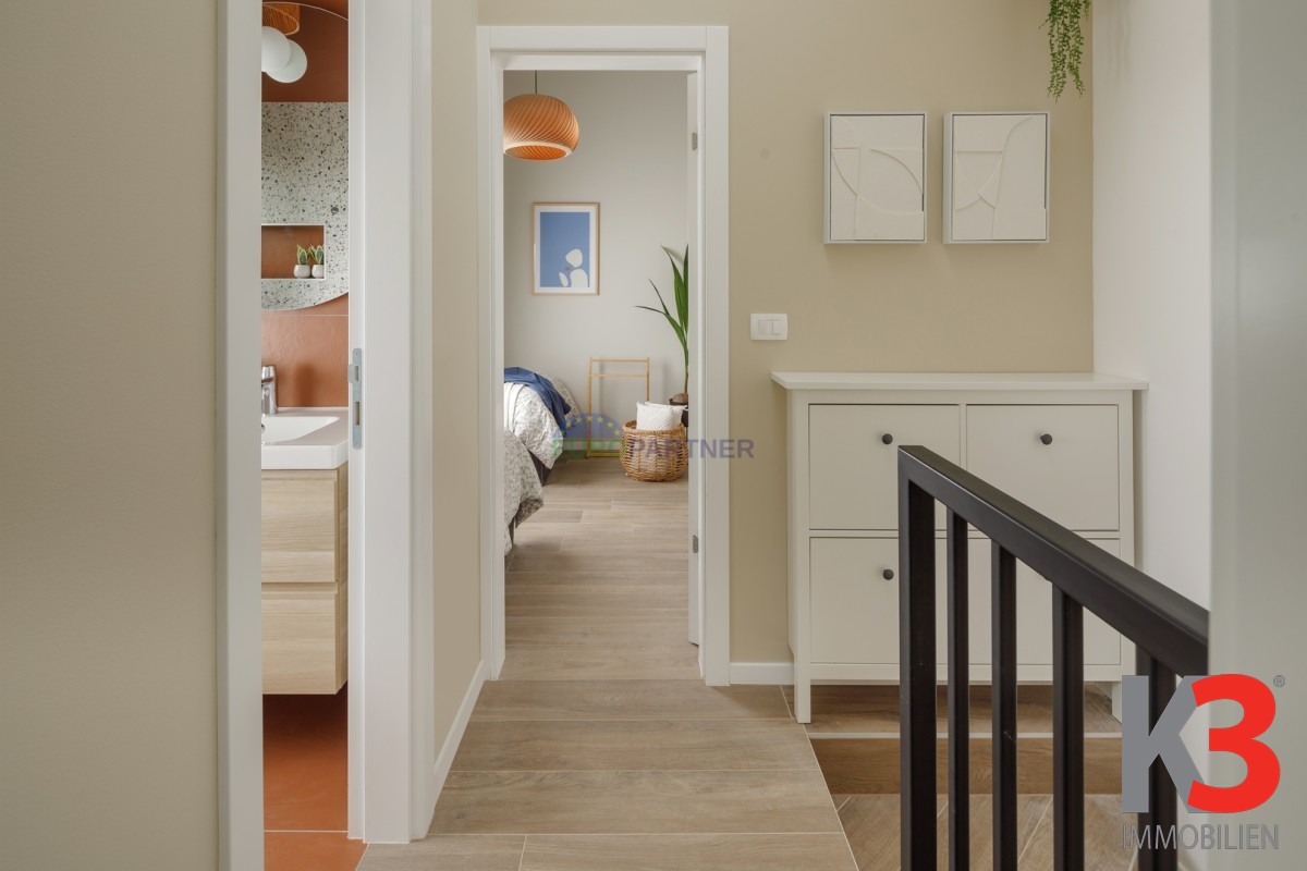 - Erdgeschoss – ein lichtdurchflutetes, großzügiges Open-Space-Konzept, das Küche, Essbereich und Wohnzimmer miteinander verbindet und direkten Zugang zur Terrasse und zum Garten bietet. Ein Gäste-WC ergänzt diese Ebene.
