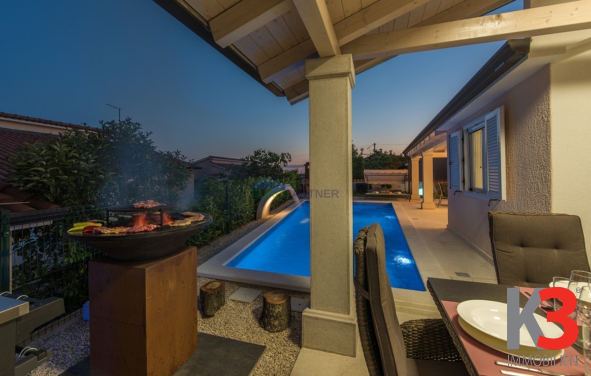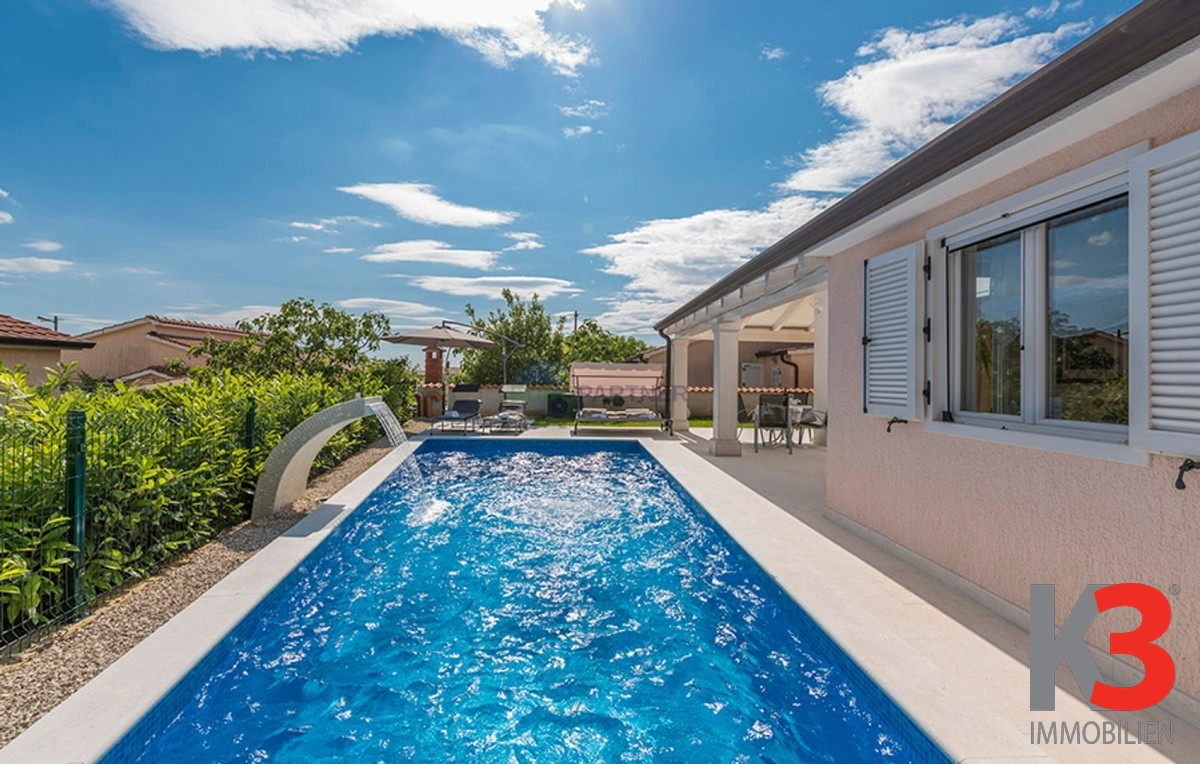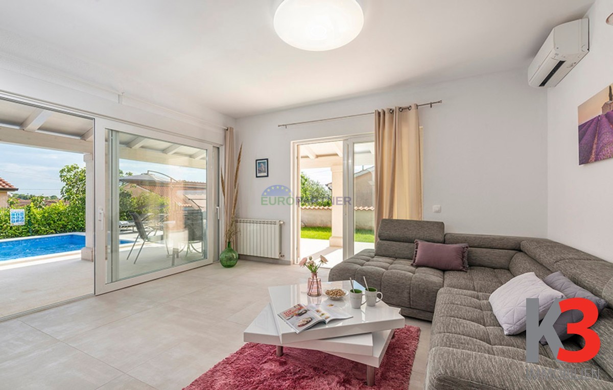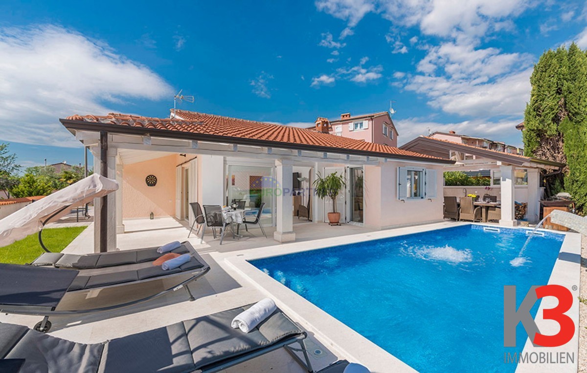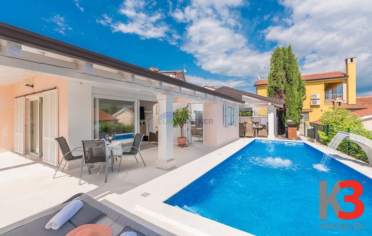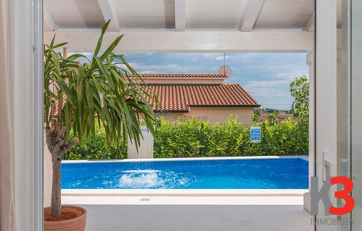 Dieses schöne einstöckige Haus mit Swimmingpool befindet sich in der Nähe von Poreč. Das Erdgeschoss umfasst 156 m2. Das Haus besteht aus einem Wohnzimmer, einer Küche und einer Speisekammer in einem offenen Raumkonzept. Was dieses einstöckige Haus äußerst angenehm zum Wohnen macht, sind die Balkonwände, die für viel Licht und Sonnenschein sorgen. Die Küche öffnet sich zur Terrasse, wo sich die Sommerküche befindet, während das Wohnzimmer direkt zum Sonnendeck und zum Pool führt. Aufgrund der guten Verbindung zwischen den Räumen ist das Haus äußerst praktisch. In den warmen Monaten können Speisen und Getränke im Freien zubereitet werden, in den Wintermonaten ist das Haus durch die Balkonwände äußerst hell. Der Pool ist beheizt und ermöglicht das Schwimmen auch in den kälteren Monaten. Der Pool nutzt ein Meersalzfiltersystem anstelle von Chlor und verfügt über mehrere Hydromassagedüsen und einen Wasserfall. Das Haus verfügt außerdem über drei Schlafzimmer und drei Badezimmer sowie einen Hauswirtschaftsraum. Es ist wichtig zu beachten, dass das Haus ein zeitloses Design hat und komplett möbliert verkauft wird.