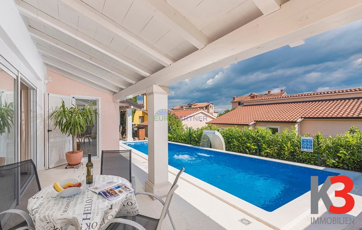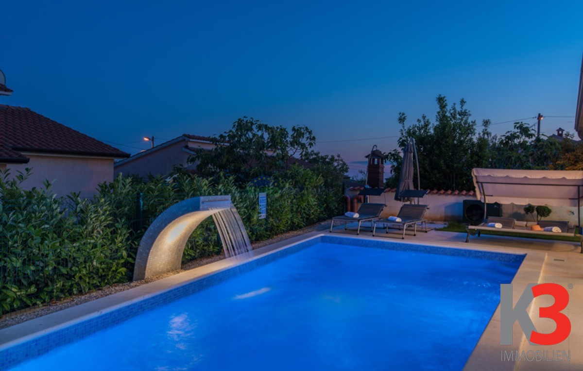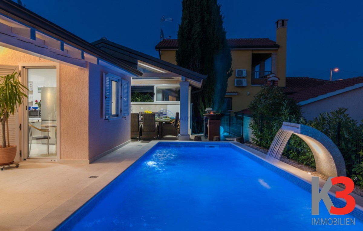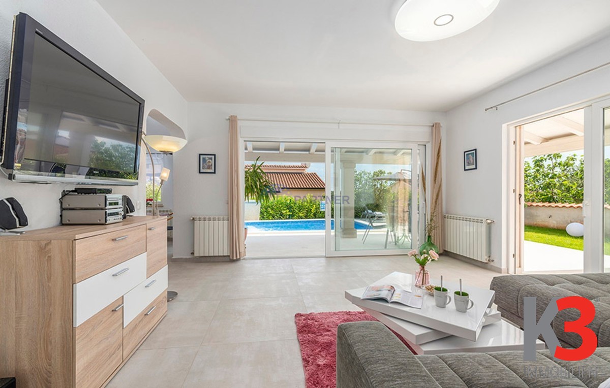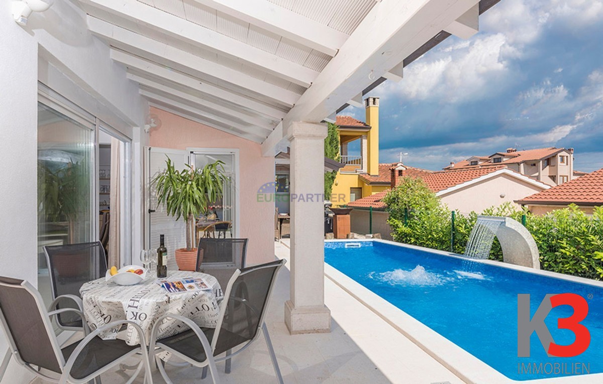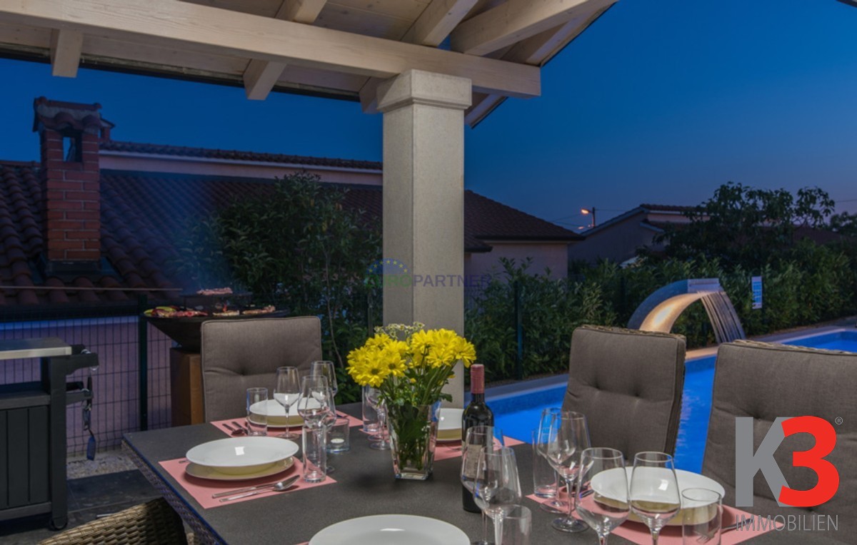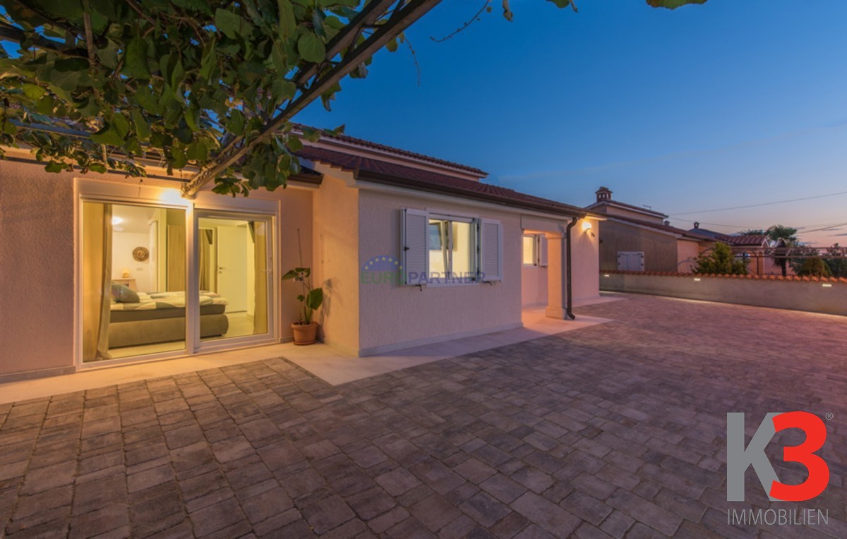 Dieses schöne einstöckige Haus mit Swimmingpool befindet sich in der Nähe von Poreč. Das Erdgeschoss umfasst 156 m2. Das Haus besteht aus einem Wohnzimmer, einer Küche und einer Speisekammer in einem offenen Raumkonzept. Was dieses einstöckige Haus äußerst angenehm zum Wohnen macht, sind die Balkonwände, die für viel Licht und Sonnenschein sorgen. Die Küche öffnet sich zur Terrasse, wo sich die Sommerküche befindet, während das Wohnzimmer direkt zum Sonnendeck und zum Pool führt. Aufgrund der guten Verbindung zwischen den Räumen ist das Haus äußerst praktisch. In den warmen Monaten können Speisen und Getränke im Freien zubereitet werden, in den Wintermonaten ist das Haus durch die Balkonwände äußerst hell. Der Pool ist beheizt und ermöglicht das Schwimmen auch in den kälteren Monaten. Der Pool nutzt ein Meersalzfiltersystem anstelle von Chlor und verfügt über mehrere Hydromassagedüsen und einen Wasserfall. Das Haus verfügt außerdem über drei Schlafzimmer und drei Badezimmer sowie einen Hauswirtschaftsraum. Es ist wichtig zu beachten, dass das Haus ein zeitloses Design hat und komplett möbliert verkauft wird.