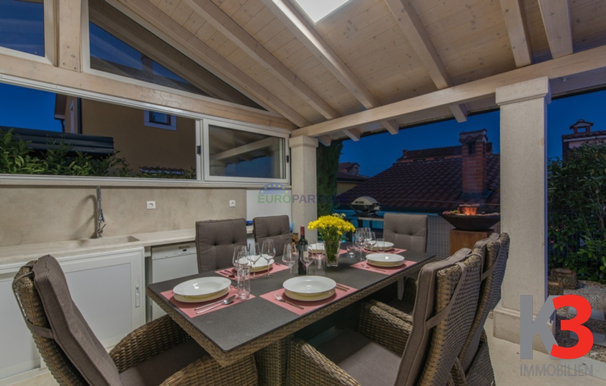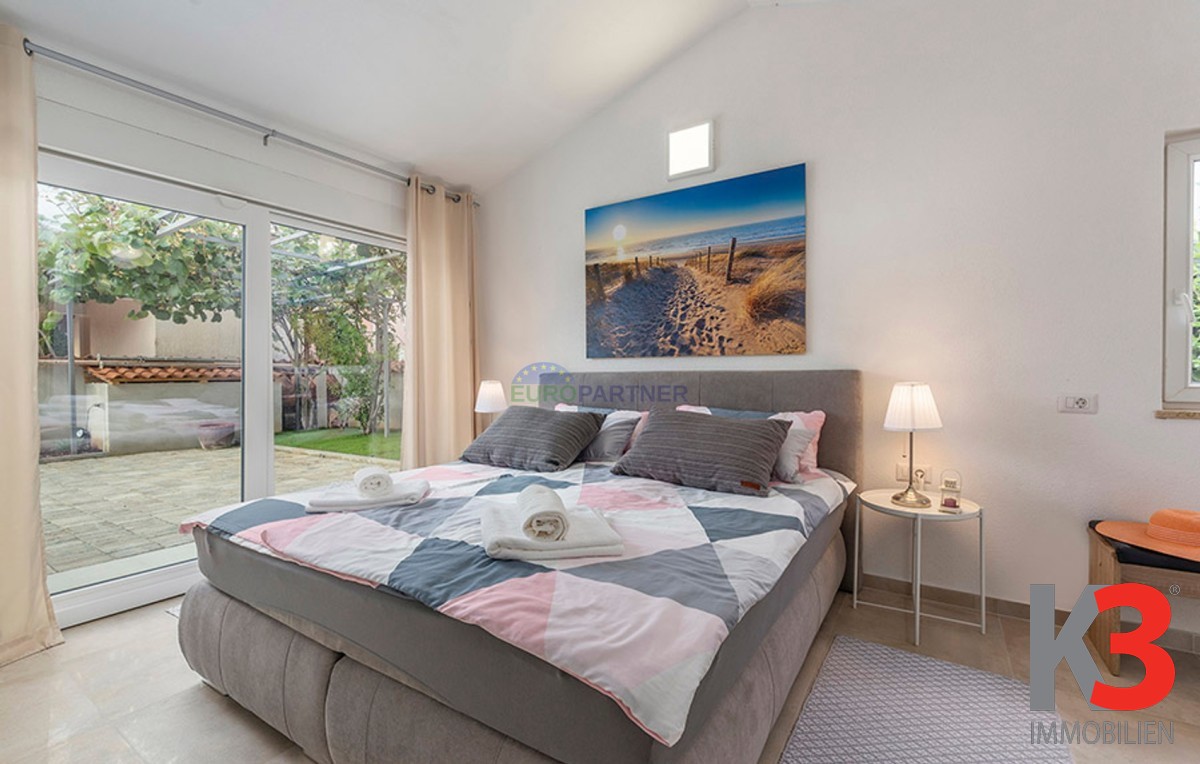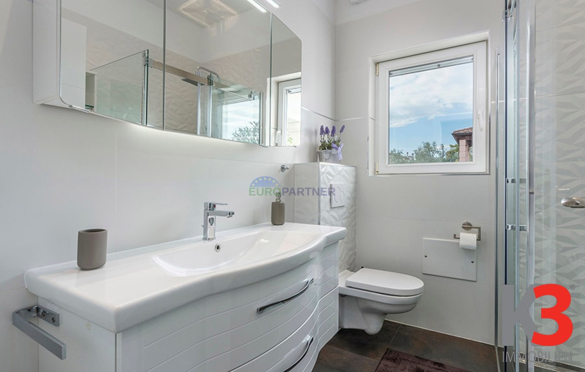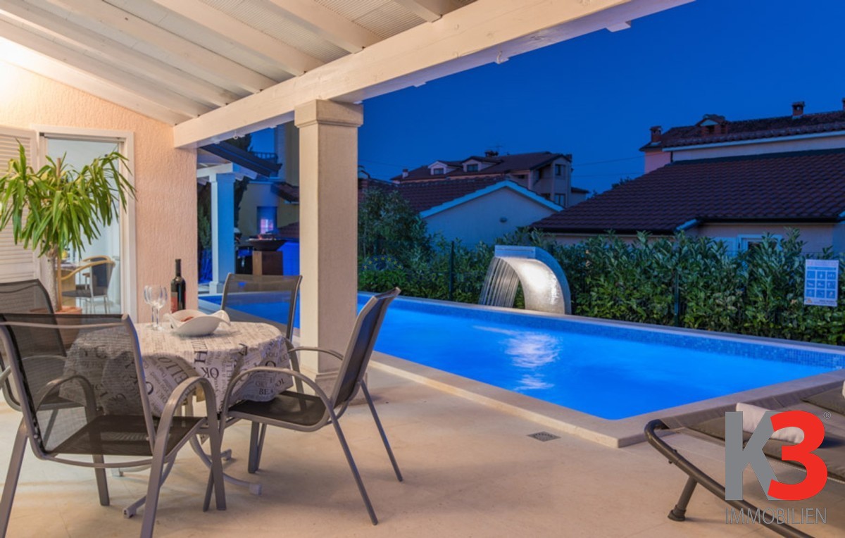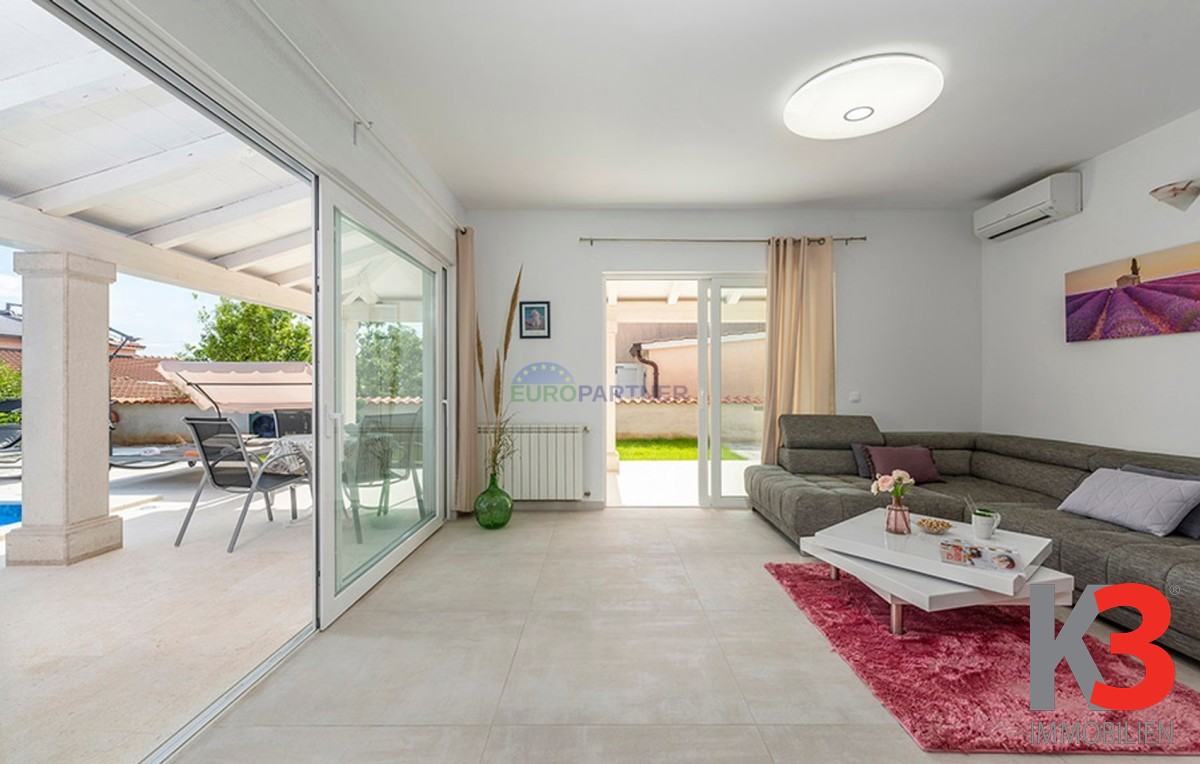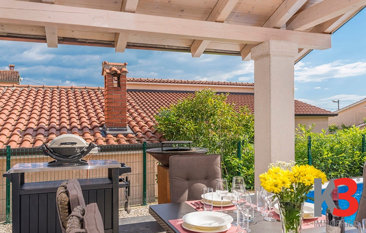Dieses schöne einstöckige Haus mit Swimmingpool befindet sich in der Nähe von Poreč. Das Erdgeschoss umfasst 156 m2. Das Haus besteht aus einem Wohnzimmer, einer Küche und einer Speisekammer in einem offenen Raumkonzept. Was dieses einstöckige Haus äußerst angenehm zum Wohnen macht, sind die Balkonwände, die für viel Licht und Sonnenschein sorgen. Die Küche öffnet sich zur Terrasse, wo sich die Sommerküche befindet, während das Wohnzimmer direkt zum Sonnendeck und zum Pool führt. Aufgrund der guten Verbindung zwischen den Räumen ist das Haus äußerst praktisch. In den warmen Monaten können Speisen und Getränke im Freien zubereitet werden, in den Wintermonaten ist das Haus durch die Balkonwände äußerst hell. Der Pool ist beheizt und ermöglicht das Schwimmen auch in den kälteren Monaten. Der Pool nutzt ein Meersalzfiltersystem anstelle von Chlor und verfügt über mehrere Hydromassagedüsen und einen Wasserfall. Das Haus verfügt außerdem über drei Schlafzimmer und drei Badezimmer sowie einen Hauswirtschaftsraum. Es ist wichtig zu beachten, dass das Haus ein zeitloses Design hat und komplett möbliert verkauft wird.