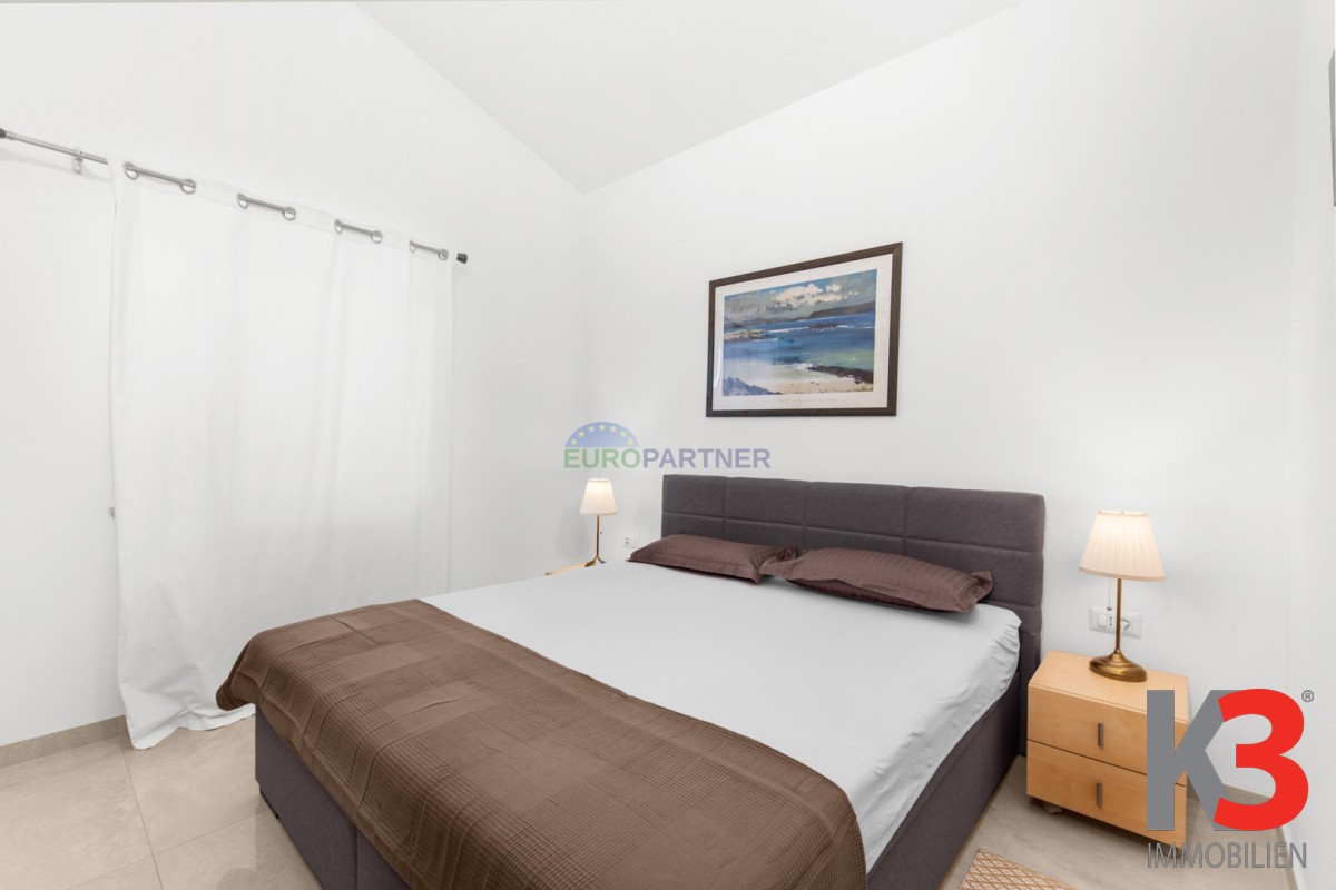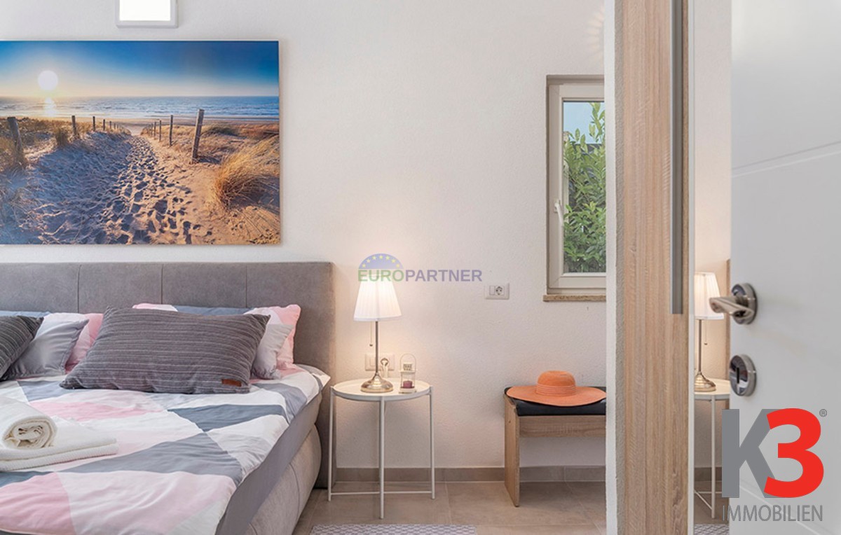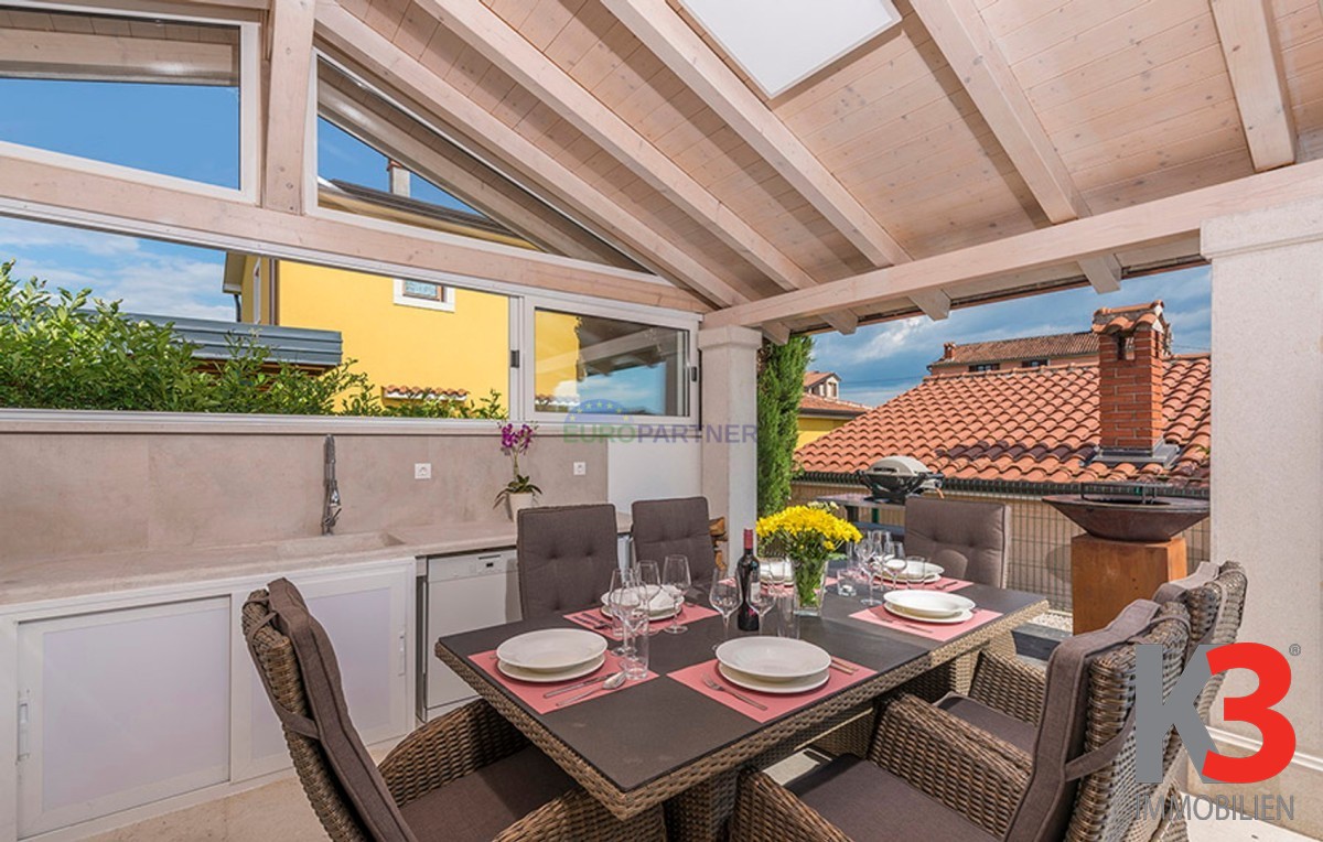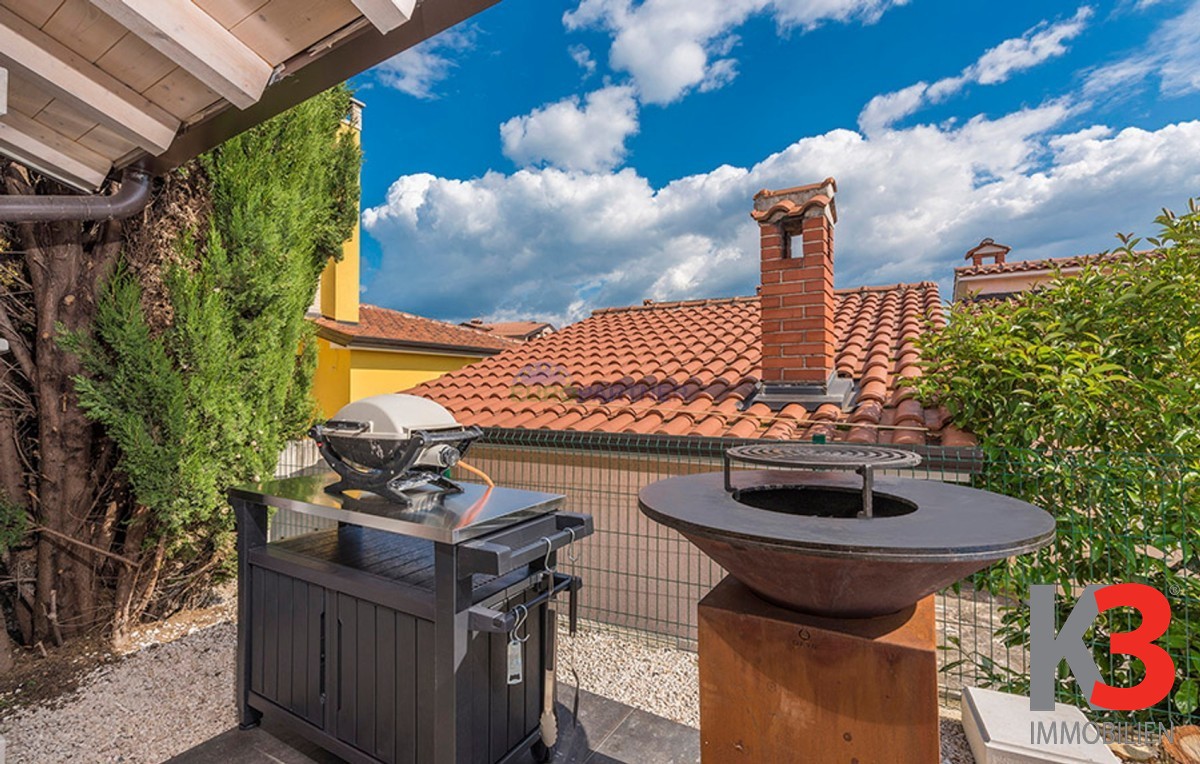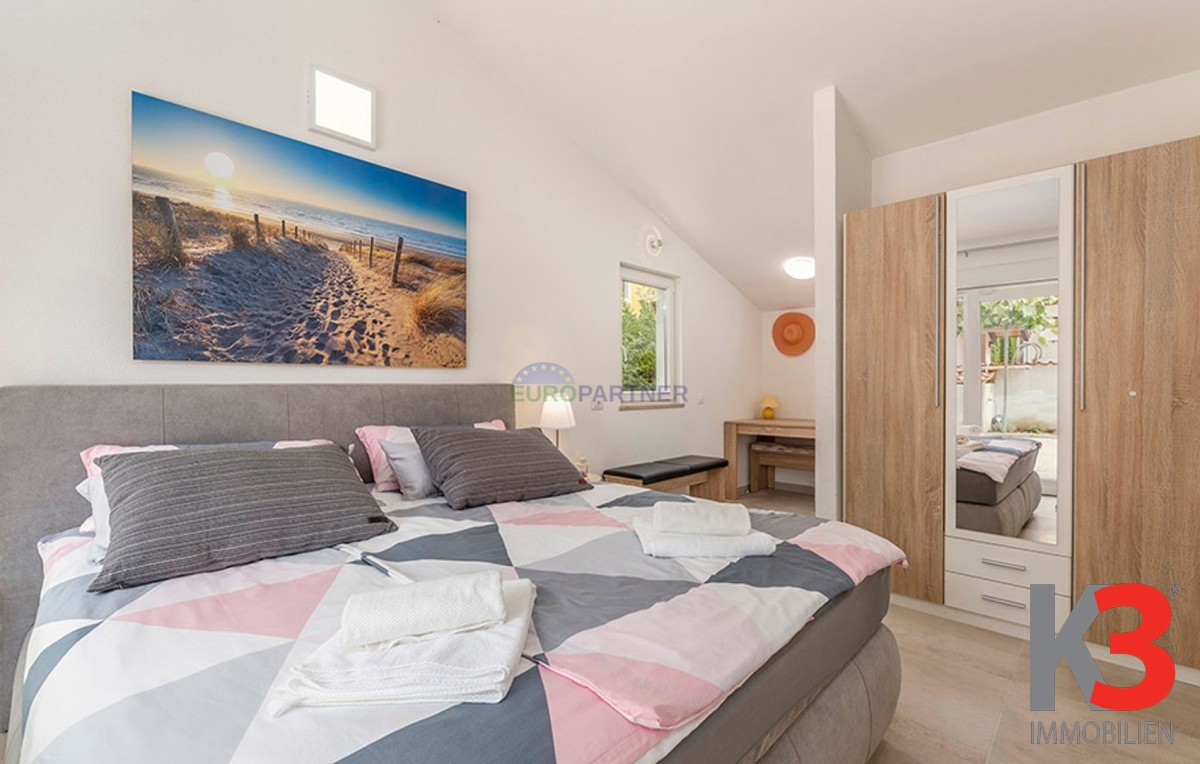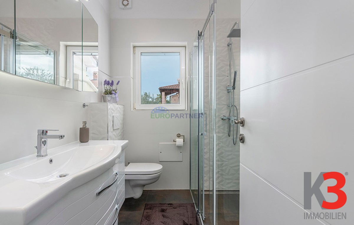Dieses schöne einstöckige Haus mit Swimmingpool befindet sich in der Nähe von Poreč. Das Erdgeschoss umfasst 156 m2. Das Haus besteht aus einem Wohnzimmer, einer Küche und einer Speisekammer in einem offenen Raumkonzept. Was dieses einstöckige Haus äußerst angenehm zum Wohnen macht, sind die Balkonwände, die für viel Licht und Sonnenschein sorgen. Die Küche öffnet sich zur Terrasse, wo sich die Sommerküche befindet, während das Wohnzimmer direkt zum Sonnendeck und zum Pool führt. Aufgrund der guten Verbindung zwischen den Räumen ist das Haus äußerst praktisch. In den warmen Monaten können Speisen und Getränke im Freien zubereitet werden, in den Wintermonaten ist das Haus durch die Balkonwände äußerst hell. Der Pool ist beheizt und ermöglicht das Schwimmen auch in den kälteren Monaten. Der Pool nutzt ein Meersalzfiltersystem anstelle von Chlor und verfügt über mehrere Hydromassagedüsen und einen Wasserfall. Das Haus verfügt außerdem über drei Schlafzimmer und drei Badezimmer sowie einen Hauswirtschaftsraum. Es ist wichtig zu beachten, dass das Haus ein zeitloses Design hat und komplett möbliert verkauft wird.