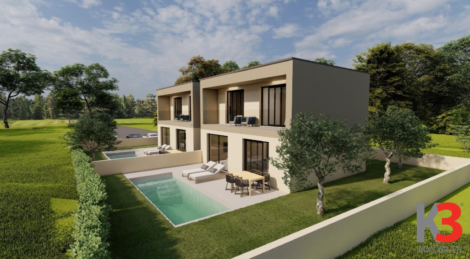 Zum Verkauf stehen neue moderne Häuser mit Swimmingpool, gelegen im ruhigen Ort Žbandaj, nur wenige Kilometer von Poreč und dem Meer entfernt.