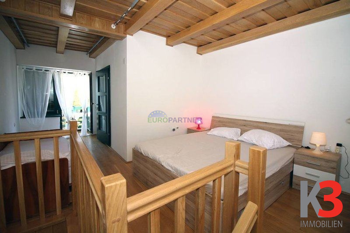 Im Obergeschoss befindet sich ein offener Raum mit einem großen Doppelbett und einem kleineren Bett sowie ein Badezimmer, sowie mit Zugang zu einem kleinen Balkon.