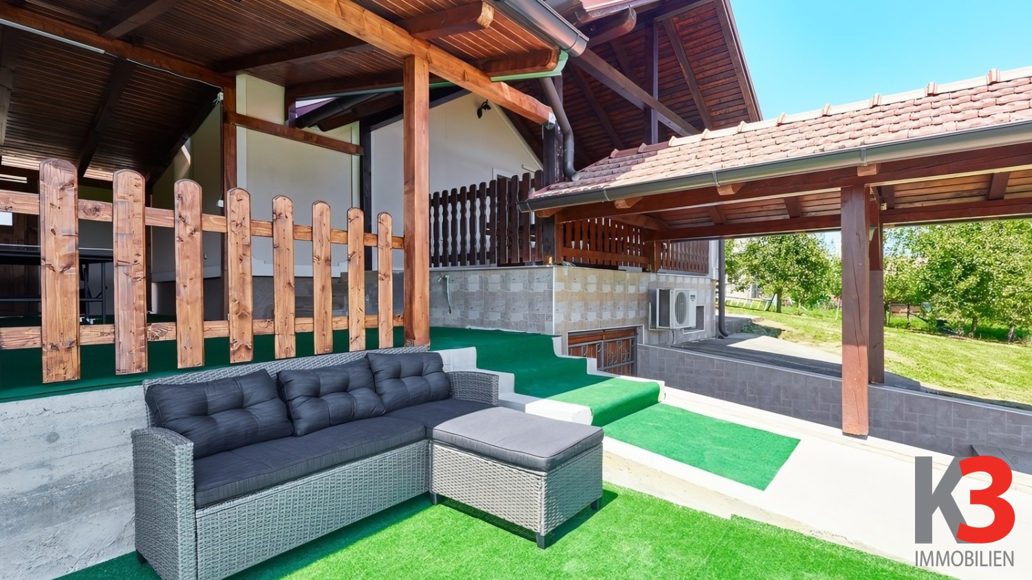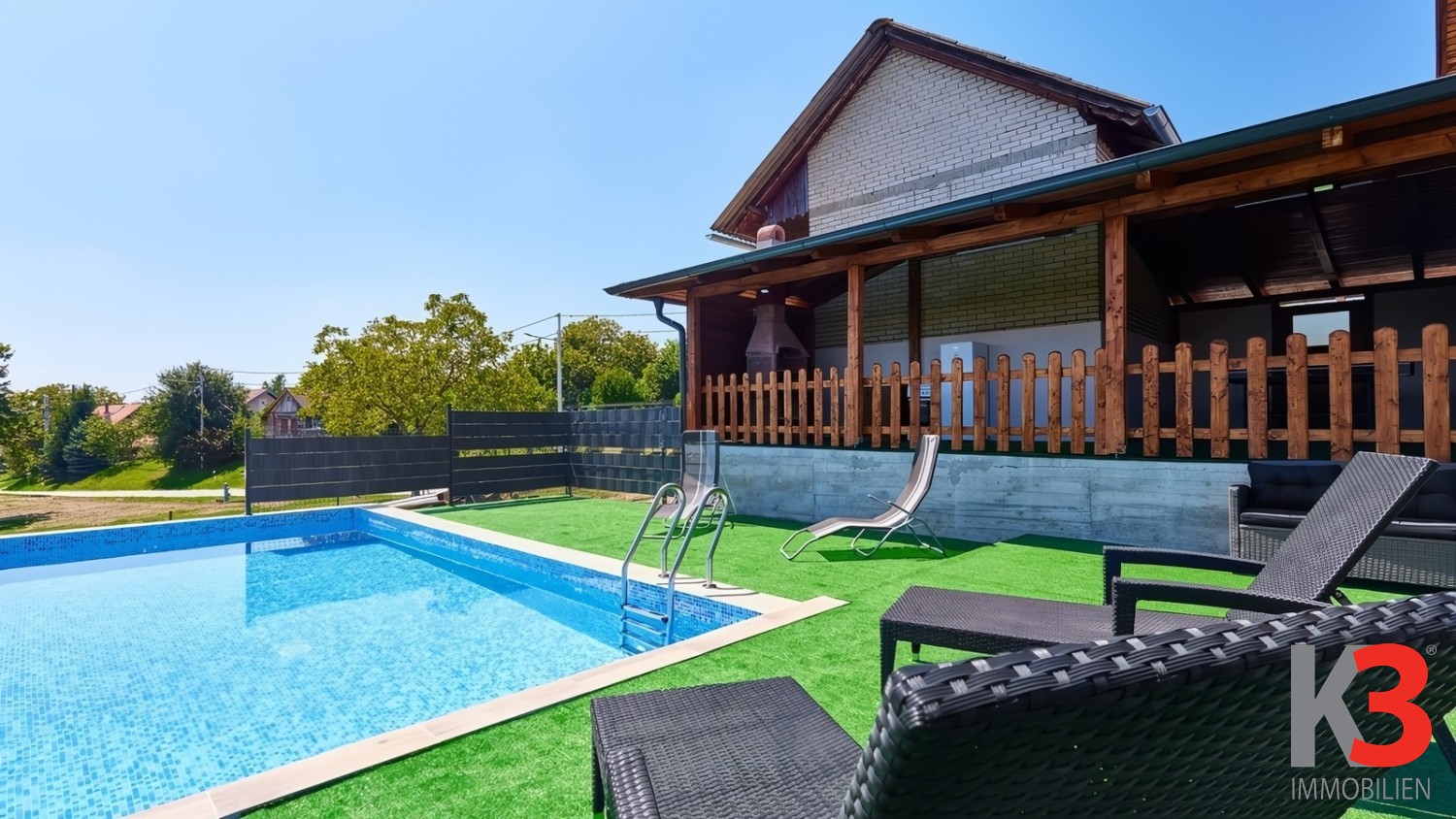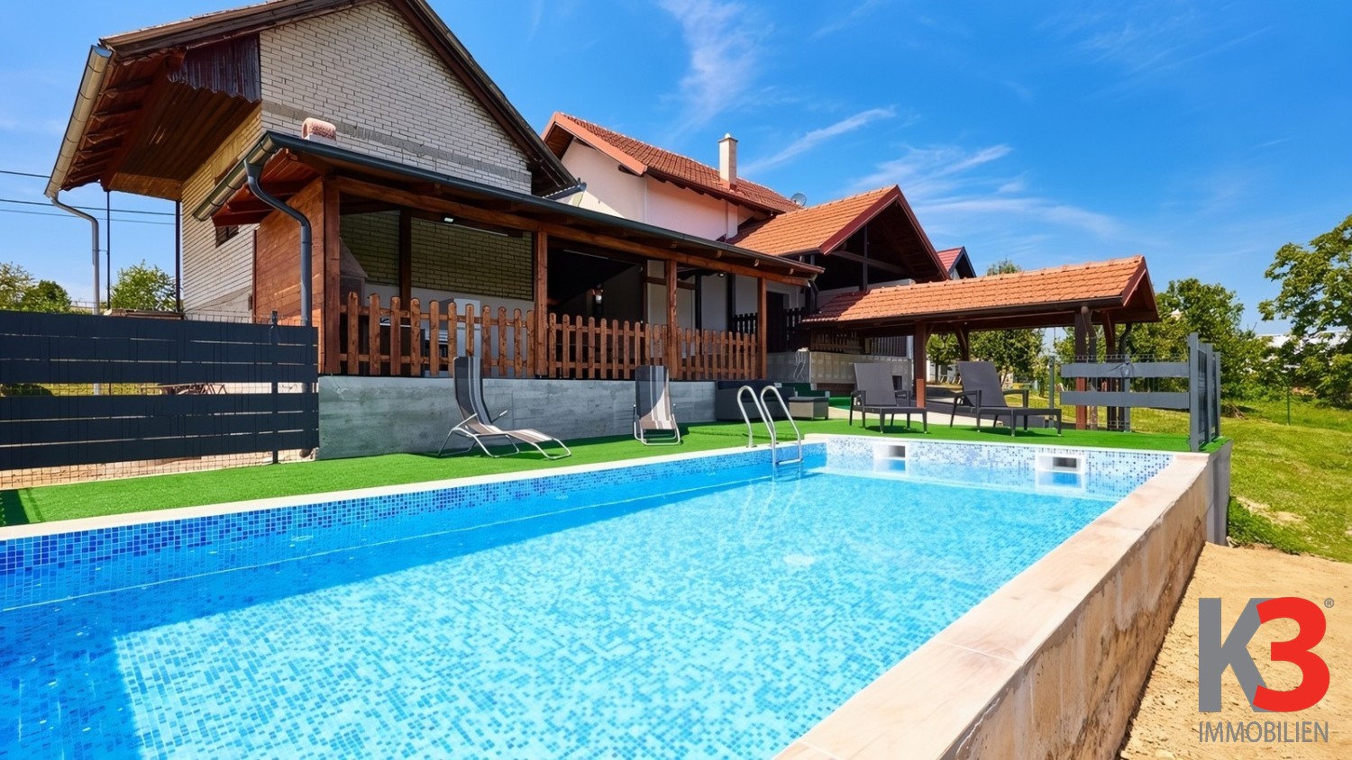 Das Anwesen verfügt über ein großes, gepflegtes Grundstück mit einer überdachten Terrasse, ausgestattet mit Grill und Whirlpool – ein idealer Ort zum Entspannen und geselligen Beisammensein.