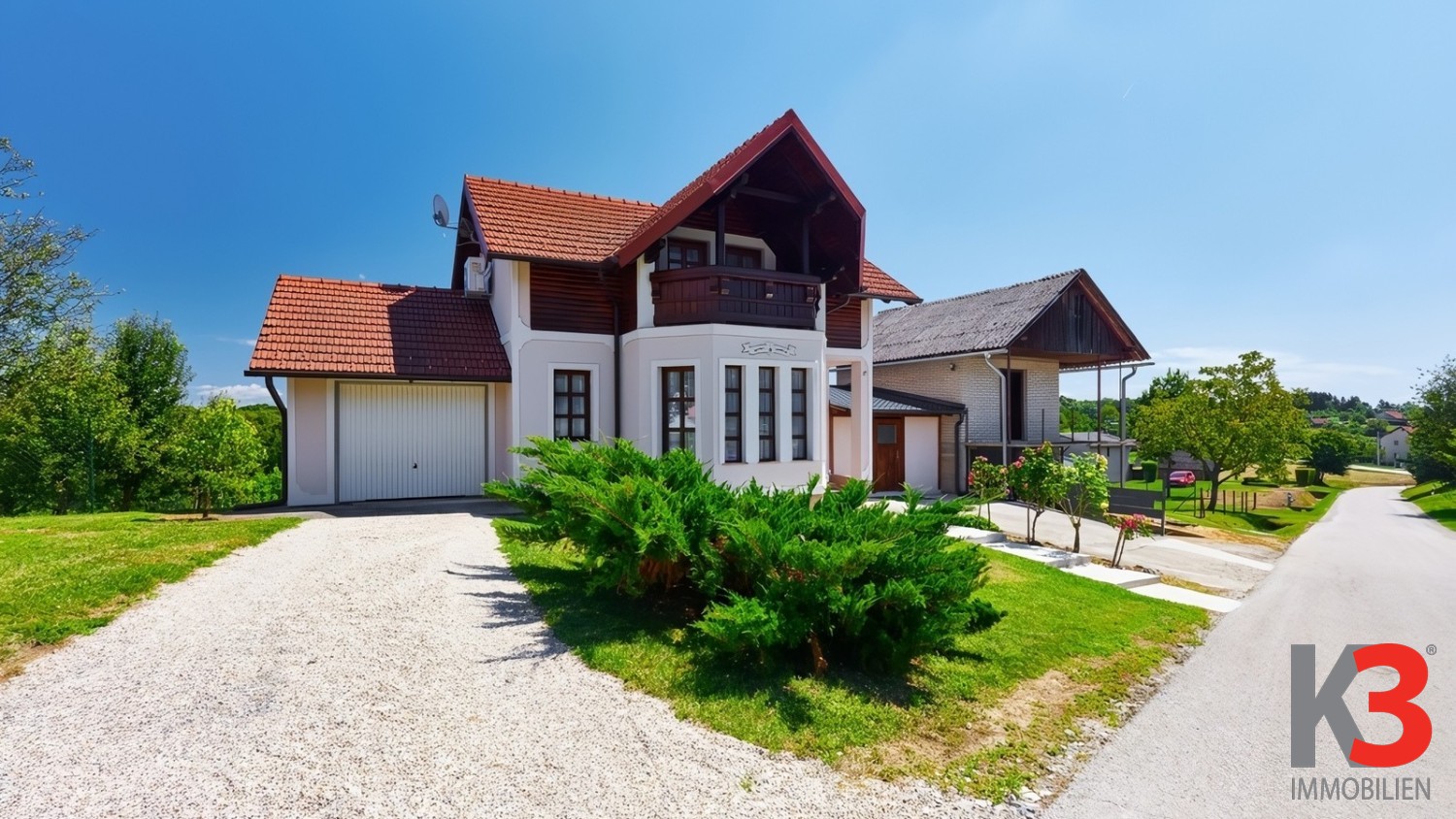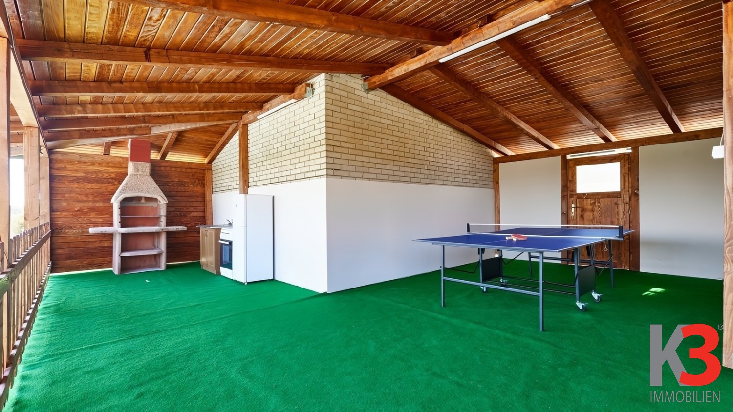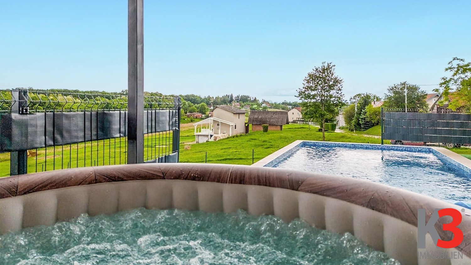 Das Anwesen verfügt über ein großes, gepflegtes Grundstück mit einer überdachten Terrasse, ausgestattet mit Grill und Whirlpool – ein idealer Ort zum Entspannen und geselligen Beisammensein.