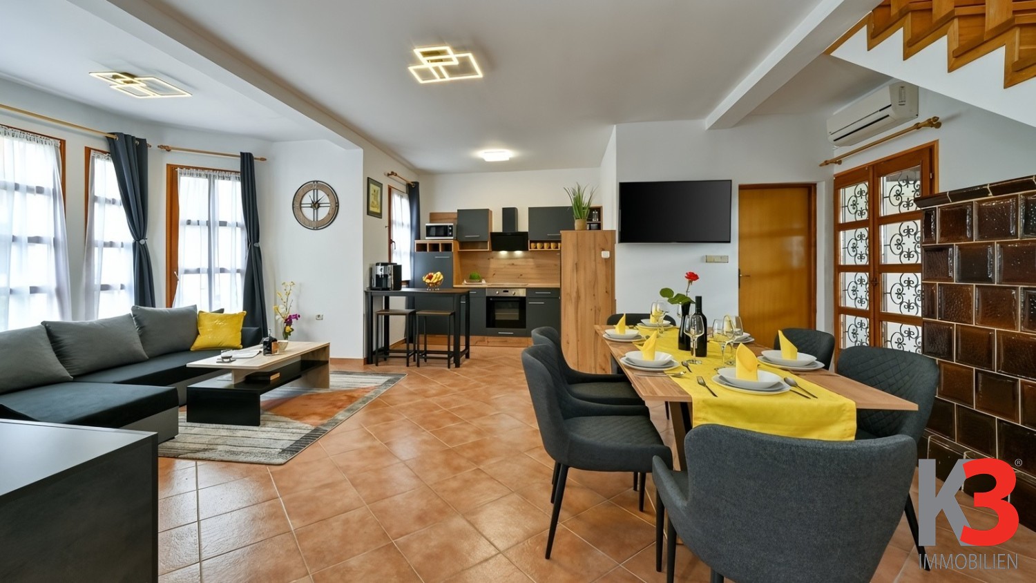 Im Erdgeschoss befinden sich ein großzügiges Wohnzimmer mit offener Küche und Essbereich sowie ein modernes Badezimmer.