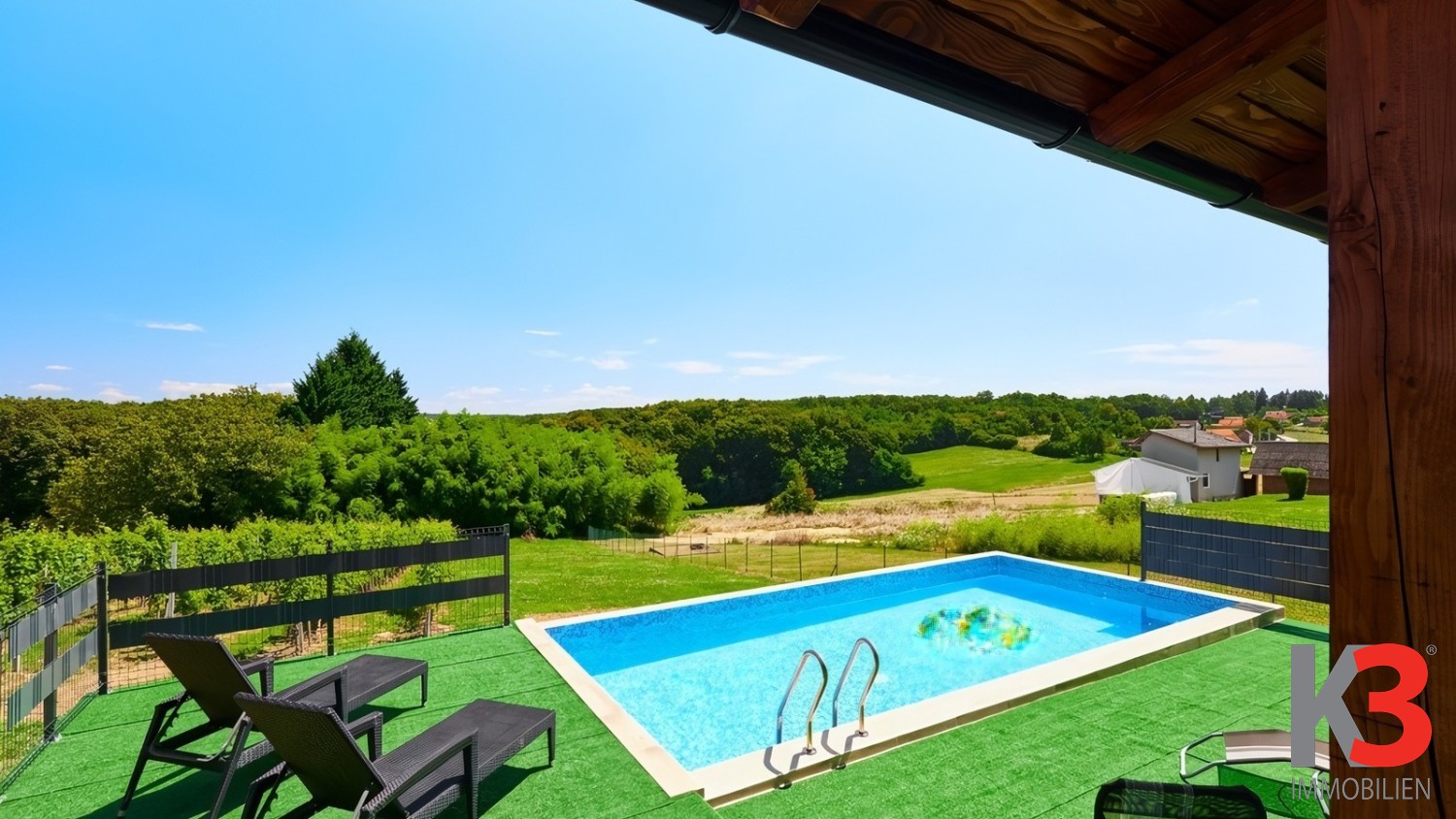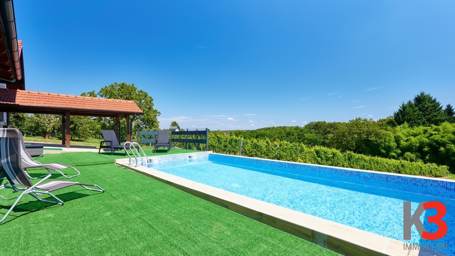Von der Terrasse aus gelangt man zum Swimmingpool, der einen herrlichen Blick auf den eigenen Weinberg bietet.
