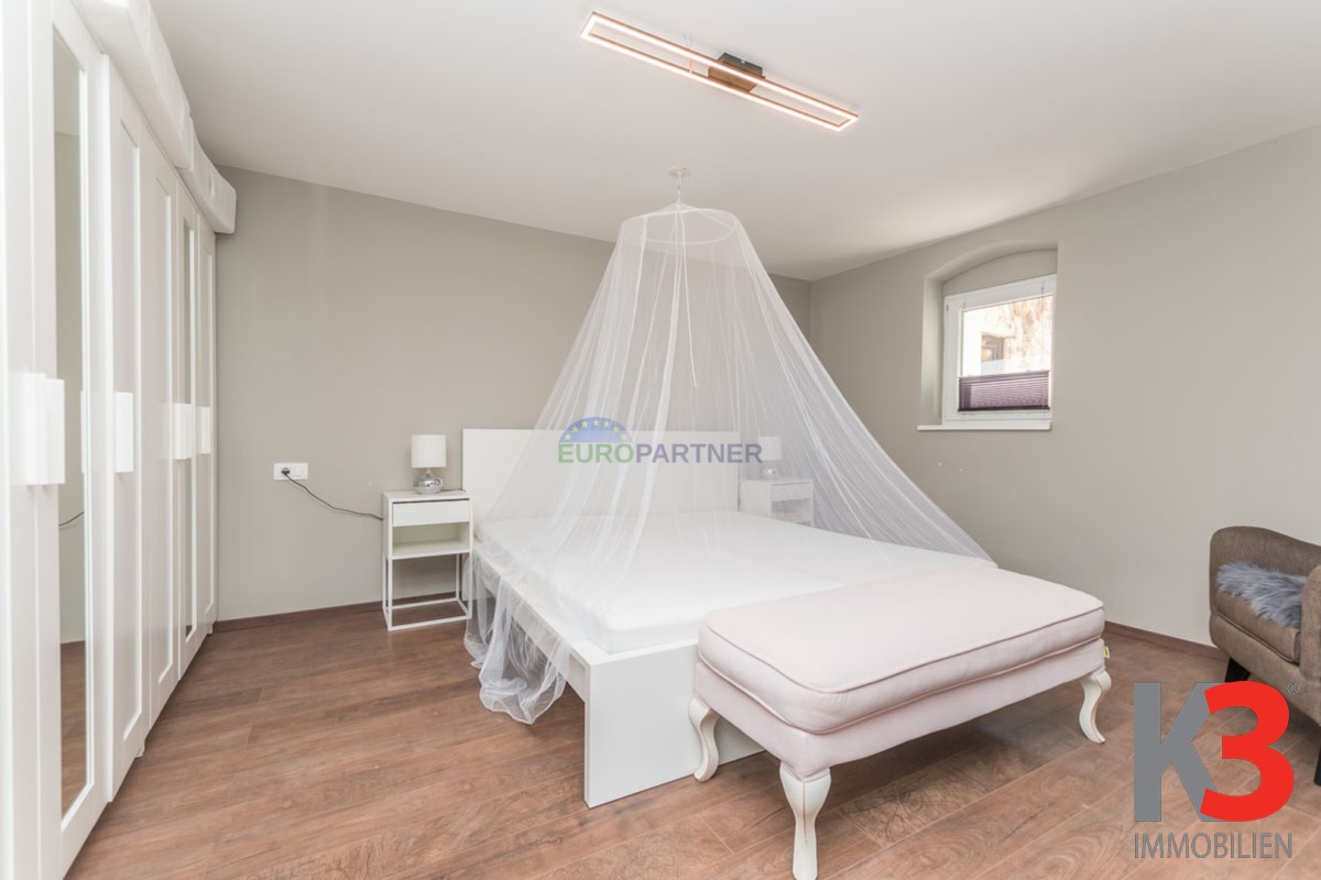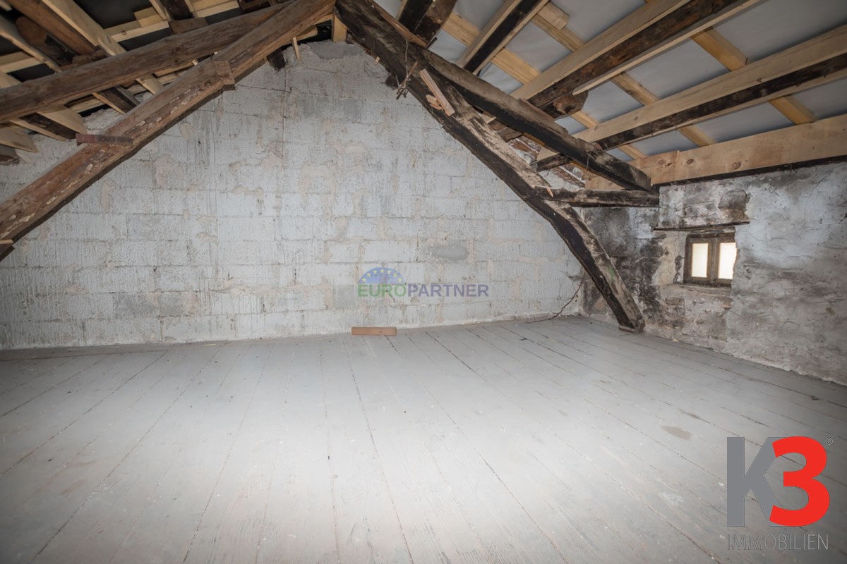 Darüber hinaus führt die Treppe zum hohen, mit Holzbalken verzierten Dachgeschoss. Von diesem Raum aus ist es möglich, ein Hauptschlafzimmer mit eigenem Bad zu schaffen.