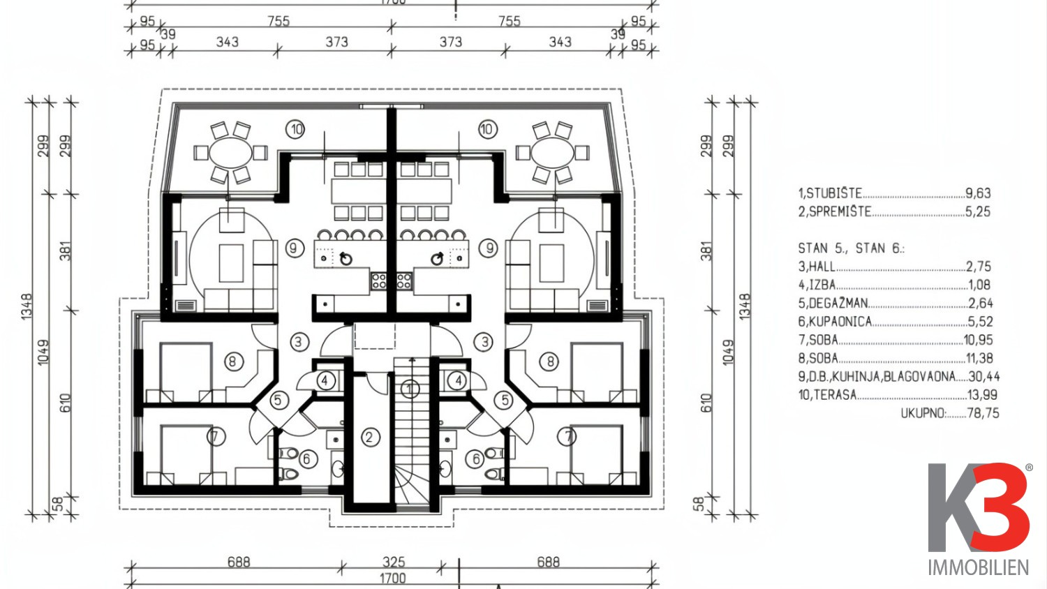 Die Wohnung hat eine Gesamtfläche von 78,75 m² und besteht aus: