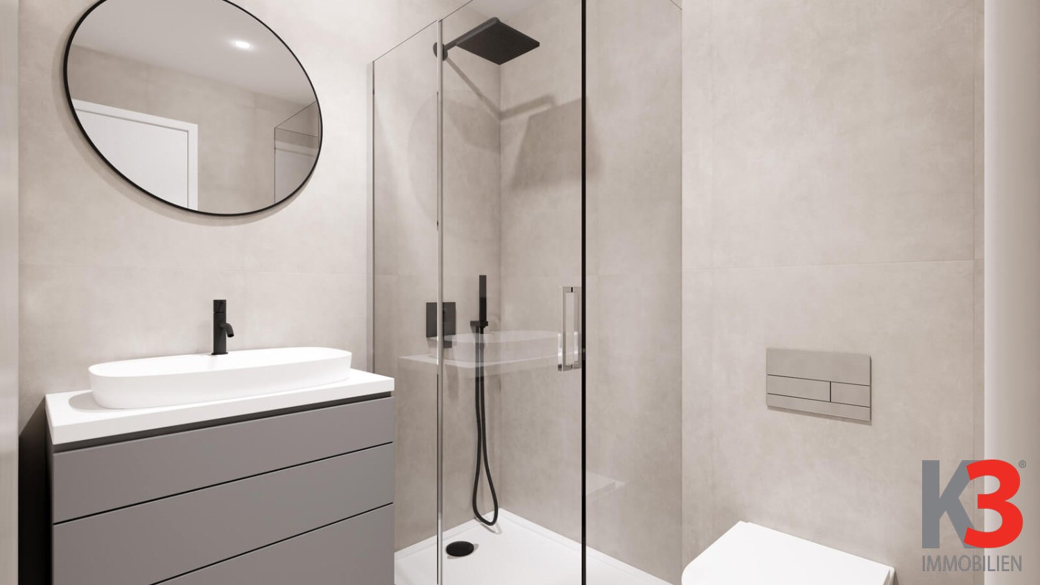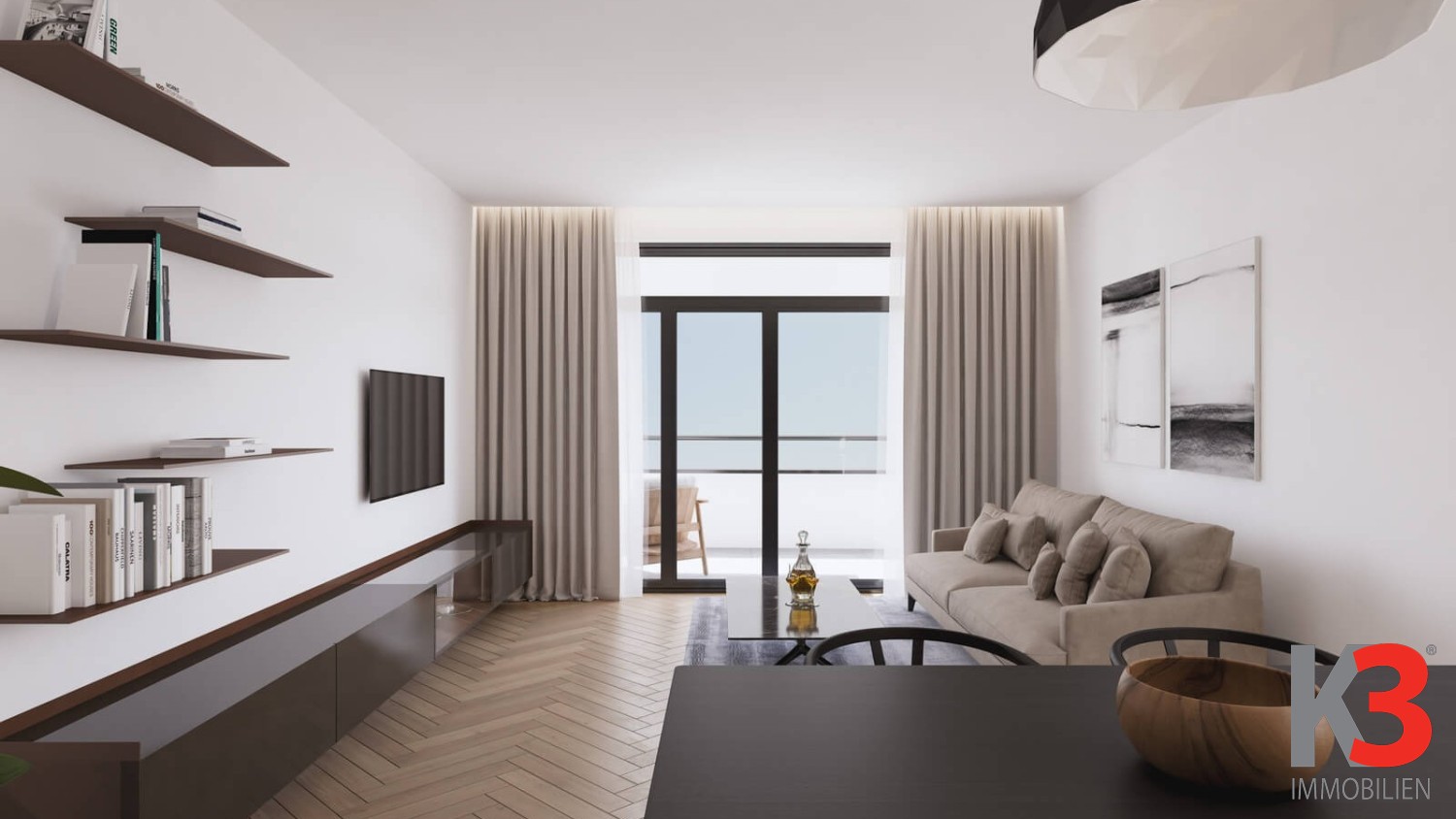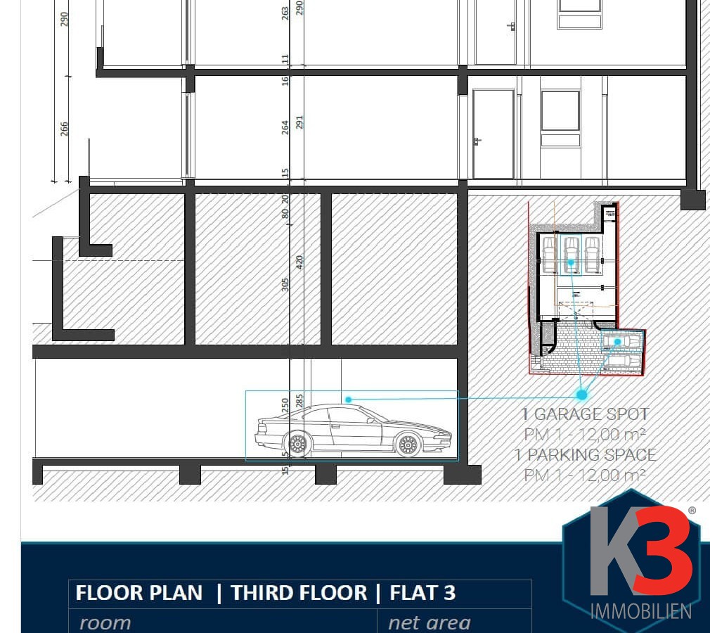 Die Wohnung befindet sich im 3. Stock zur Straßenseite hin, im Erdgeschoss auf der Rückseite. Sie hat 85 m² netto, 91 m² brutto, mit Eingangsbereich, 2 Schlafzimmern mit eigenen Badezimmern und einem geräumigen Wohnzimmer, das mit einer Küche verbunden ist und Zugang zu einem Balkon bietet. Ein Garagen- und ein Außenstellplatz sind inklusive. Innenaufnahmen sind Designvorschläge; die endgültige Gestaltung erfolgt nach den Wünschen des Käufers.