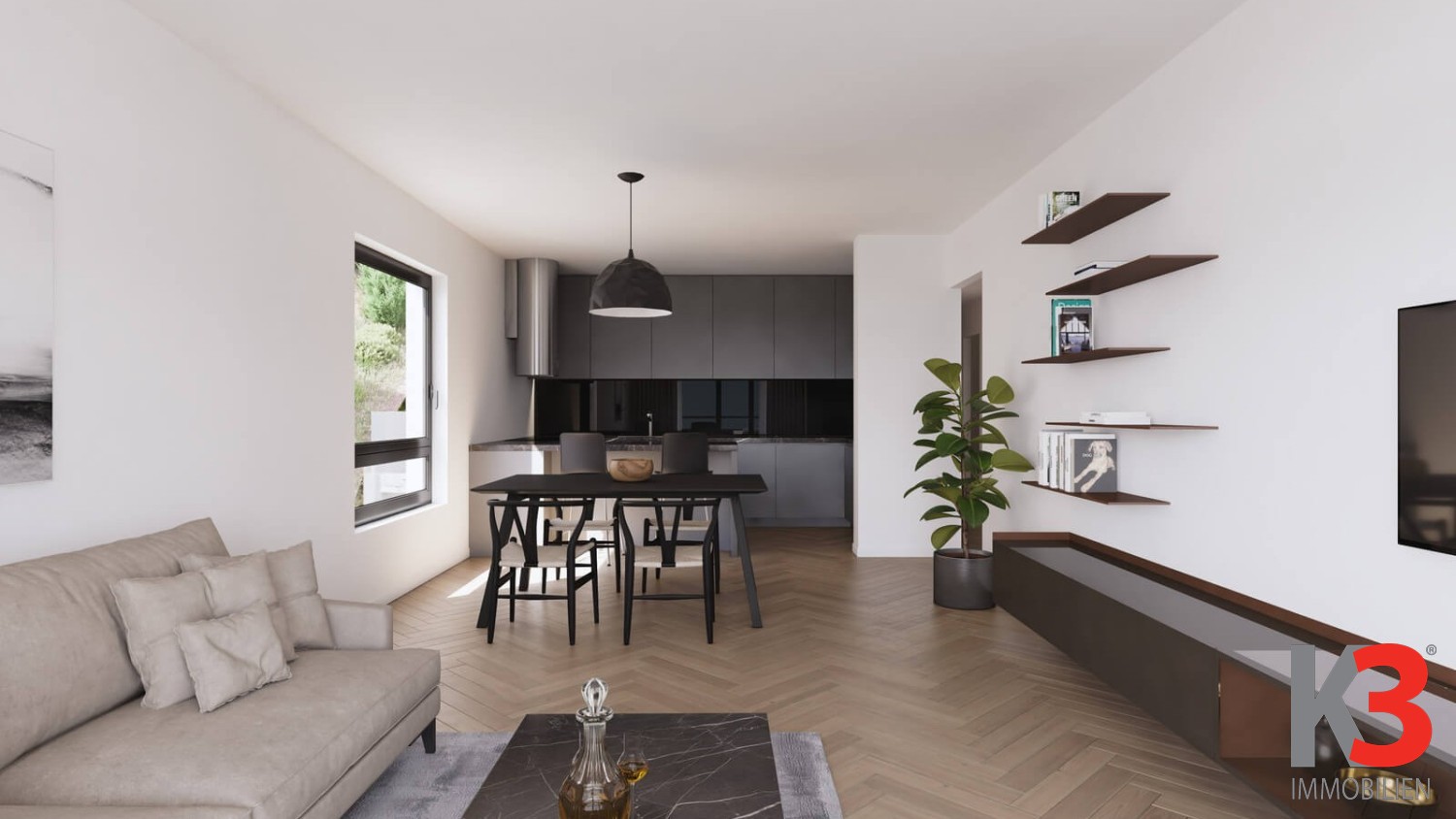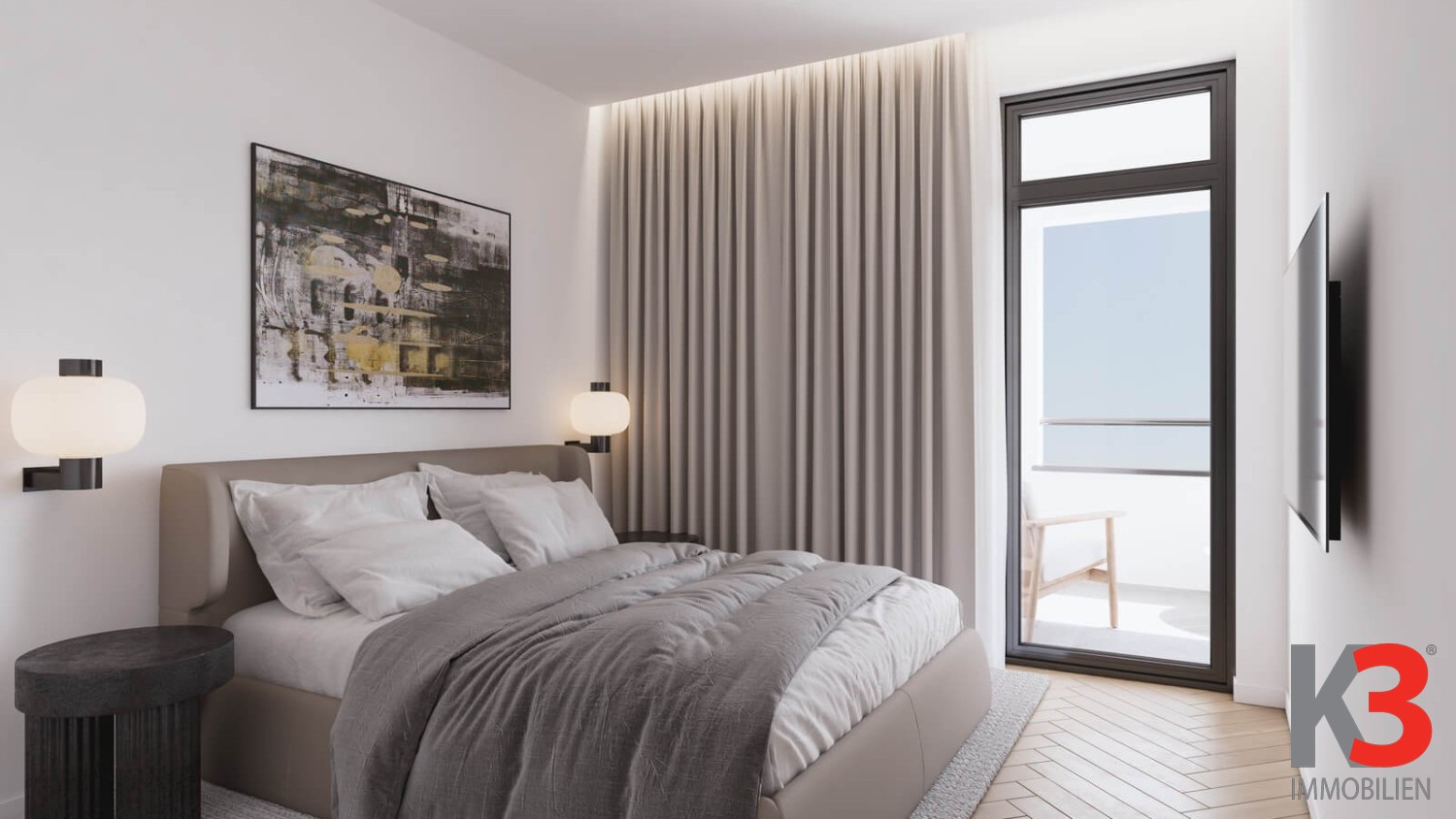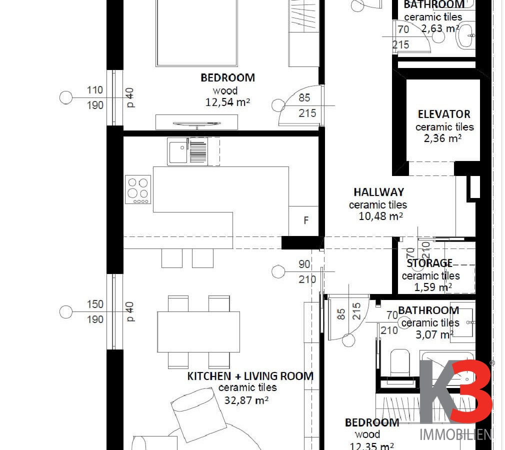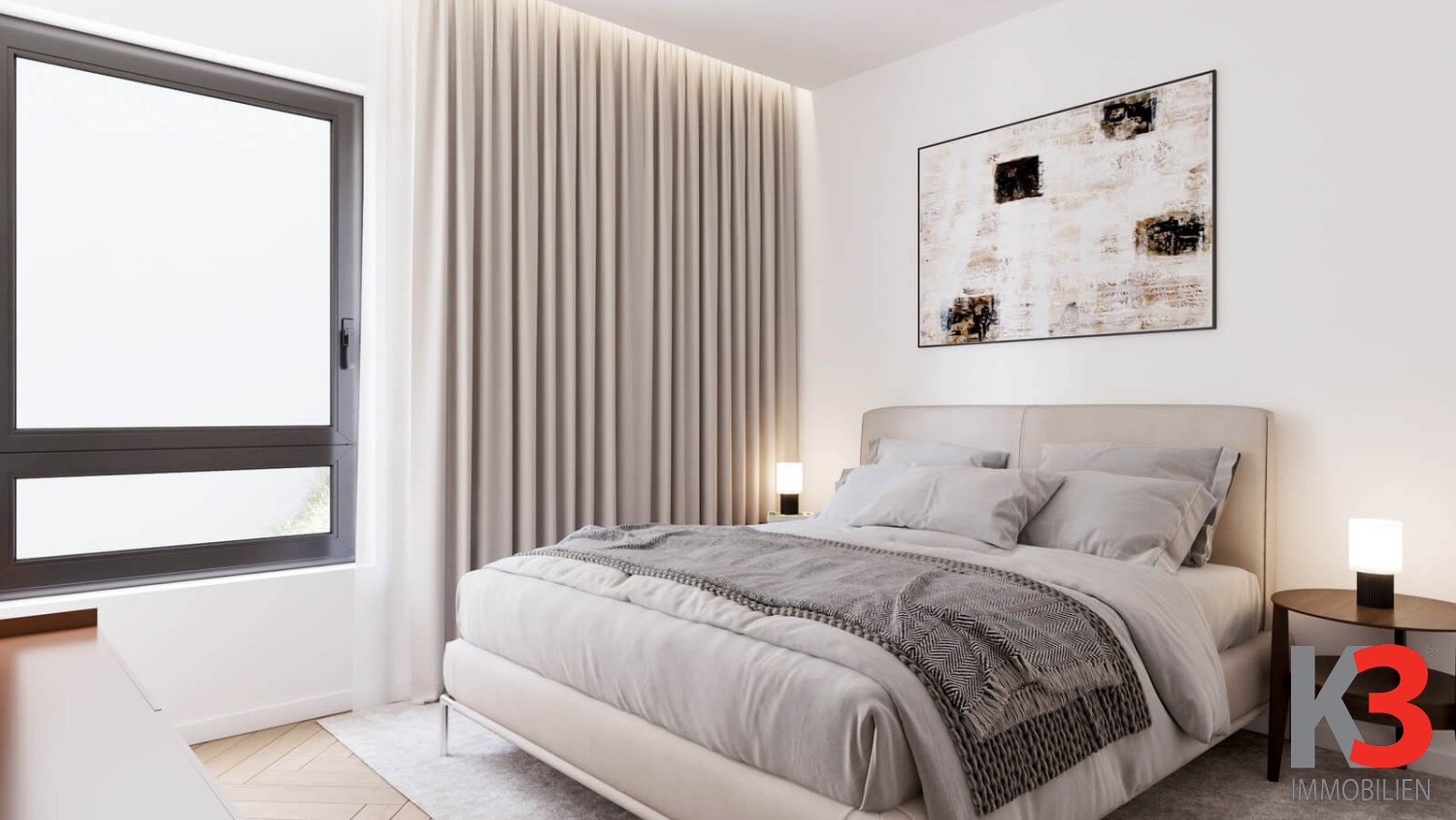 Die Wohnung befindet sich im 3. Stock zur Straßenseite hin, im Erdgeschoss auf der Rückseite. Sie hat 85 m² netto, 91 m² brutto, mit Eingangsbereich, 2 Schlafzimmern mit eigenen Badezimmern und einem geräumigen Wohnzimmer, das mit einer Küche verbunden ist und Zugang zu einem Balkon bietet. Ein Garagen- und ein Außenstellplatz sind inklusive. Innenaufnahmen sind Designvorschläge; die endgültige Gestaltung erfolgt nach den Wünschen des Käufers.