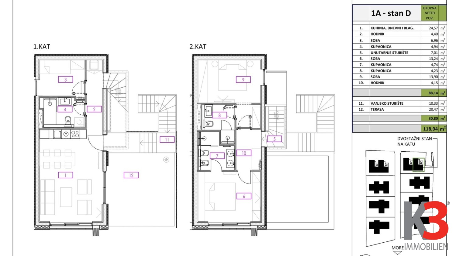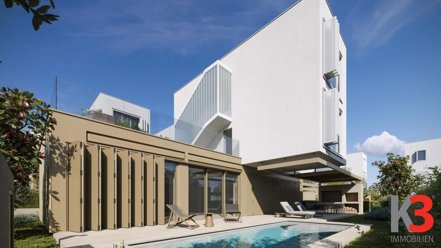 Die Wohnung besteht aus einem großzügigen Wohnzimmer mit Küche und Essbereich, drei geräumigen Schlafzimmern, drei Bädern, einer Terrasse und einem Flur. Ein Außenstellplatz gehört ebenfalls dazu.