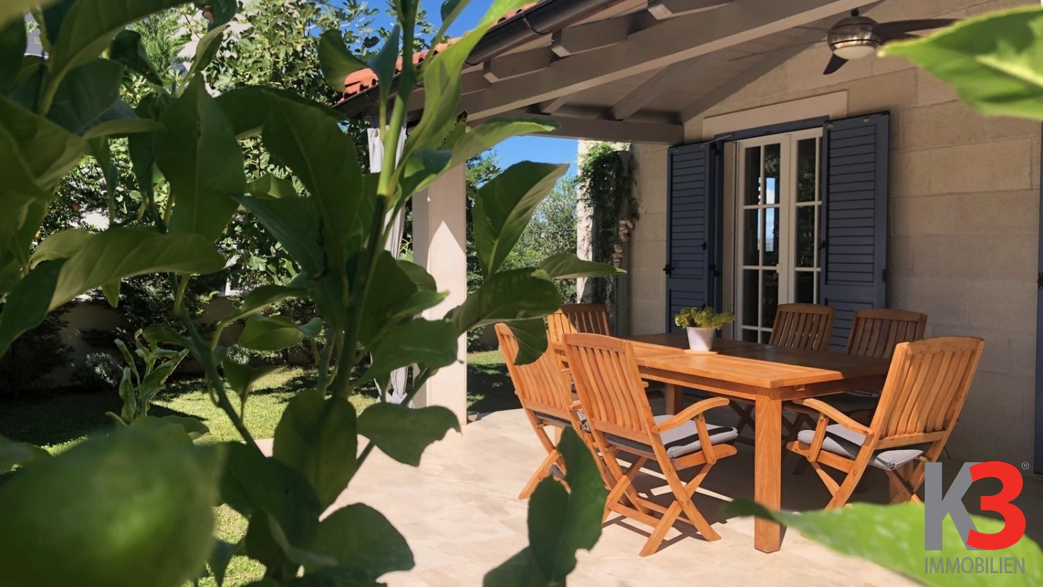 -überdachter Bereich mit Grill, Bartisch und Stühlen