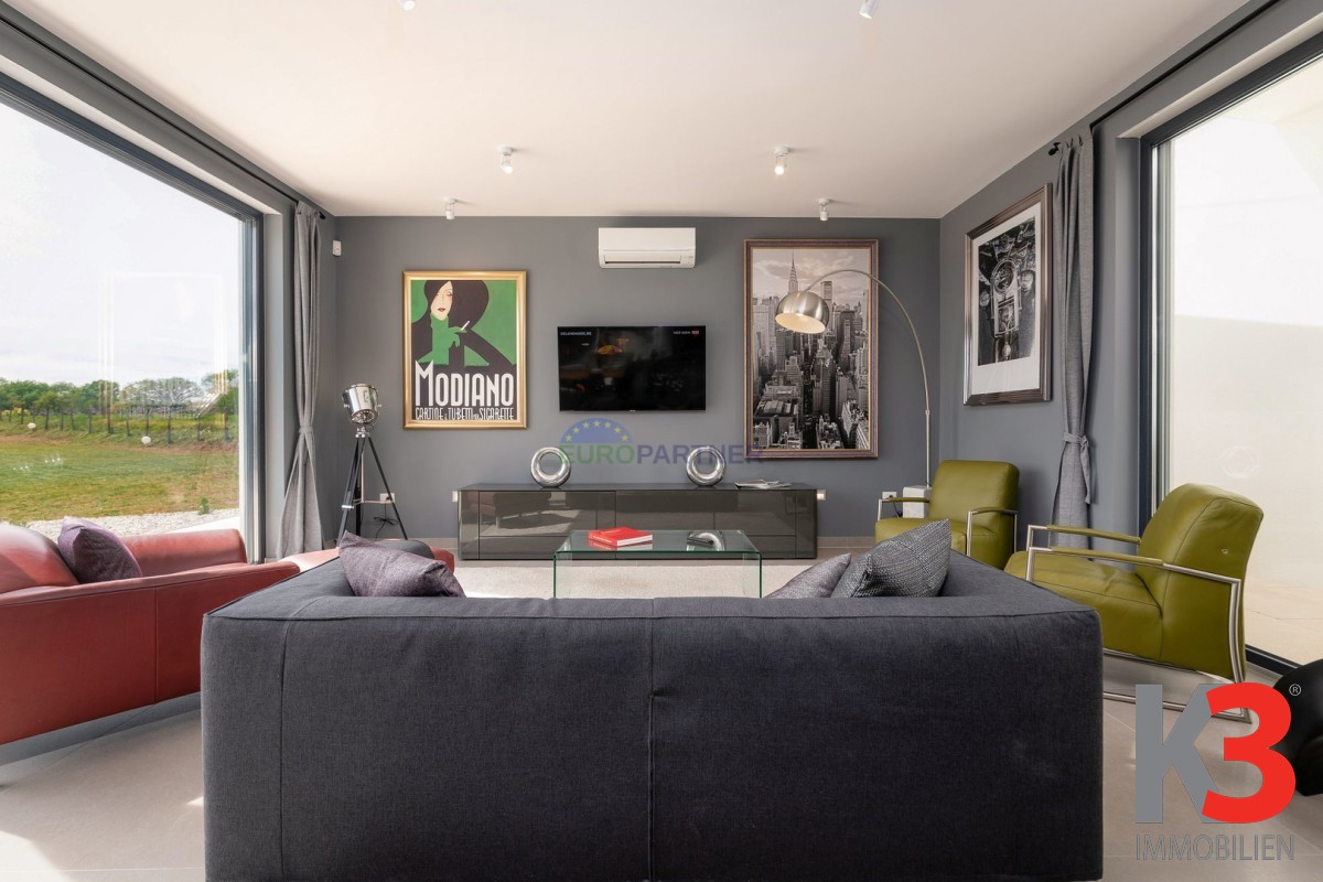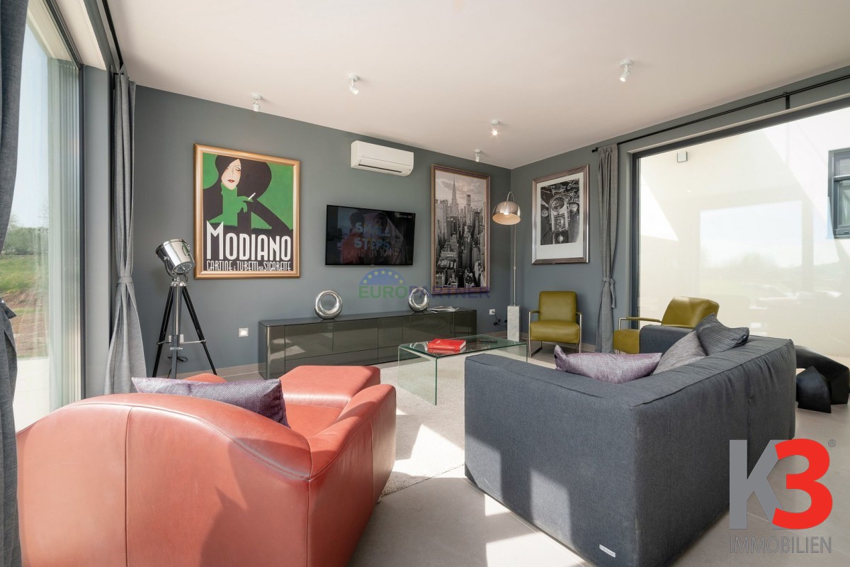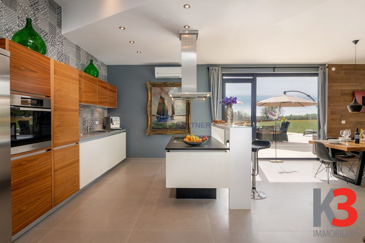 Das Design der Villa besticht durch große Fenster im gesamten Gebäude, die viel natürliches Licht in die Innenräume lassen und atemberaubende Ausblicke auf die umliegenden Felder und Wälder bieten. Die geräumigen Wohnbereiche verschmelzen nahtlos mit der Außenwelt und bringen die Schönheit der Natur direkt in Ihr Zuhause.