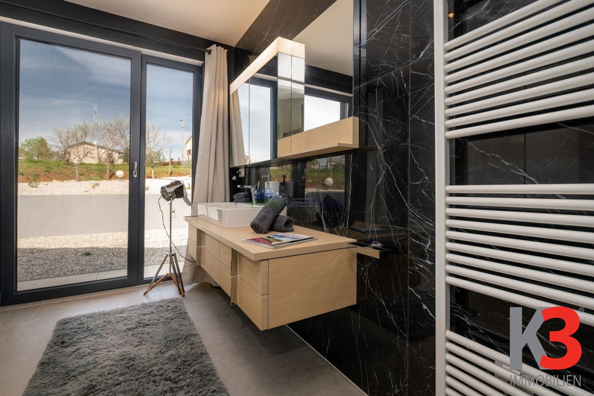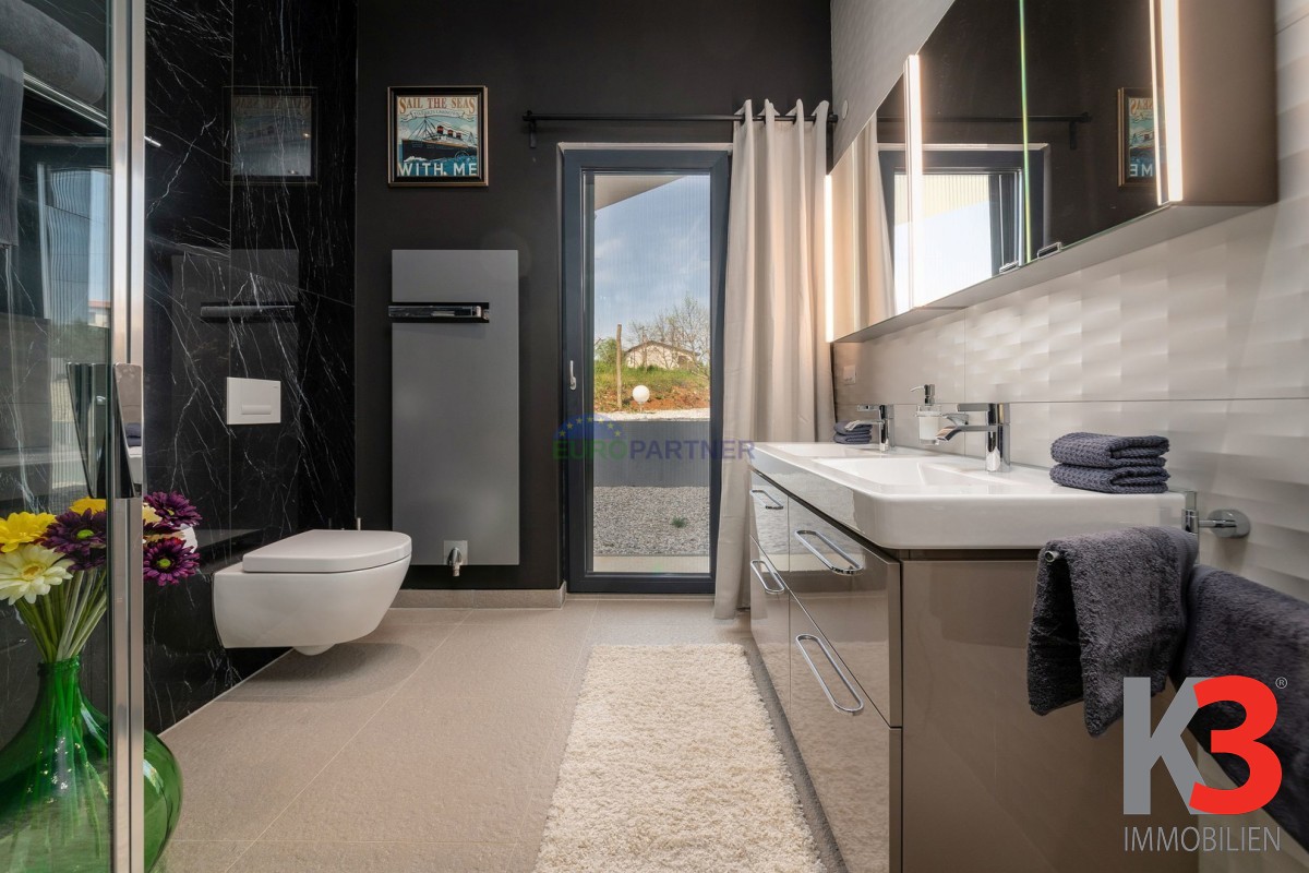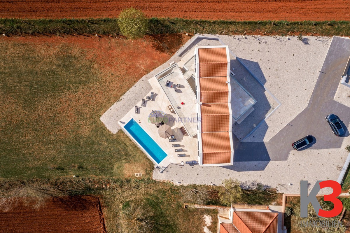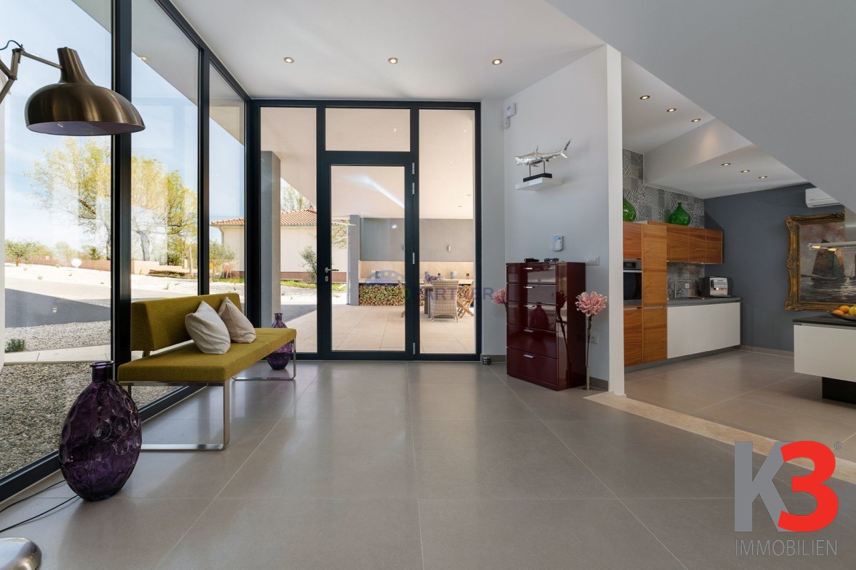 Das Design der Villa besticht durch große Fenster im gesamten Gebäude, die viel natürliches Licht in die Innenräume lassen und atemberaubende Ausblicke auf die umliegenden Felder und Wälder bieten. Die geräumigen Wohnbereiche verschmelzen nahtlos mit der Außenwelt und bringen die Schönheit der Natur direkt in Ihr Zuhause.