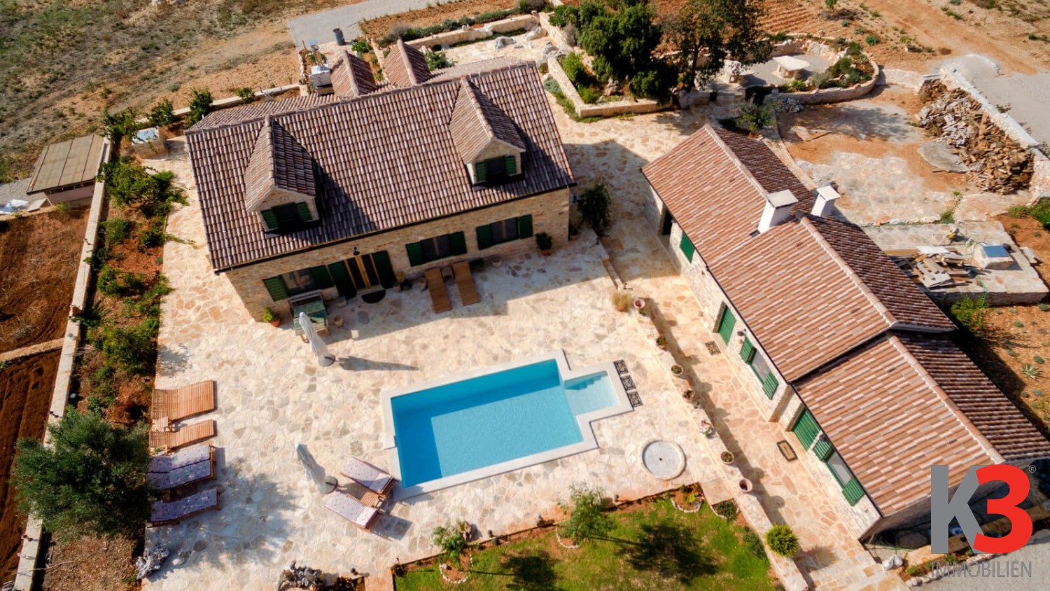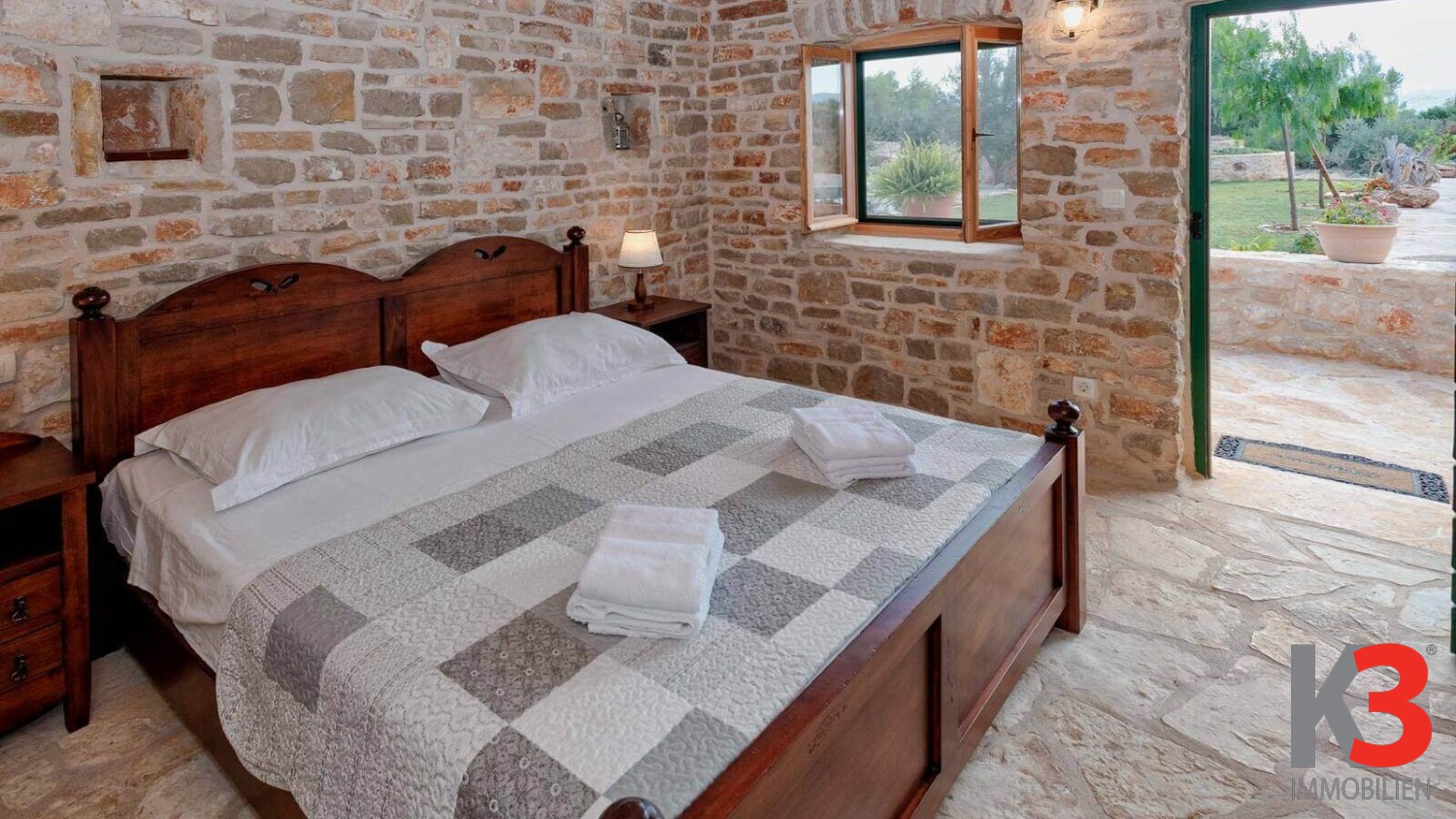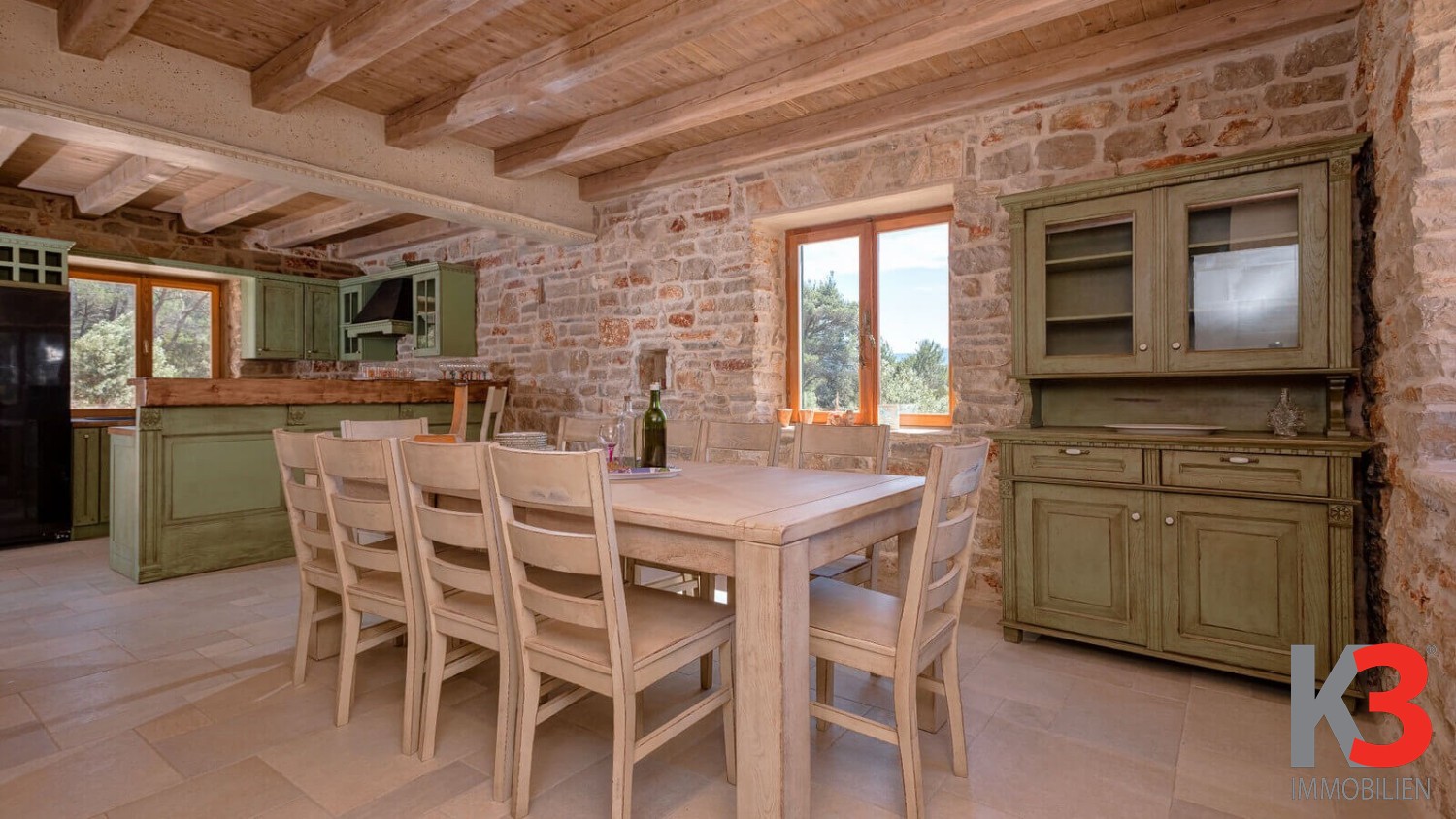 Luxusvilla mit Pool zum Verkauf in Stari Grad auf der Insel Hvar. Hvar ist bekannt als die sonnigste Insel Kroatiens und zählt auch zu den beliebtesten Inseln in Dalmatien. Diese Villa befindet sich auf einem großen Anwesen von 8.500 m2, was den Eigentümern Ruhe und Privatsphäre garantiert. Diese Luxusvilla wurde 2017 im traditionellen dalmatinischen Stil aus Stein mit schrägem Ziegeldach erbaut. An allen Fenstern befinden sich charmante grüne Holzläden, die der Villa zusätzlichen Charme und Wärme verleihen. Die Villa verfügt über ein geräumiges Wohnzimmer, eine voll ausgestattete Küche und 5 Schlafzimmer mit eigenen Badezimmern. Das Interieur der Villa ist wie das Exterieur im traditionellen Stil gehalten, mit dominierenden Steinwänden und rustikalen Holzmöbeln. Auf dem Anwesen befindet sich ein Außenpool und ausreichend Platz zum Parken.