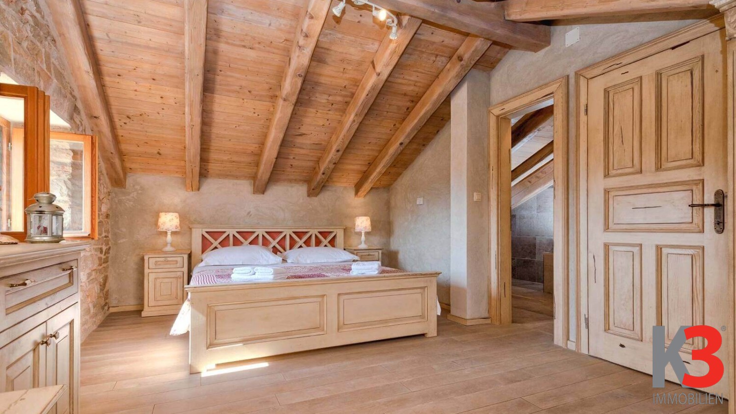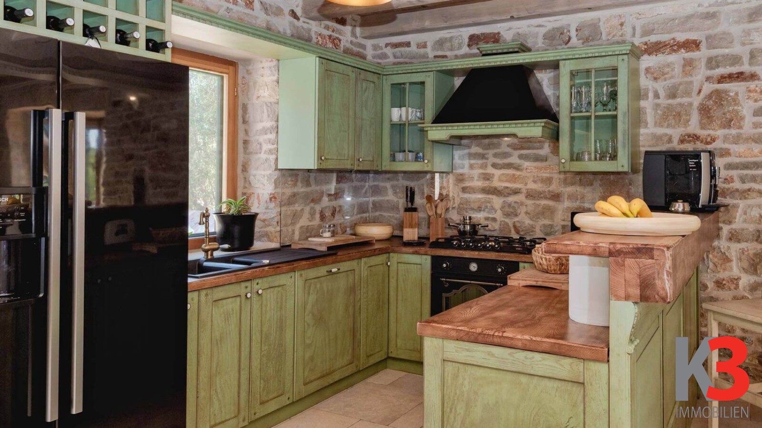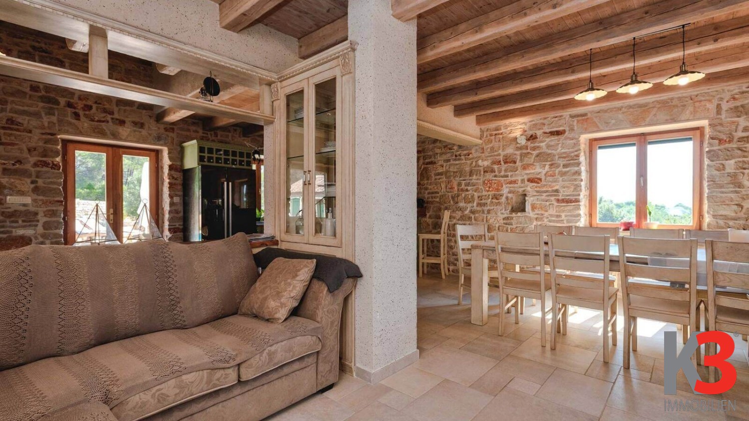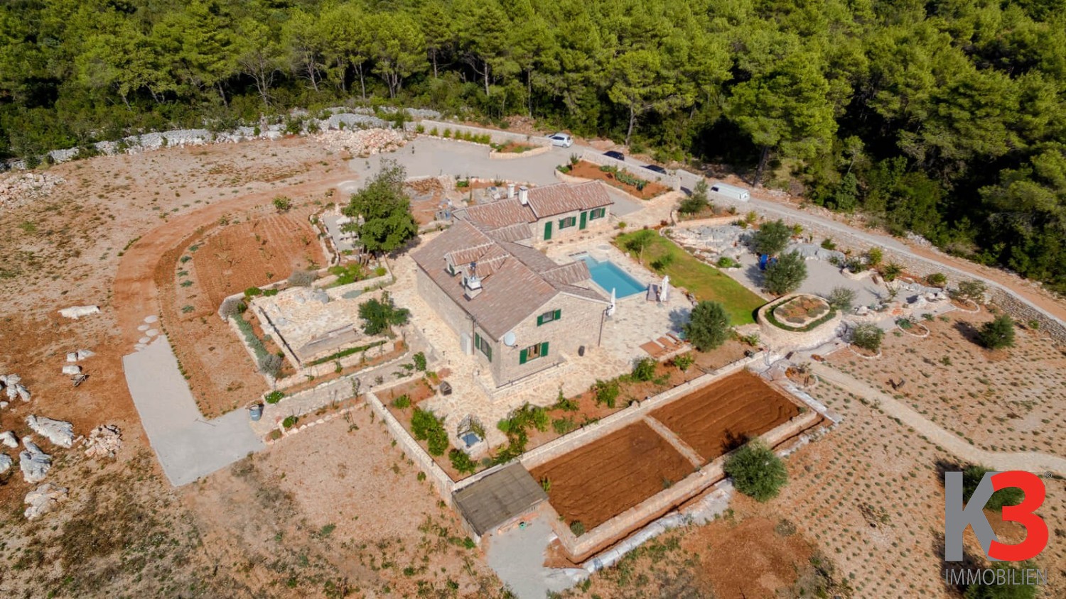Luxusvilla mit Pool zum Verkauf in Stari Grad auf der Insel Hvar. Hvar ist bekannt als die sonnigste Insel Kroatiens und zählt auch zu den beliebtesten Inseln in Dalmatien. Diese Villa befindet sich auf einem großen Anwesen von 8.500 m2, was den Eigentümern Ruhe und Privatsphäre garantiert. Diese Luxusvilla wurde 2017 im traditionellen dalmatinischen Stil aus Stein mit schrägem Ziegeldach erbaut. An allen Fenstern befinden sich charmante grüne Holzläden, die der Villa zusätzlichen Charme und Wärme verleihen. Die Villa verfügt über ein geräumiges Wohnzimmer, eine voll ausgestattete Küche und 5 Schlafzimmer mit eigenen Badezimmern. Das Interieur der Villa ist wie das Exterieur im traditionellen Stil gehalten, mit dominierenden Steinwänden und rustikalen Holzmöbeln. Auf dem Anwesen befindet sich ein Außenpool und ausreichend Platz zum Parken.