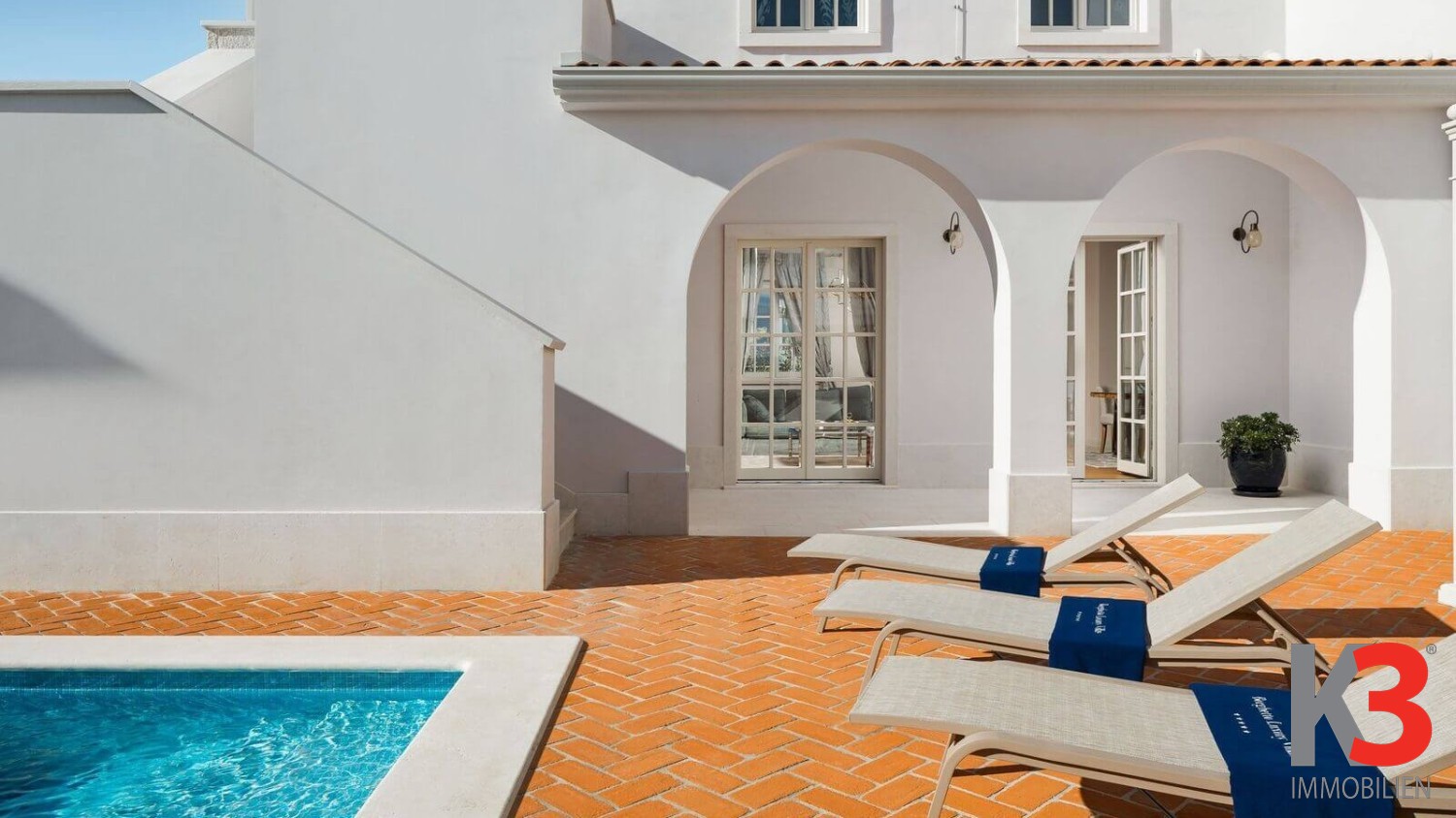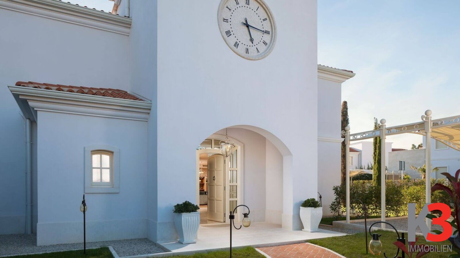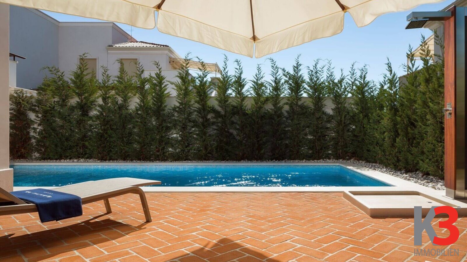 Die Villa wurde 2018 erbaut, hat eine Fläche von 287 m² und erstreckt sich über zwei Etagen, wobei innen und außen ein klassisch elegantes Design vorherrscht. Im Erdgeschoss befindet sich eine voll ausgestattete Küche und ein geräumiges Wohnzimmer, von dem aus man auf die überdachte Terrasse gelangt, wo sich ein Grill und ein großer Esstisch befinden. Vor der Terrasse liegt der Außenpool, der von Sonnenliegen umgeben ist. Neben dem Wohnzimmer verfügt die Villa über 4 Schlafzimmer, jedes mit eigenem Badezimmer. Diese Luxusvilla, wie auch die anderen Villen im Komplex, wird derzeit als Ferienunterkunft genutzt und bietet eine gute Investitionsmöglichkeit im Istrien-Tourismus.