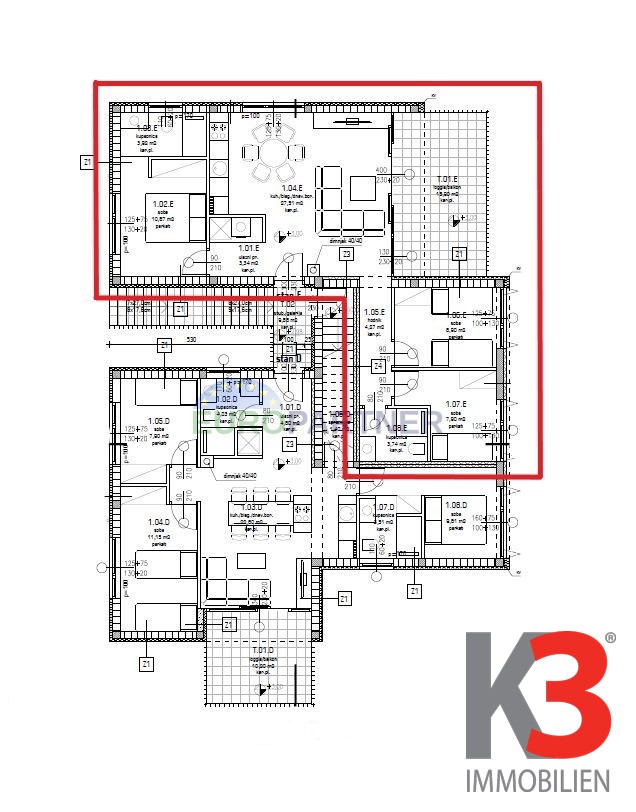 Die Wohnung wurde sorgfältig gestaltet, um maximalen Komfort und optimale Raumnutzung zu gewährleisten. Sie besteht aus einem geräumigen Wohnzimmer mit offener Küche und Essbereich, drei Schlafzimmern, zwei modernen Badezimmern und einer beeindruckenden Dachterrasse von 62 m2. Die Terrasse ist bereits mit Strom- und Wasseranschlüssen versehen, sodass der zukünftige Eigentümer nach seinen Wünschen eine Sommerküche, einen Whirlpool oder eine Lounge-Ecke einrichten kann.