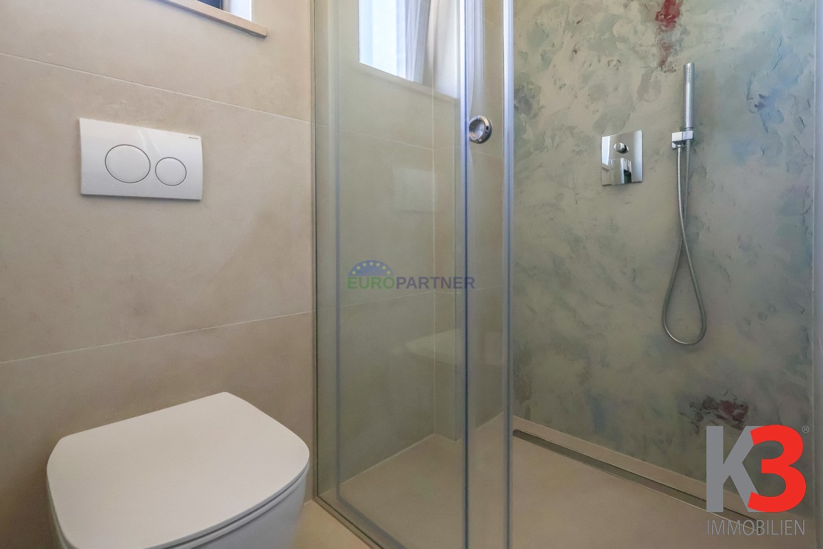 Für die Verbindung der Etagen gibt es eine Innentreppe mit Glasgeländern, die den Raum optisch vergrößern und ins Obergeschoss führen, wo sich zwei Schlafzimmer mit eigenen Bädern befinden – eines davon mit Zugang zur Terrasse. Weiter geht es ins zweite Obergeschoss, wo sich ein weiteres Schlafzimmer mit Bad und Zugang zu einer großen Außenterrasse mit Meerblick befindet.