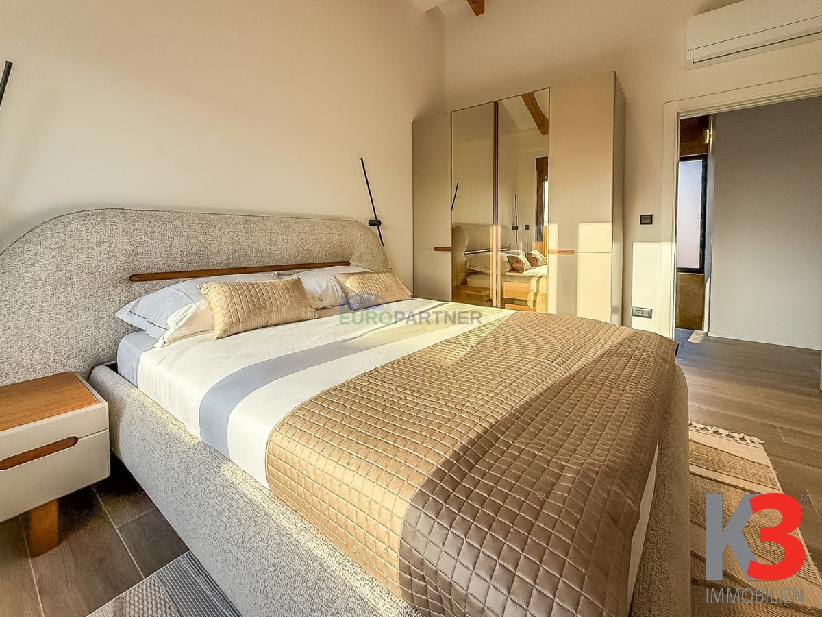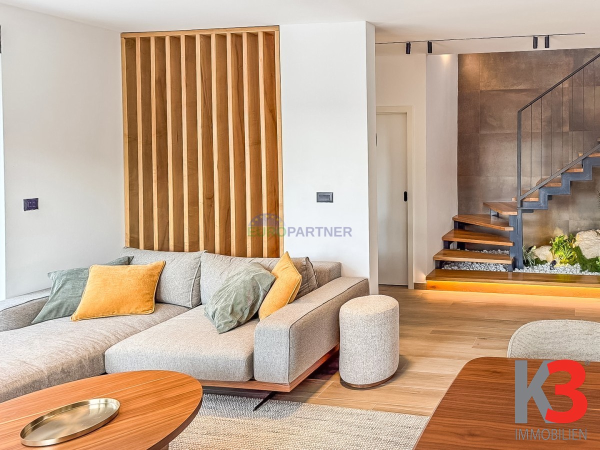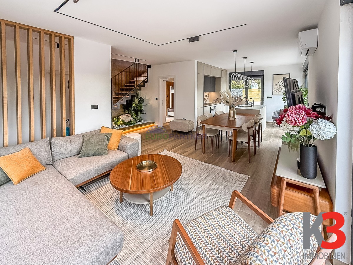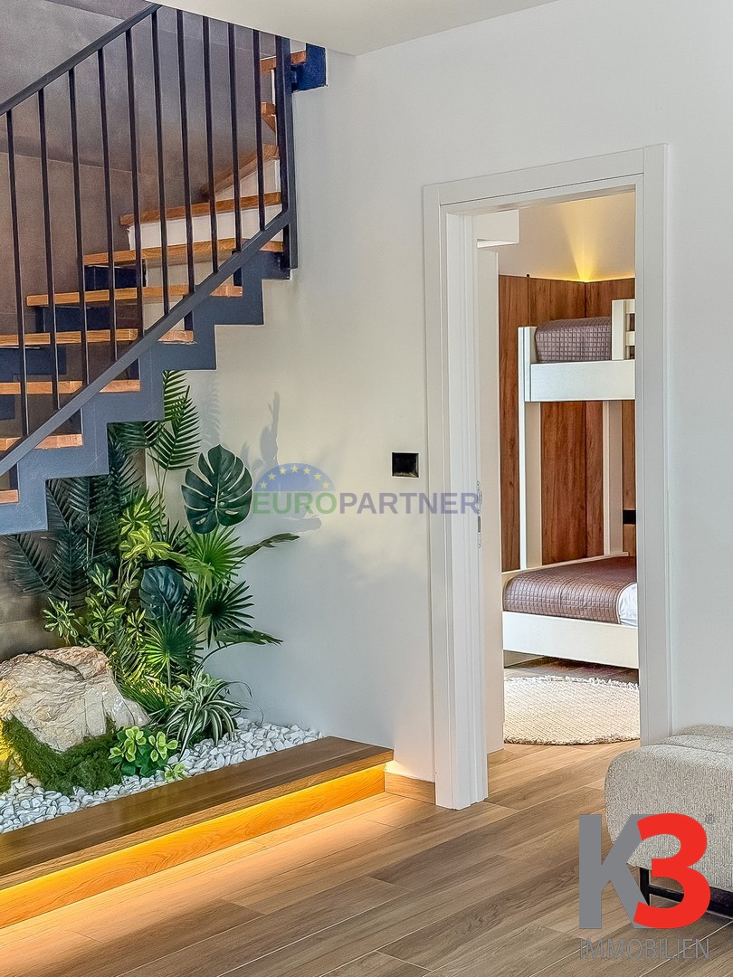 Im Obergeschoss befinden sich zwei komfortable Schlafzimmer, jeweils mit eigenem Bad, ein zusätzlicher Abstellraum und eine geräumige Terrasse, die zum Entspannen einlädt. Das Haus ist mit sorgfältig ausgewählten Designermöbeln ausgestattet, die die Eleganz und den modernen Charakter der Räume unterstreichen.